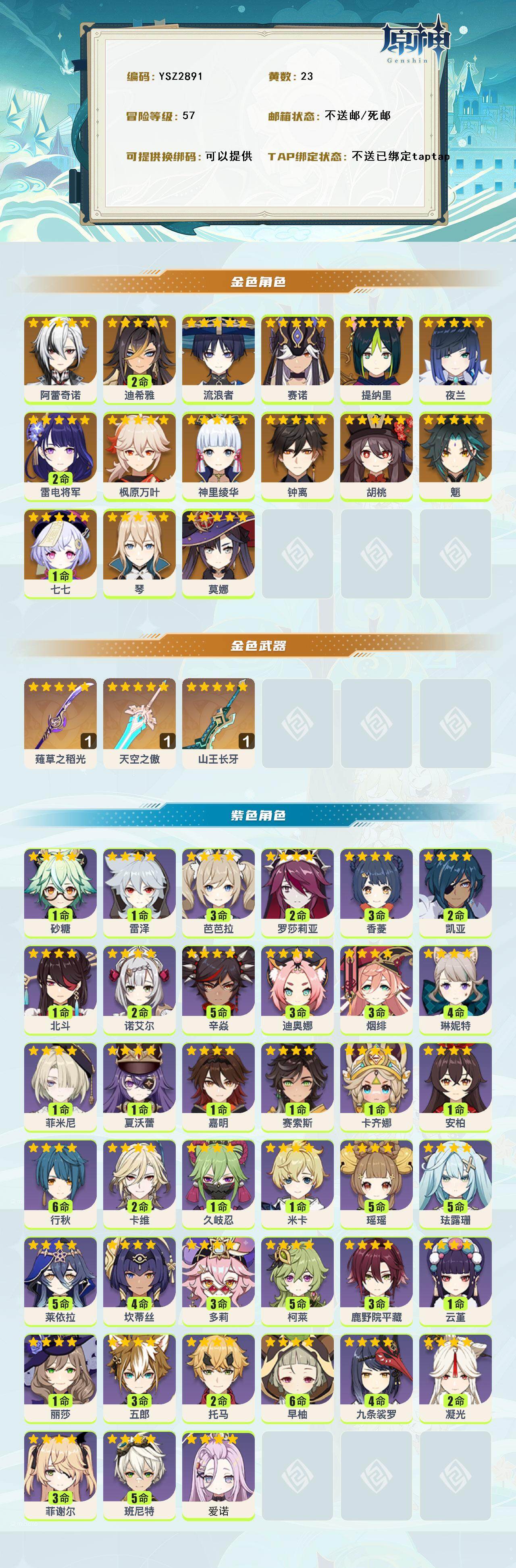 【YSZ2891】57级/23黄/女主/15个五星角色/3个五星武器/阿蕾奇诺/2命迪希雅/流浪者/赛诺/提纳里/夜兰/2命雷电将军/神里绫华/枫原万叶/胡桃/魈/钟离/琴/莫娜/1命七七/山王长牙/薙草之稻光/天空之傲/0命爱诺/卡齐娜/赛索斯/嘉明/1命夏沃蕾/1命菲米尼/4命琳妮特/2命卡维/1命米卡/5命瑶瑶/5命珐露珊/5命莱依拉/4命坎蒂丝/3命多莉/5命柯莱/3命鹿野院平藏/1命久岐忍/1命云堇/3命五郎/2命托马/4命九条裟罗/满命早柚/3命烟绯/2命罗莎莉亚/5命辛焱/3命迪奥
