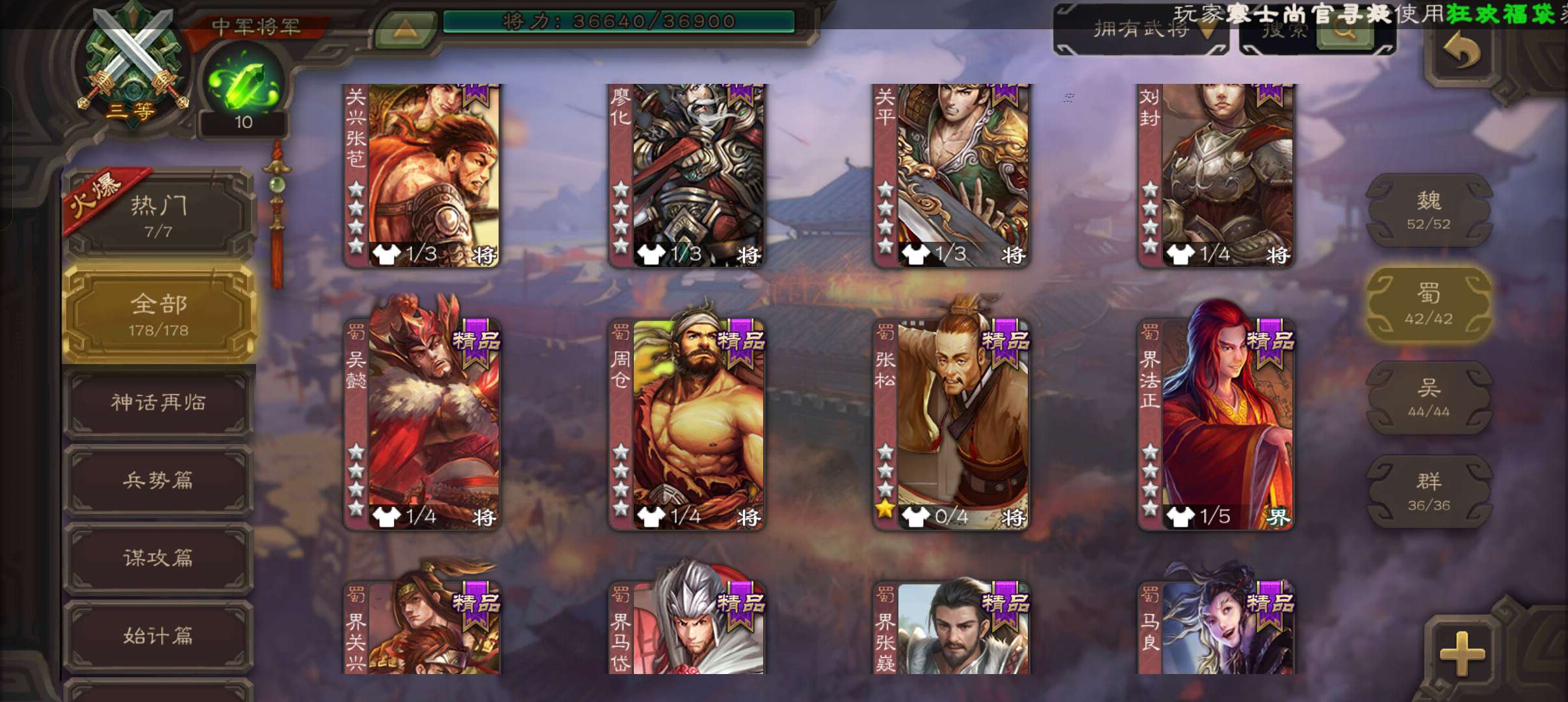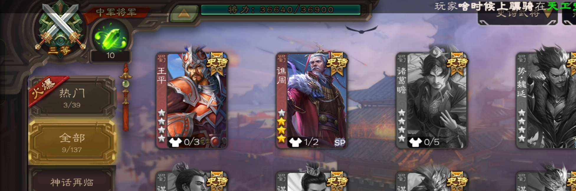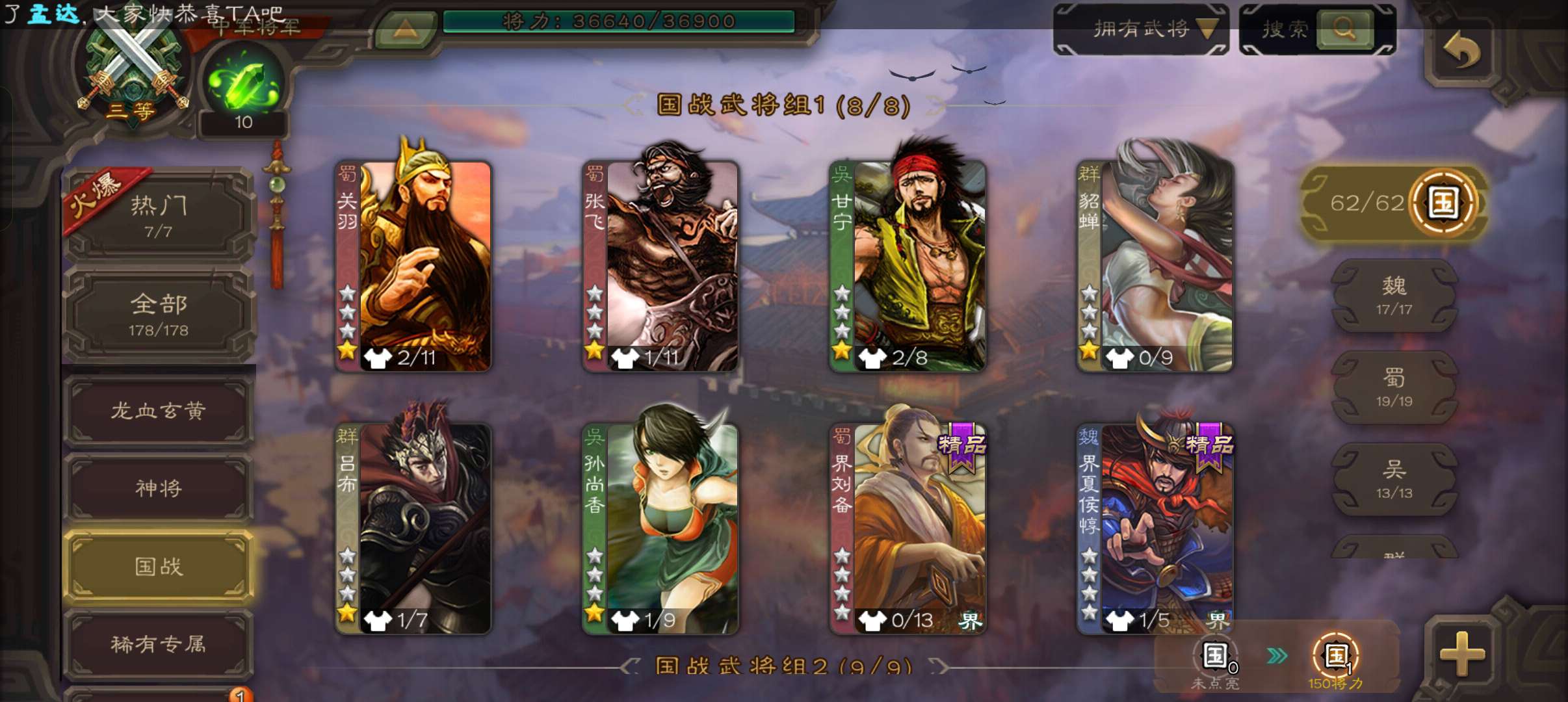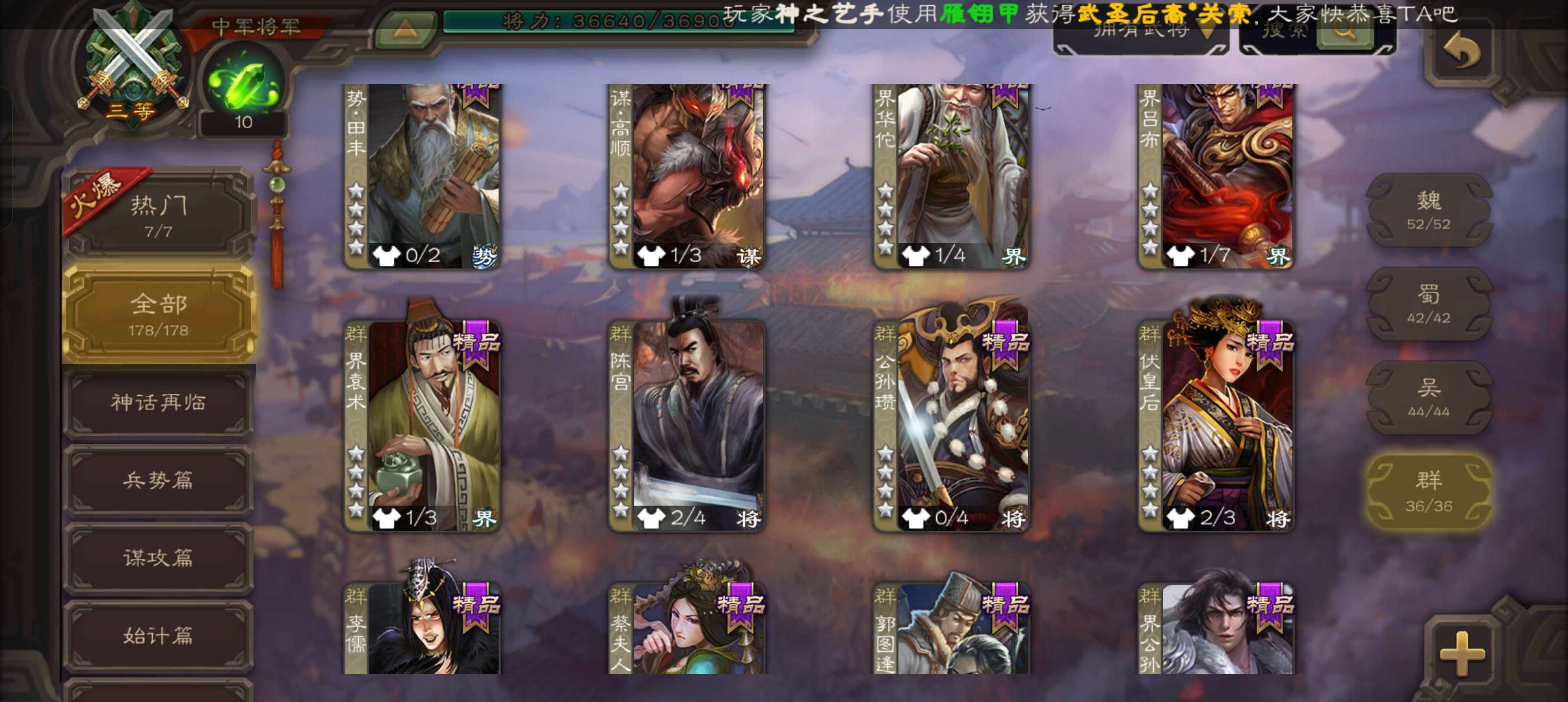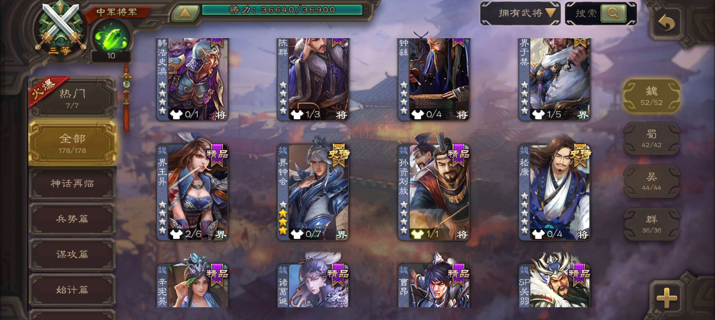 9史诗4神中军,8.6万毛7万豆,神赵云神吕布界钟会谯周界于禁王平嵇康杨修程昱,神周瑜神吕蒙178将