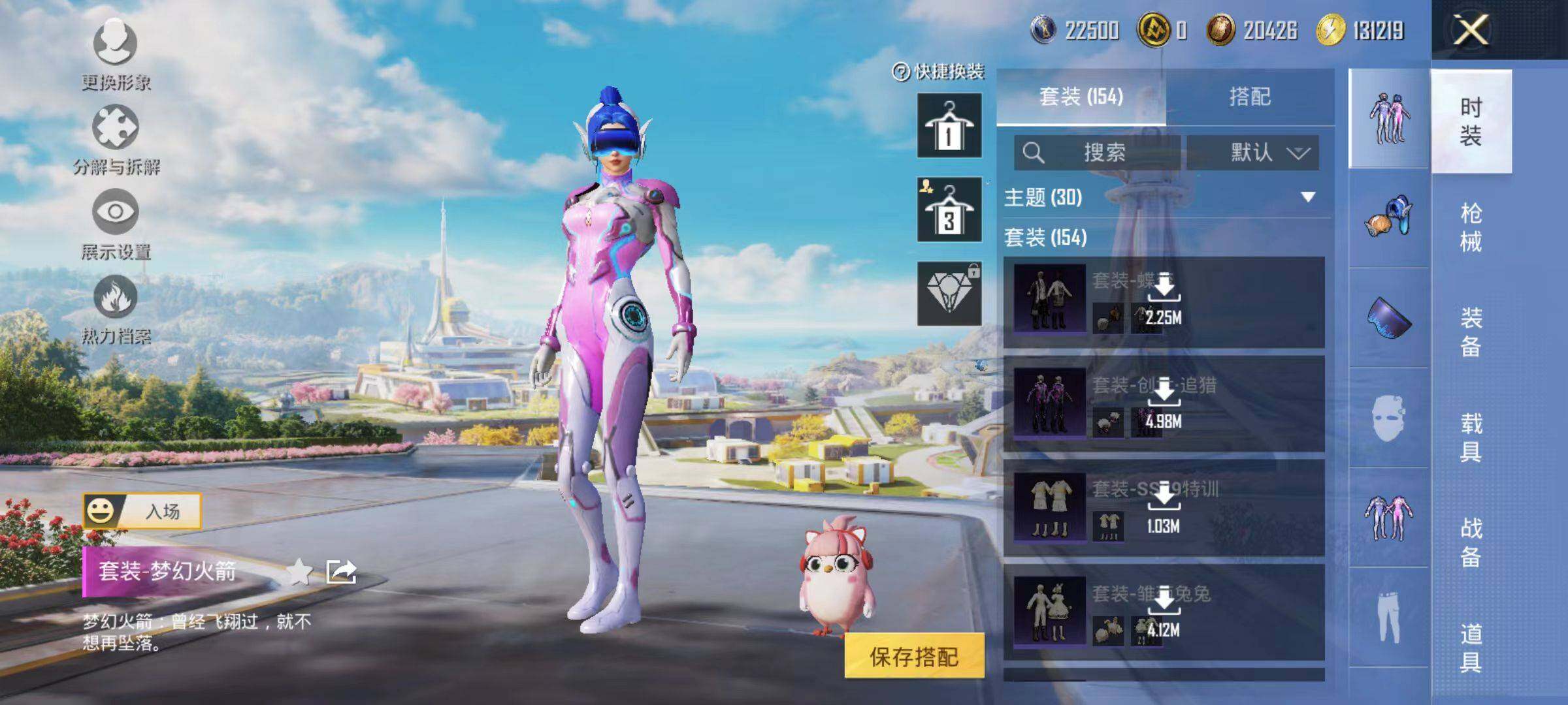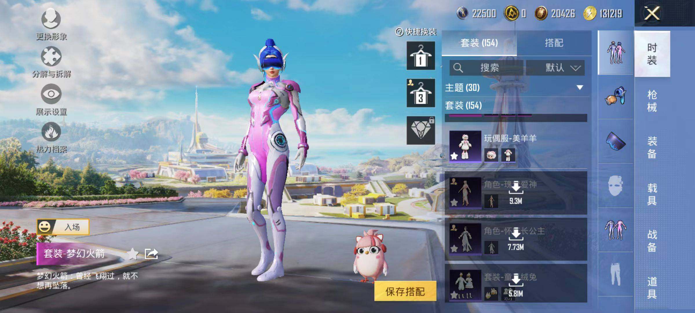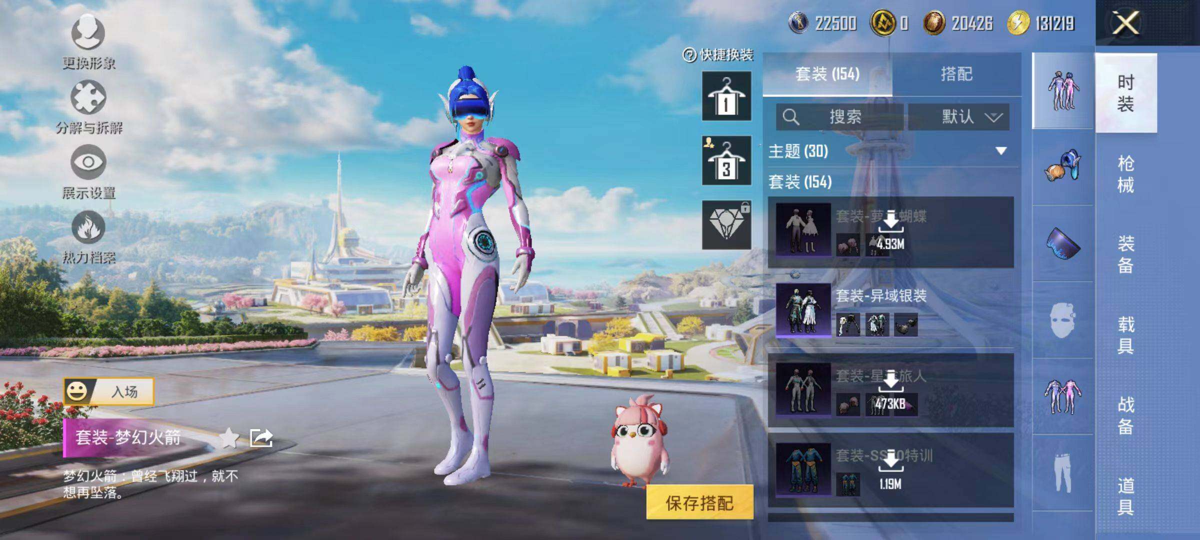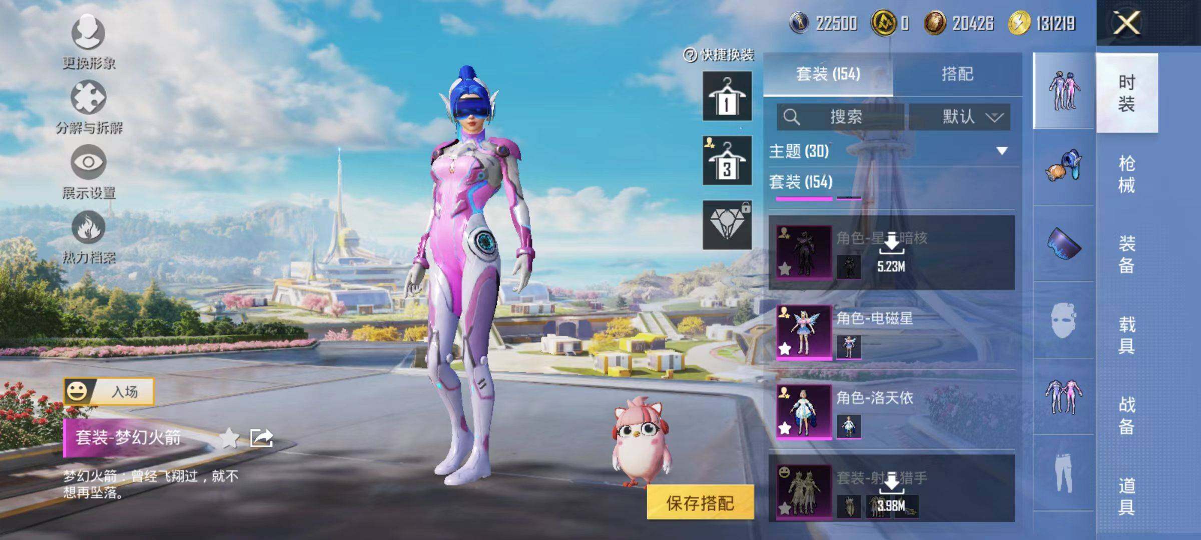 【粉色套装】:粉装-梦幻火箭,角色-洛天依,粉装-射星猎手,角色-宙之时溯,角色-星云暗核,角色-电磁星,套装-创世·救赎,角色-智耀战神