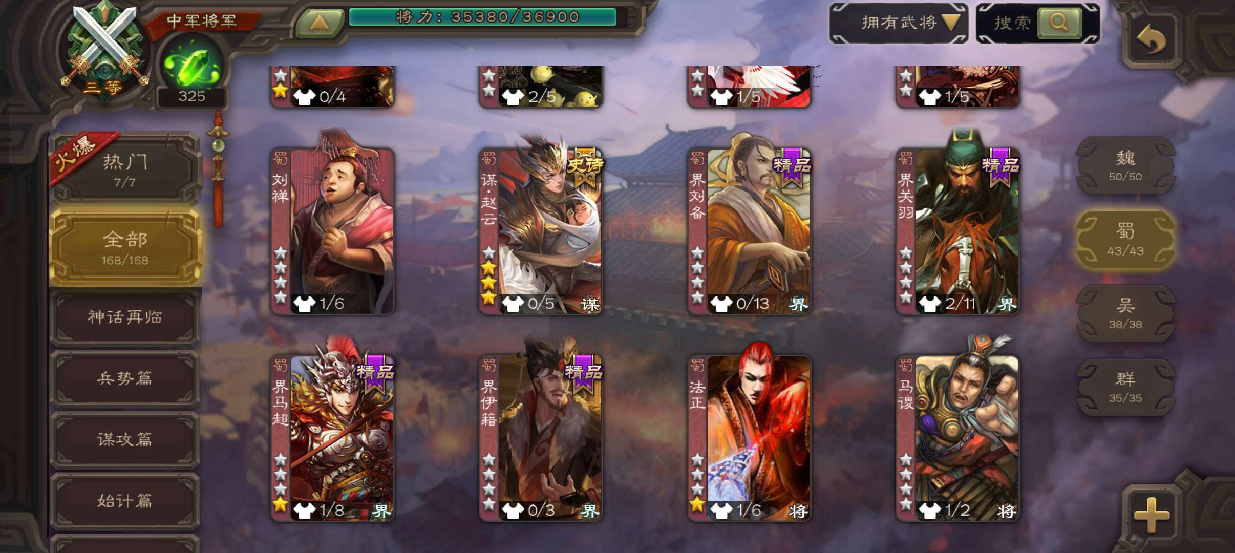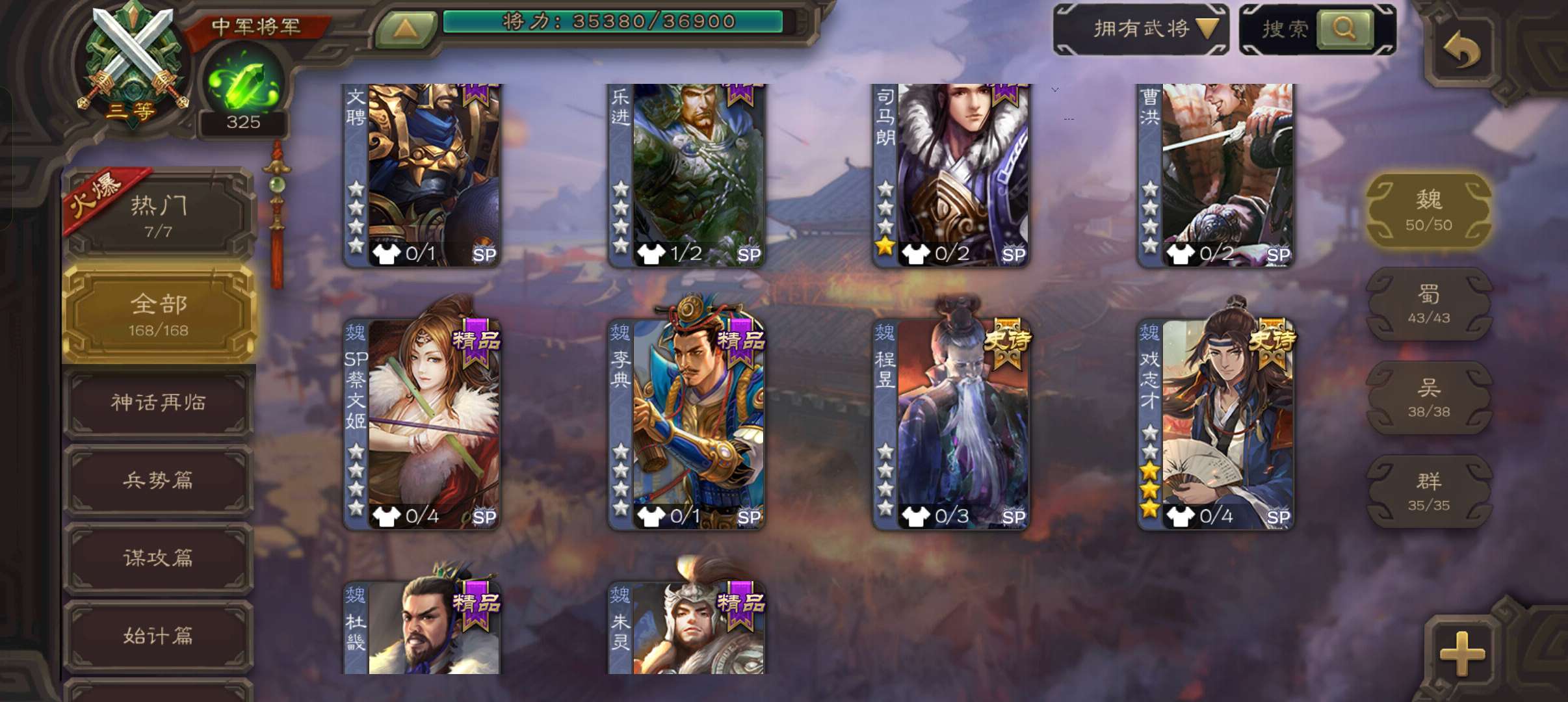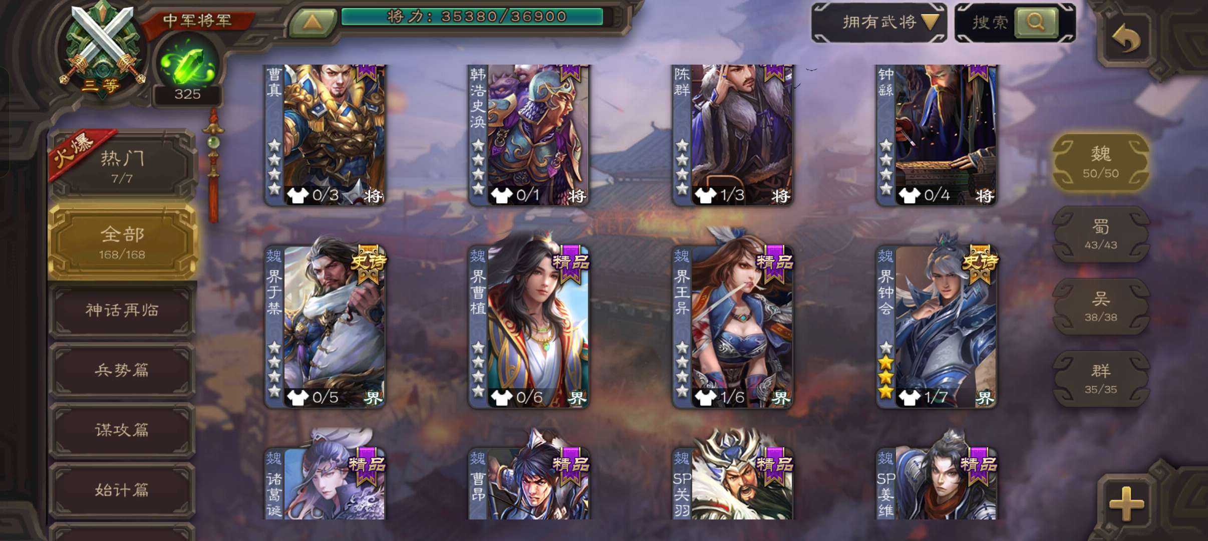8史诗中军,7.5万豆,真动态神吕布戏志才界钟会沙摩柯谋赵云界于禁左慈程昱,神吕蒙谋高顺168将