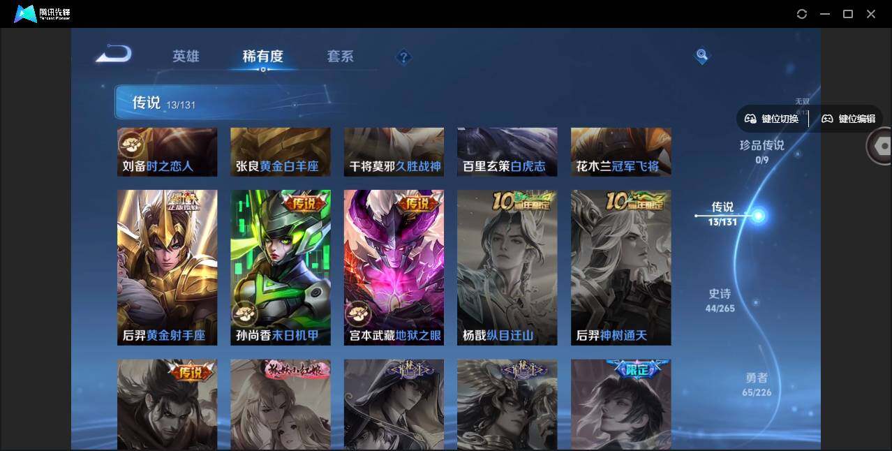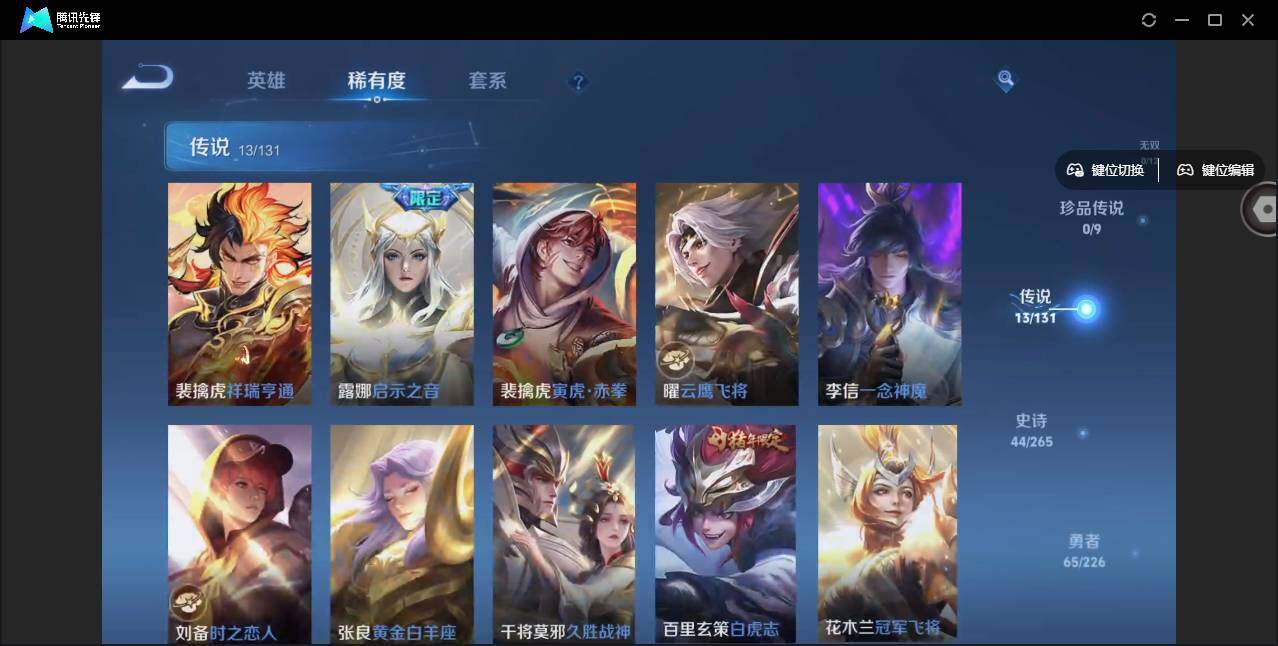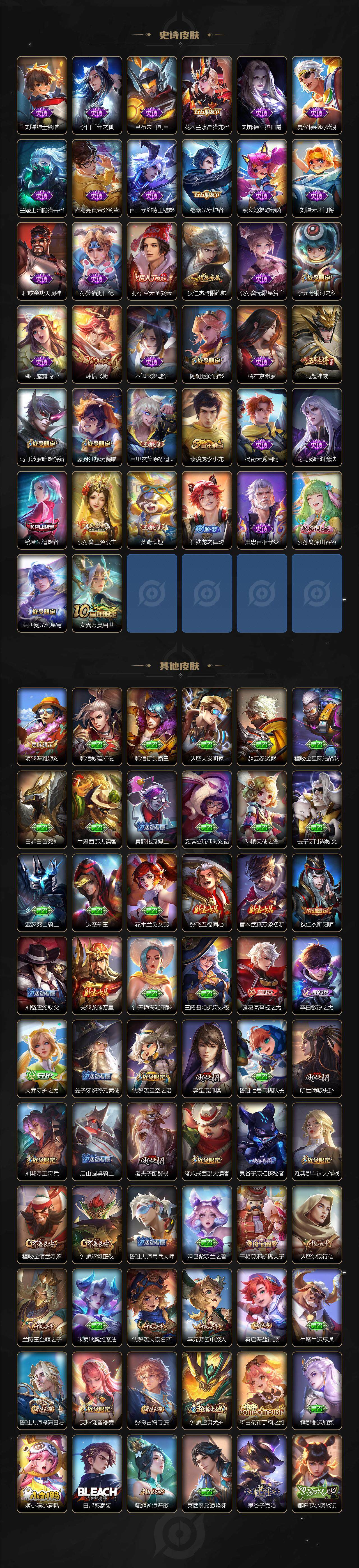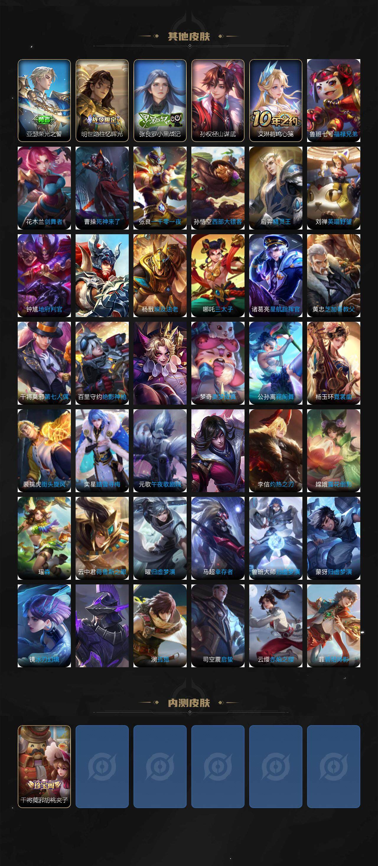 【传说皮肤】:裴擒虎祥瑞亨通,露娜启示之音,裴擒虎寅虎赤拳,曜云鹰飞将,李信一念神魔,刘备时之恋人,张良黄金白羊座,干将莫邪久胜战神,百里玄策白虎志,花木兰冠军飞将,后羿黄金射手座,孙