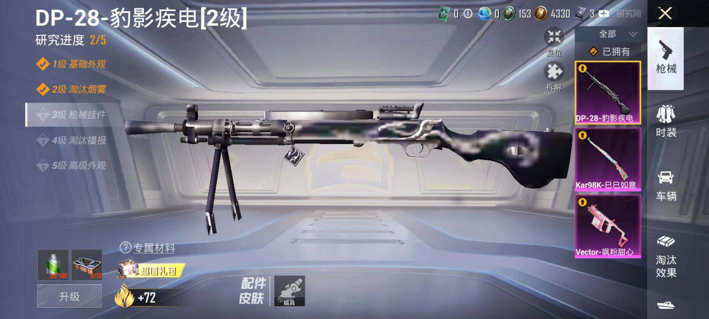 【粉色枪皮等级】:Vector-飒粉甜心(七级),Kar98K-巳巳如意(五级),DP-28-豹影疾电(二级)