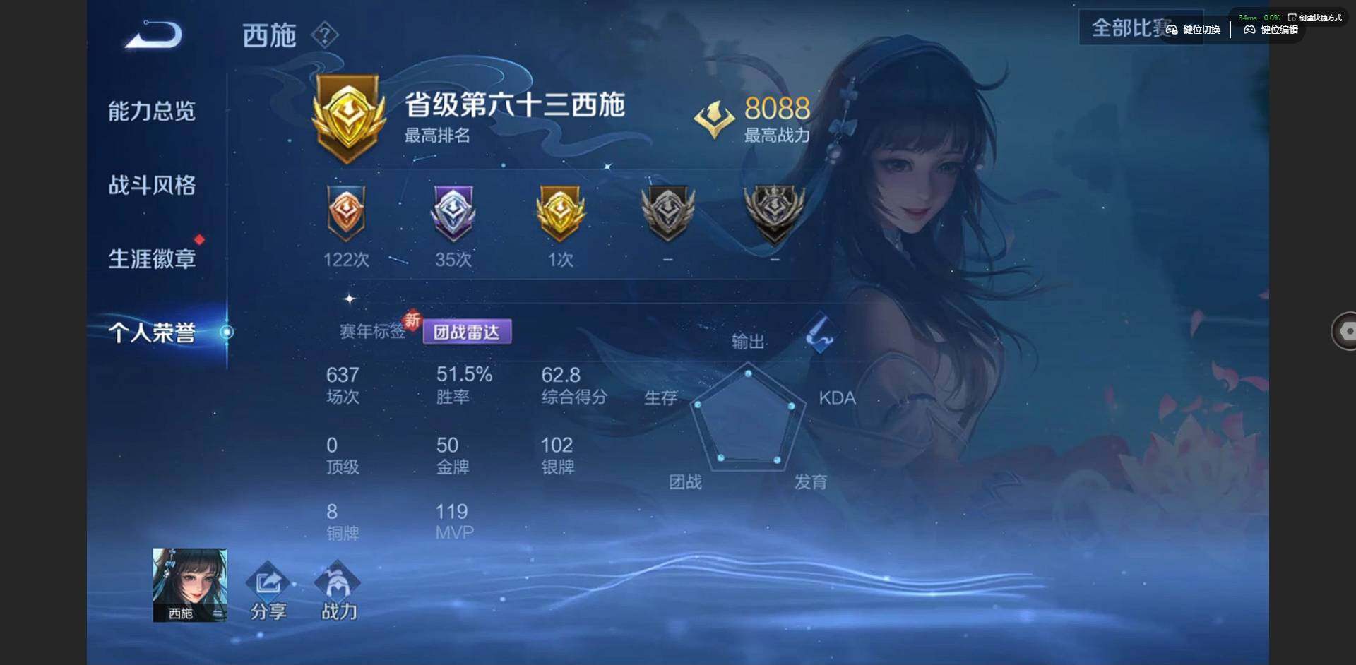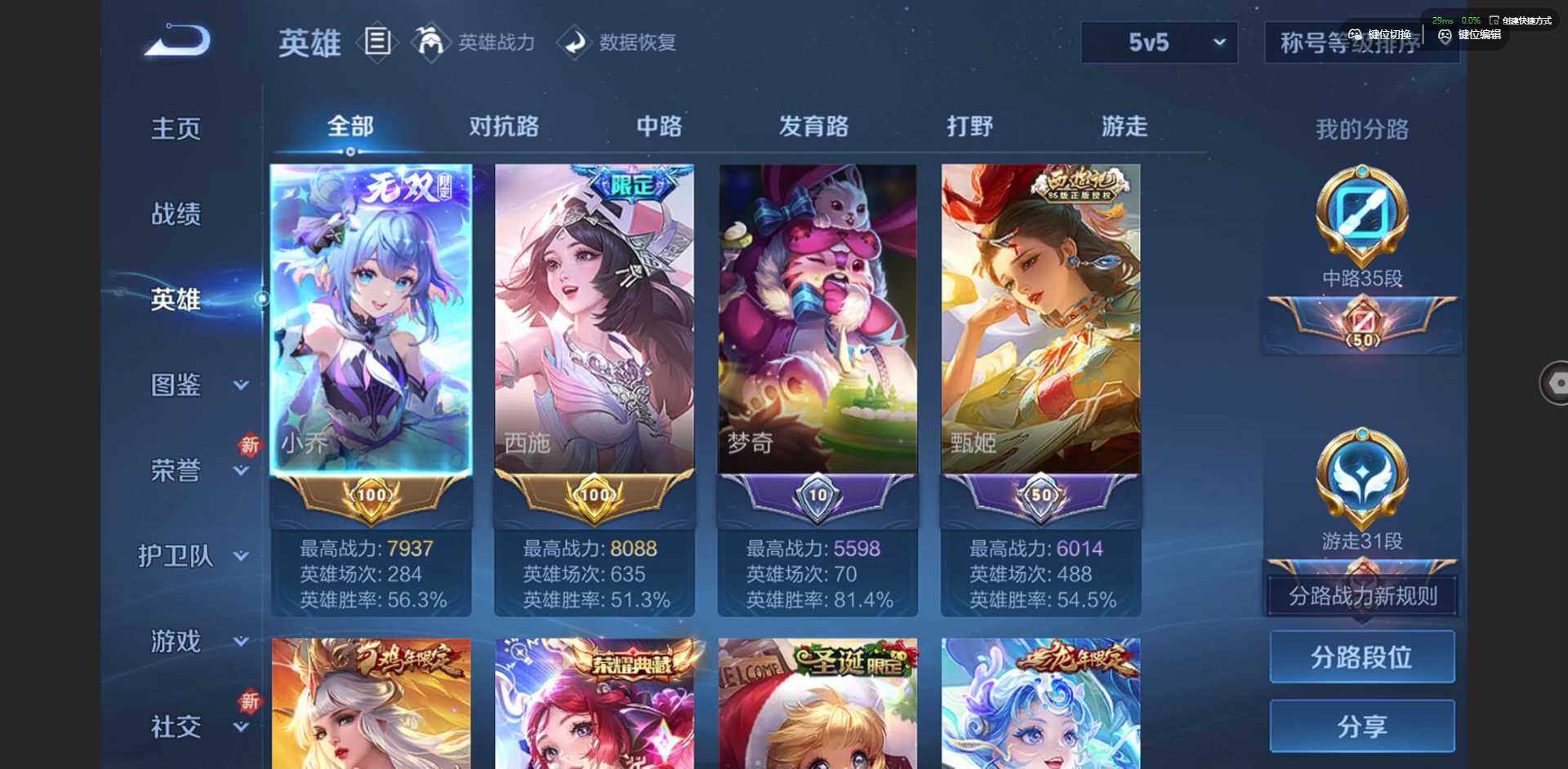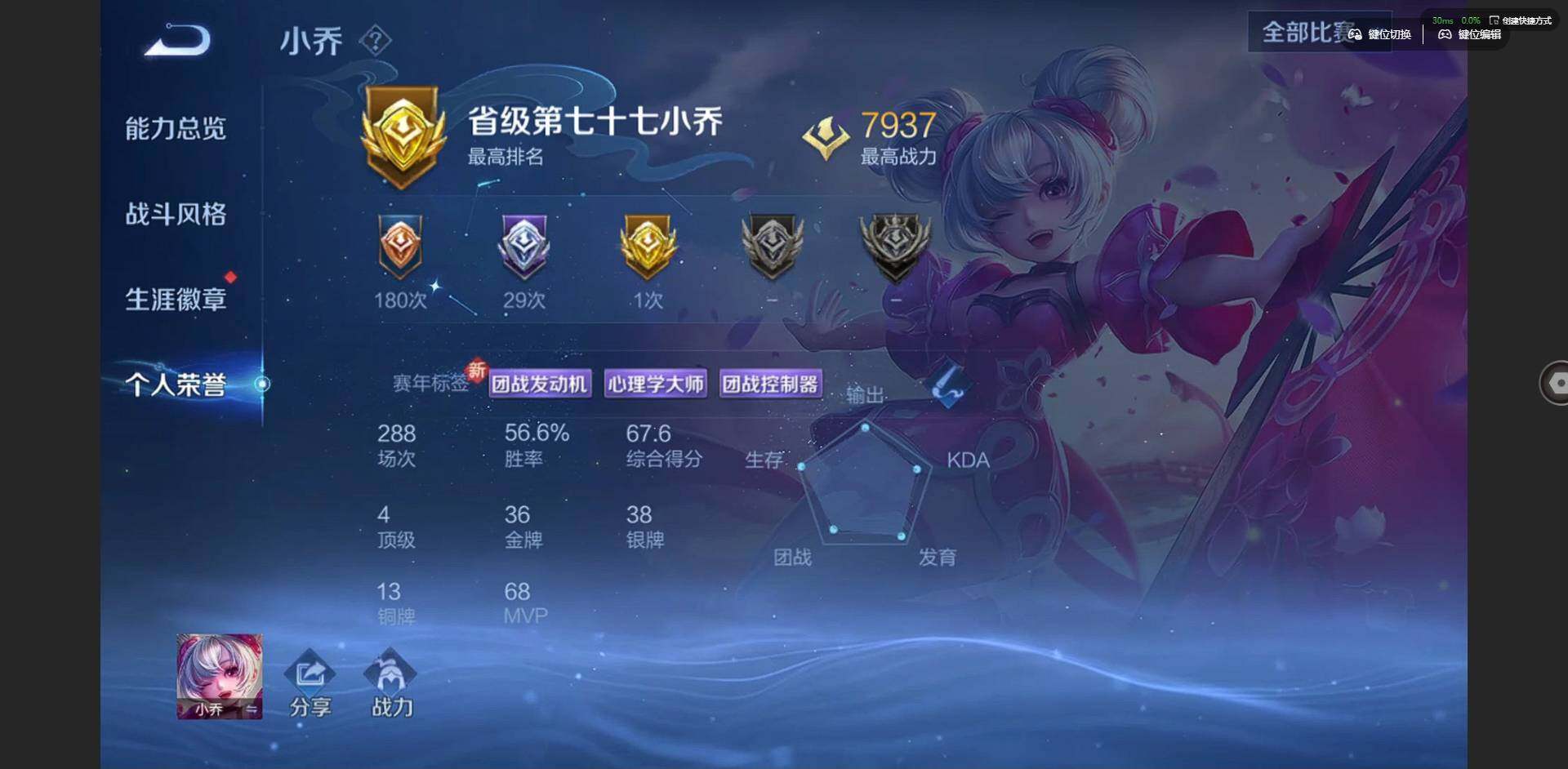 营地账号:2128078869/【女号 紫瑶 金标小乔 金标西施 西施全皮 朵莉亚全皮】实名: 可修改 贵族等级: V9 英雄数: 126 皮肤数: 368 荣耀水晶: 天鹅之梦,拾光映像 无双皮: 小乔时之魔女 星传说: 时之愿境,未来机甲,金色仲夏夜 传说皮: 猫影幻舞,一念神魔,末日机甲-孙尚香,仲夏夜之梦,音你心动-小乔,地狱之眼,音你心动-周瑜,乞巧织情,游龙清影,遇见胡旋,花朝如约,