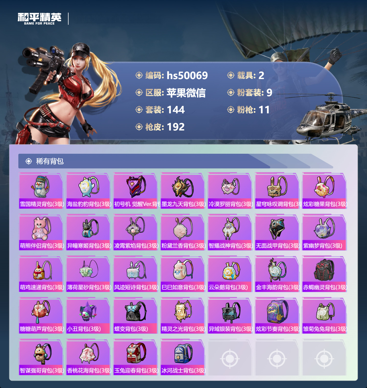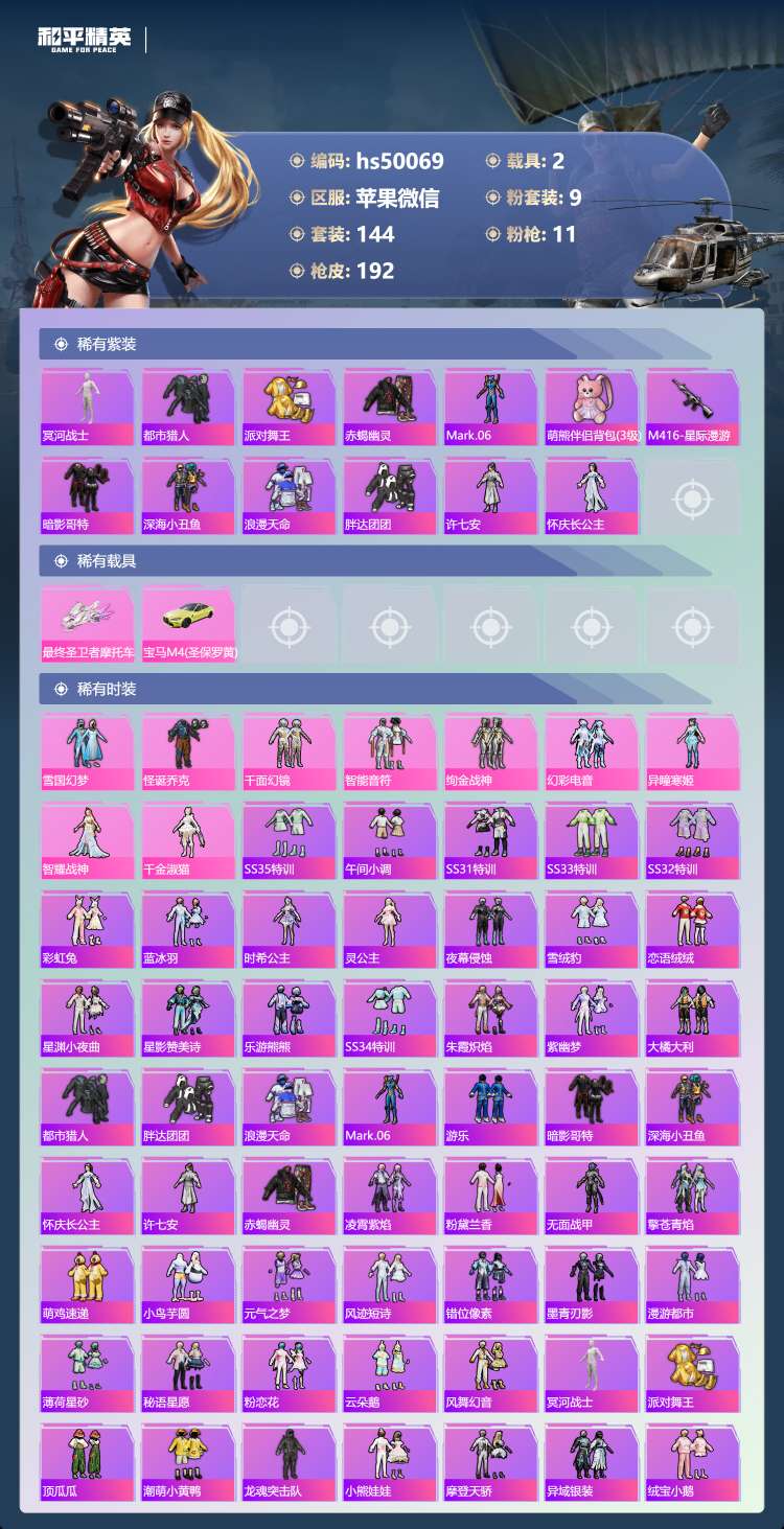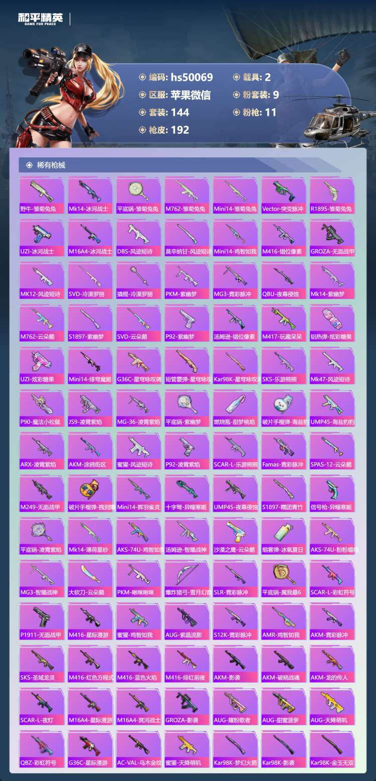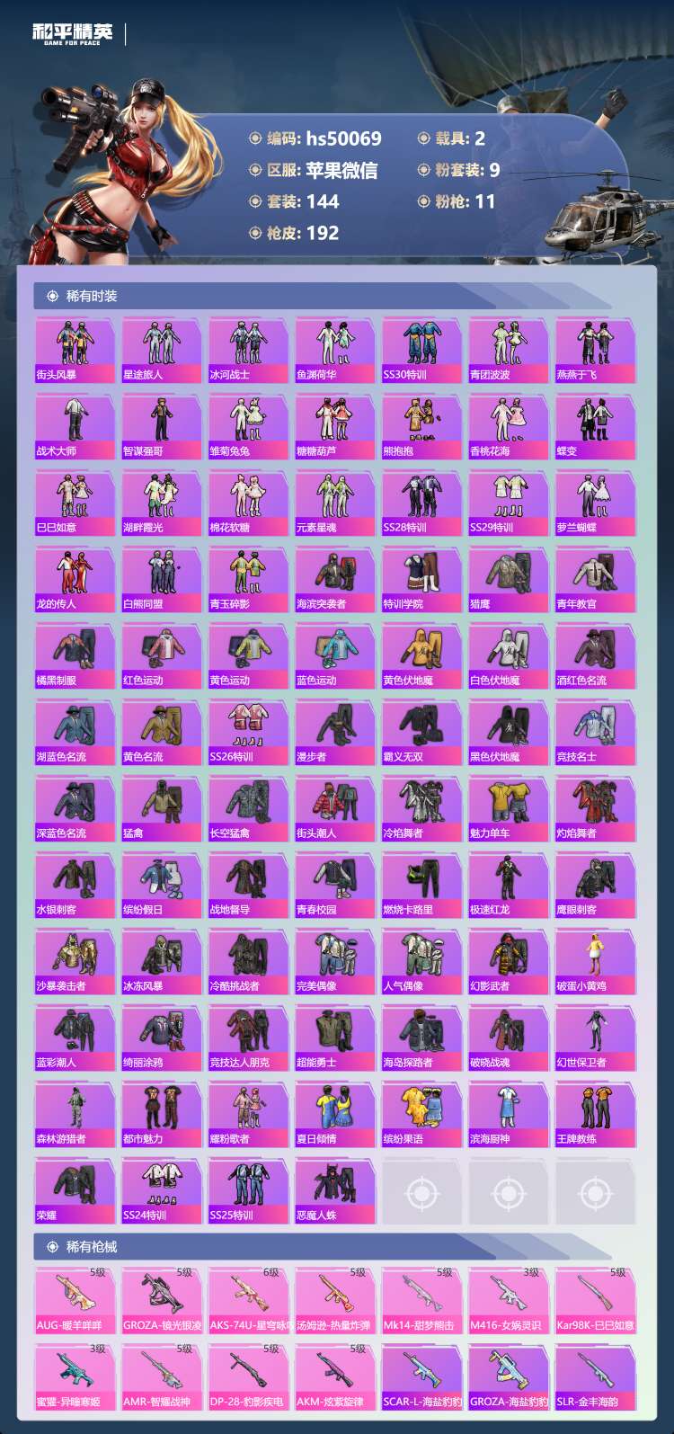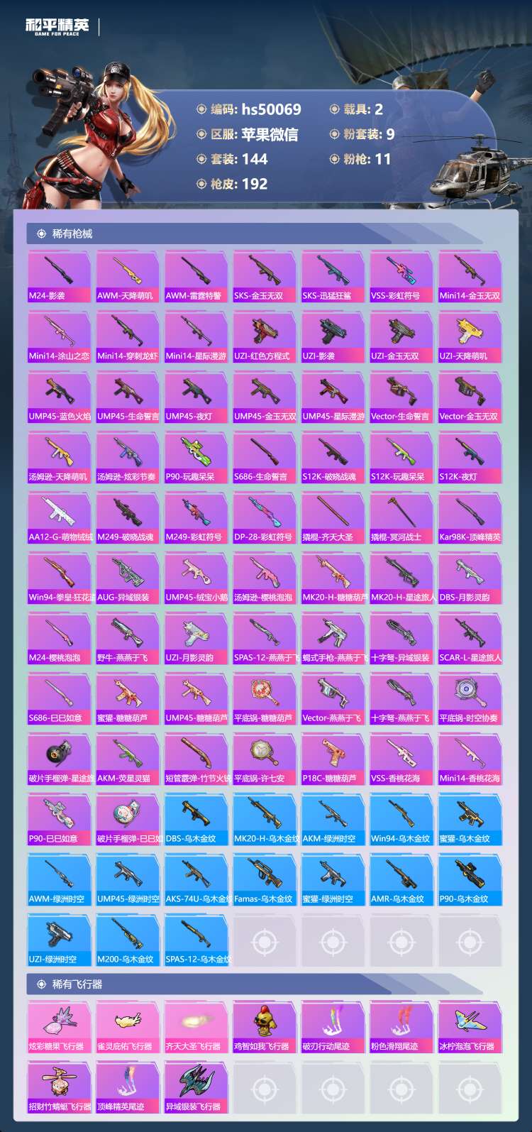 hs50069 苹果微-7王牌印记-9粉装-11特效枪-2载具-61125热力值-144套装-19