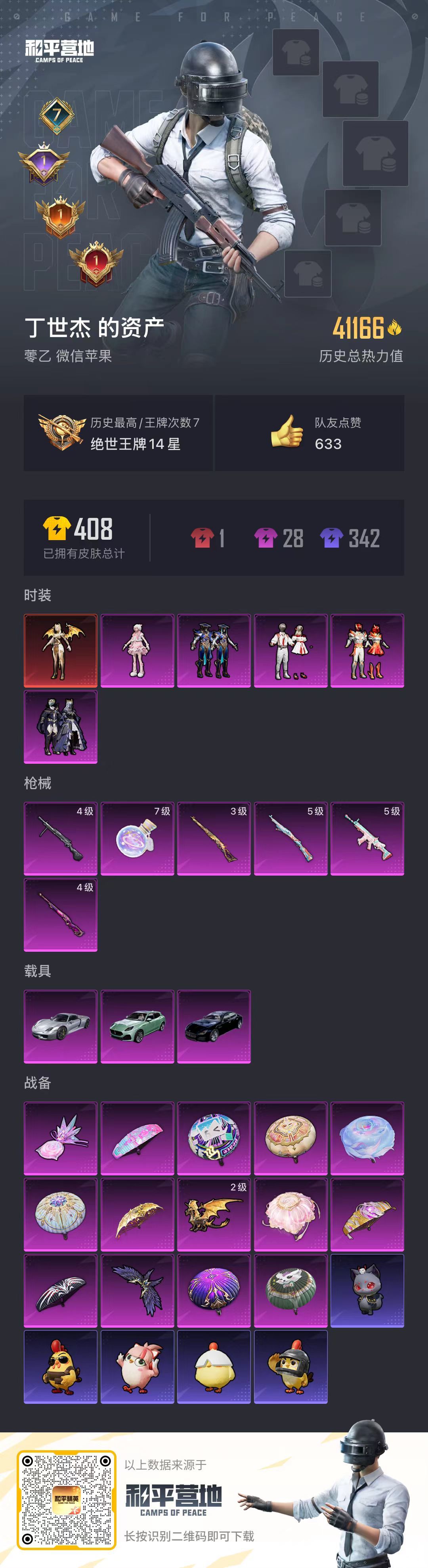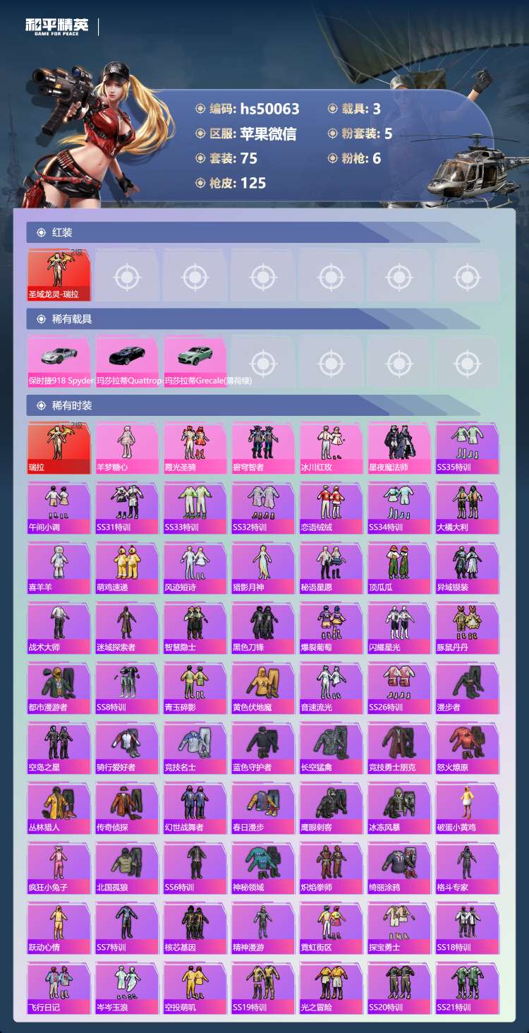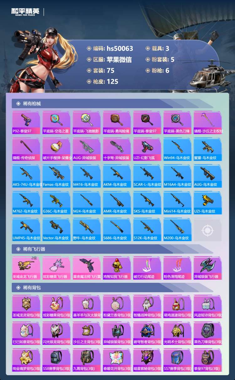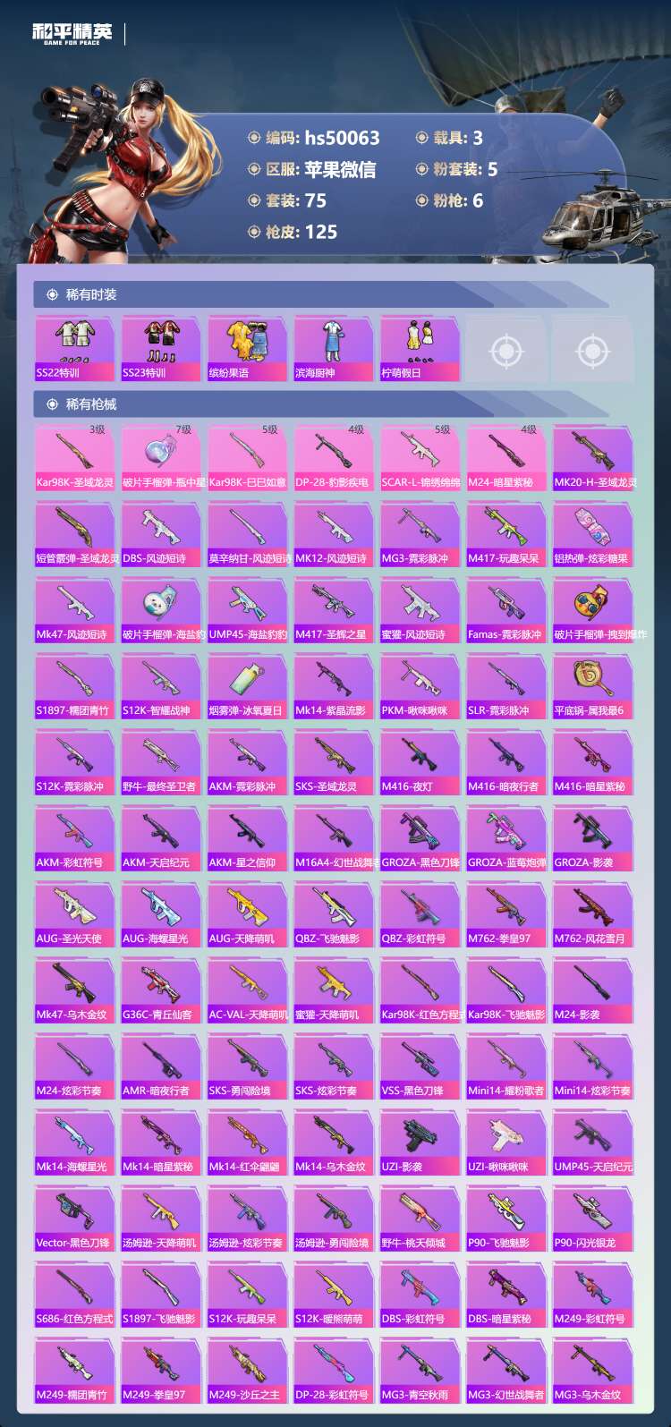 hs50063 苹果微-7王牌印记-1红装-5粉装-6特效枪-3载具-41166热力值-75套装-