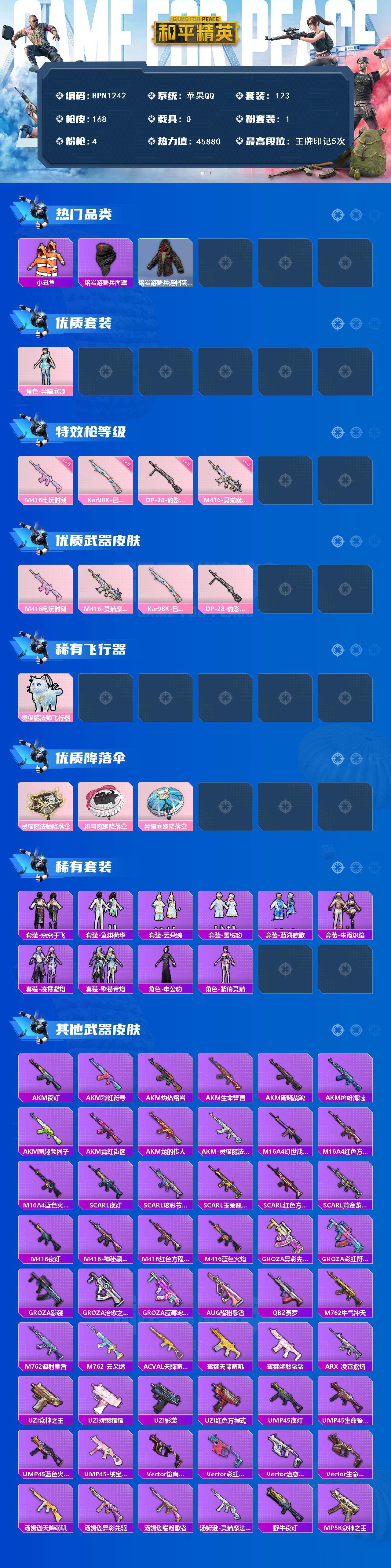 【HPN1242】123套装/枪械4/装备162/战备92/王牌印记5/热力值45880/五级M416-电玩时刻/三级M416-灵猫魔法师/五级Kar98K-巳巳如意/五级DP-28-豹影疾电/套装-浪漫天命/深海小丑鱼/小丑鱼/套装-暗影哥特/熔岩游骑兵面罩/熔岩游骑兵连帽夹克/角色-异瞳寒姬/M416-电玩时刻/M416-灵猫魔法师/Kar98K-巳巳如意/DP-28-豹影疾电/灵猫魔法师飞行器/灵猫魔法师降落伞/绯穹魔姬降落伞/异瞳寒姬降落伞/套装-燕燕于飞/套装-鱼渊荷华/套装-云朵鹅/