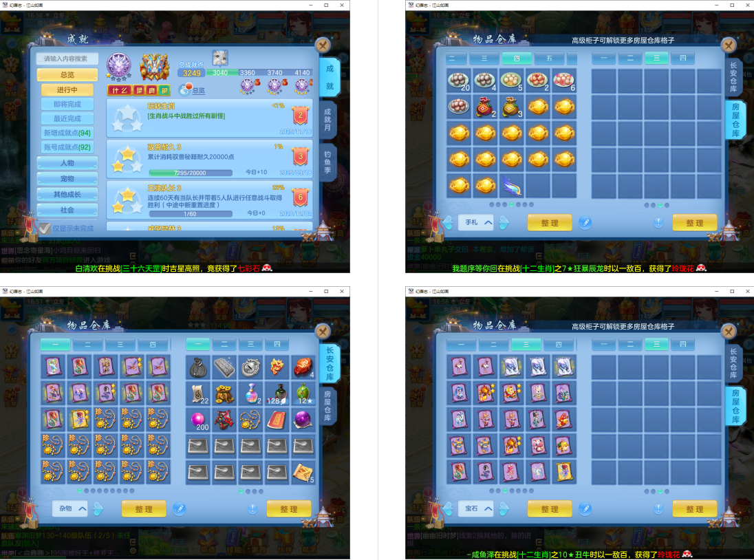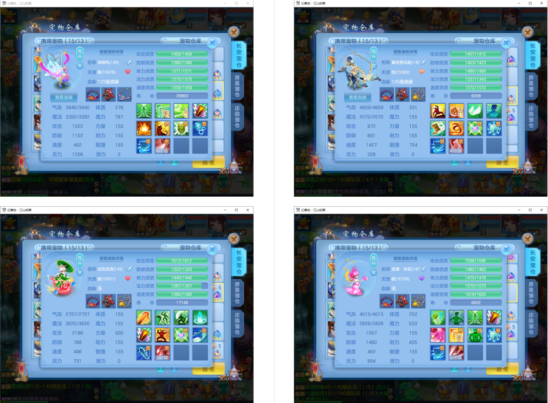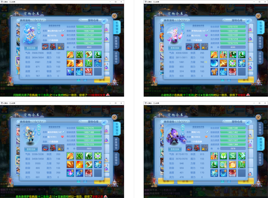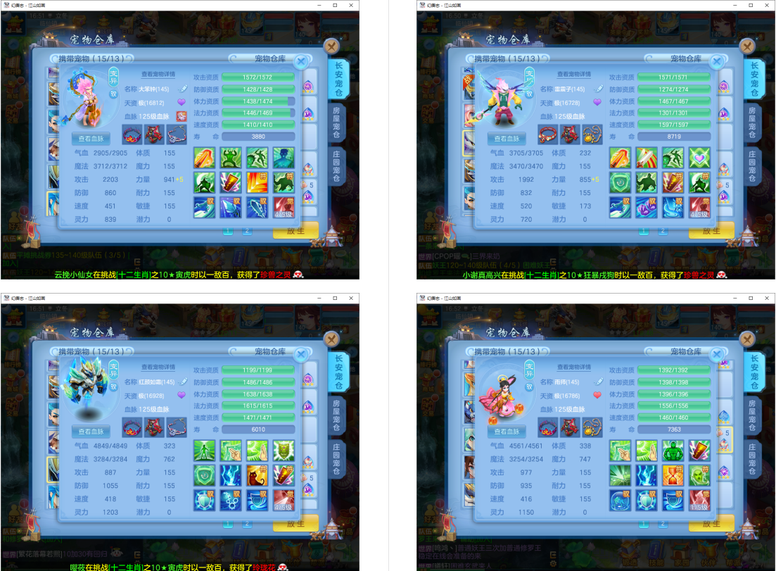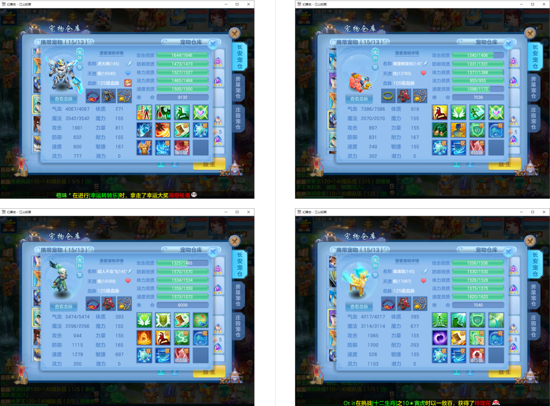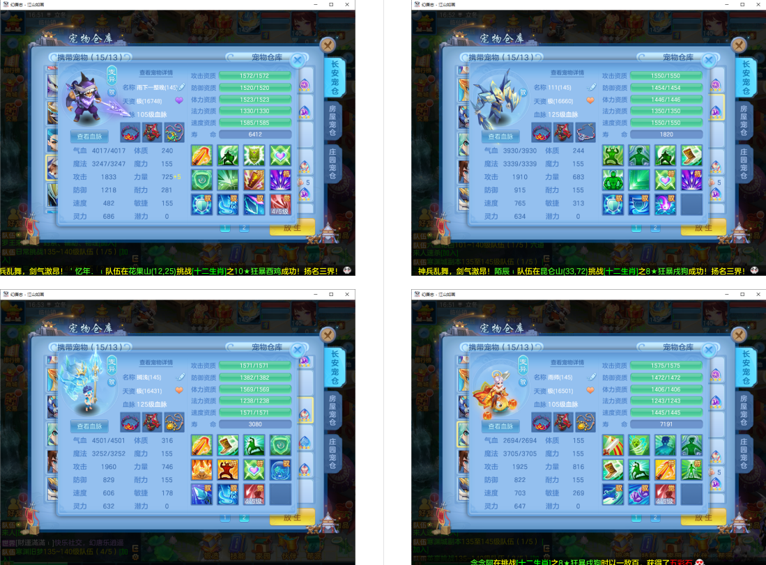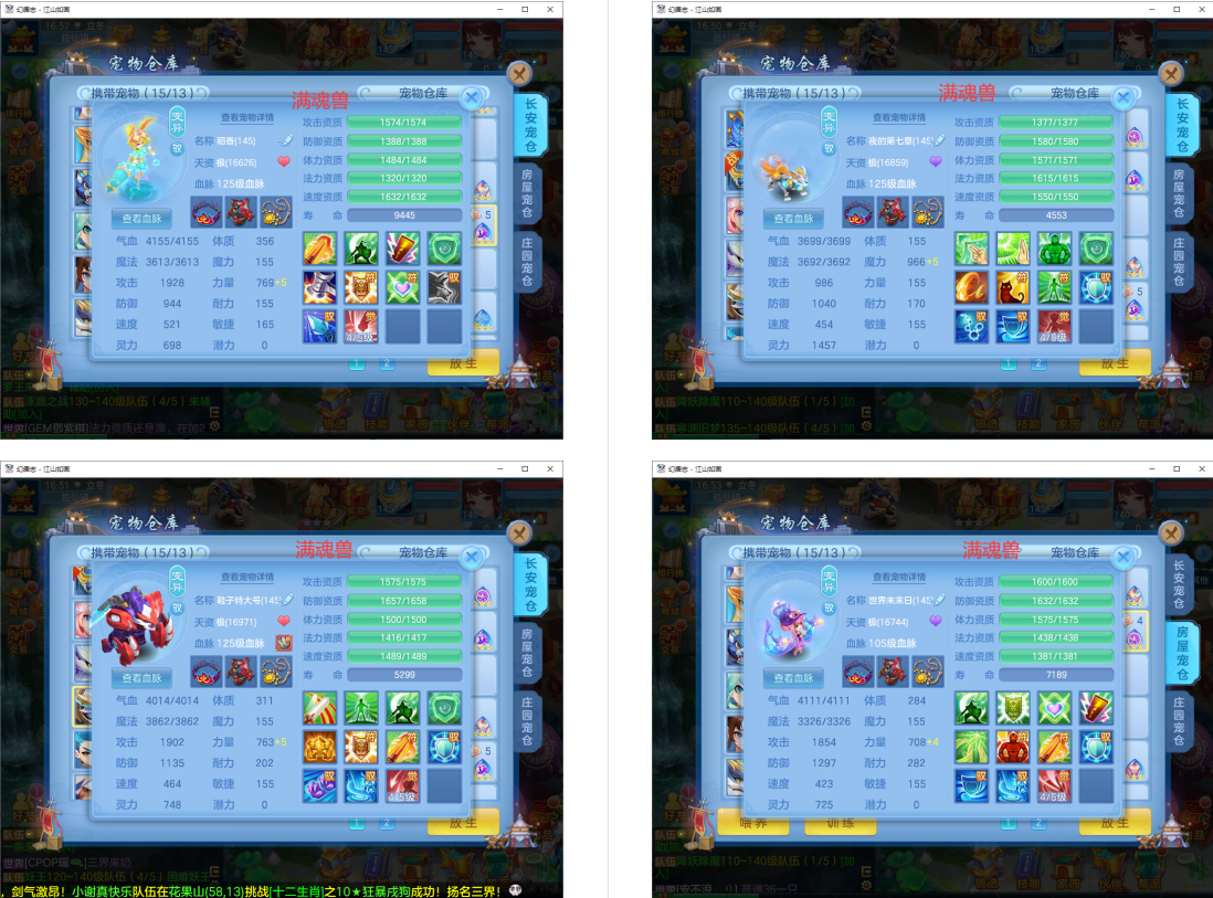 (140方寸/女)江山如画/邮箱不送/半年换绑/有双重---3件14段2件13段1件10段,特技装,满魂仙兽+2内丹神+9个6多特殊5(总6满魂),16红10黄10专属血脉,22个宝宝皮肤,高级坐骑+金拍庄园,440万银子,3249成就