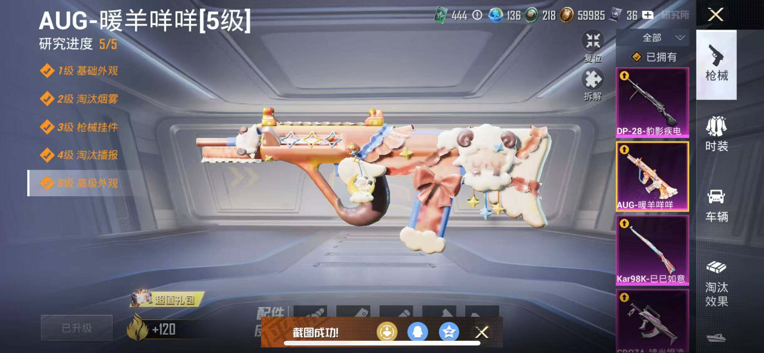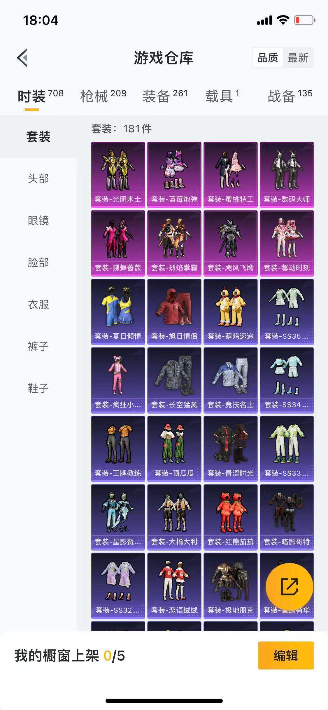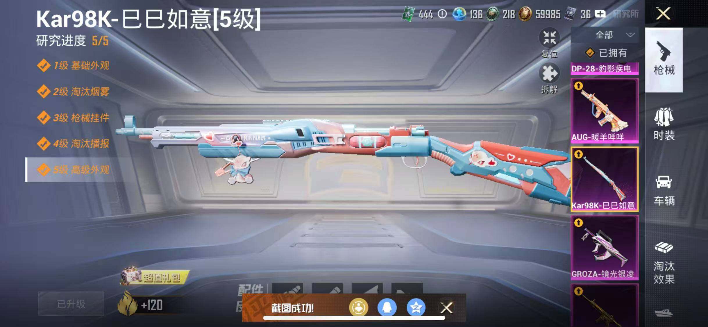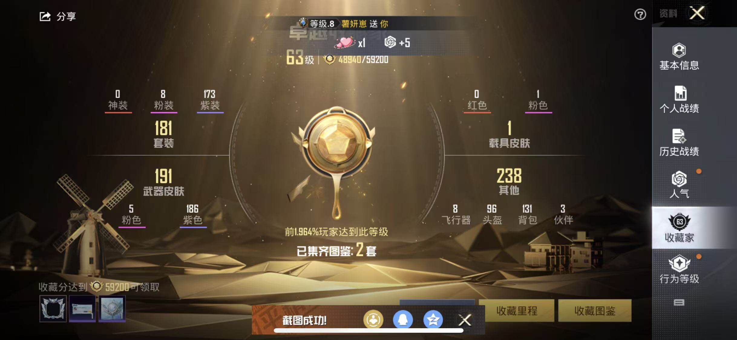 苹果 手Q-8粉装-5特效枪-1载具-1粉色飞行器-65557热力值-12王牌印记-181套装-209枪皮