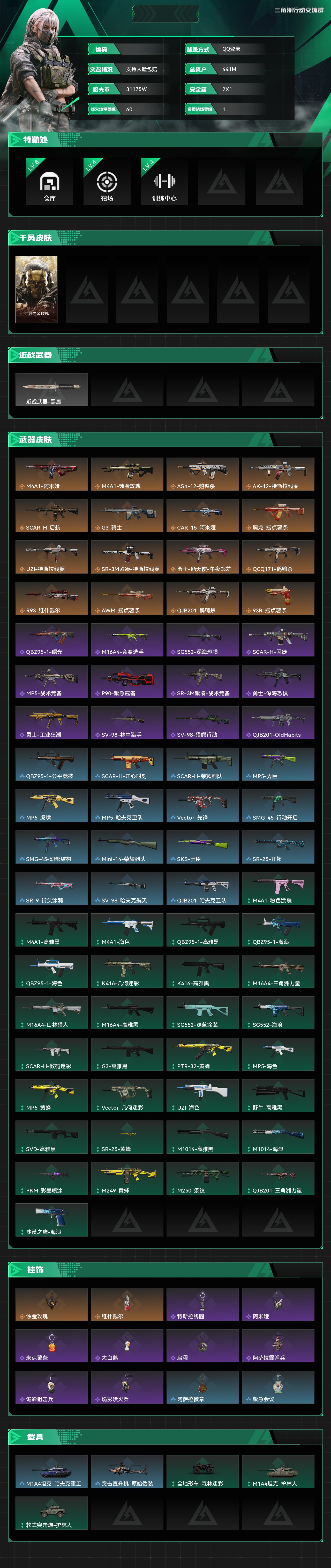 总资产:441M,哈夫币:31175W,武器皮肤74;烽