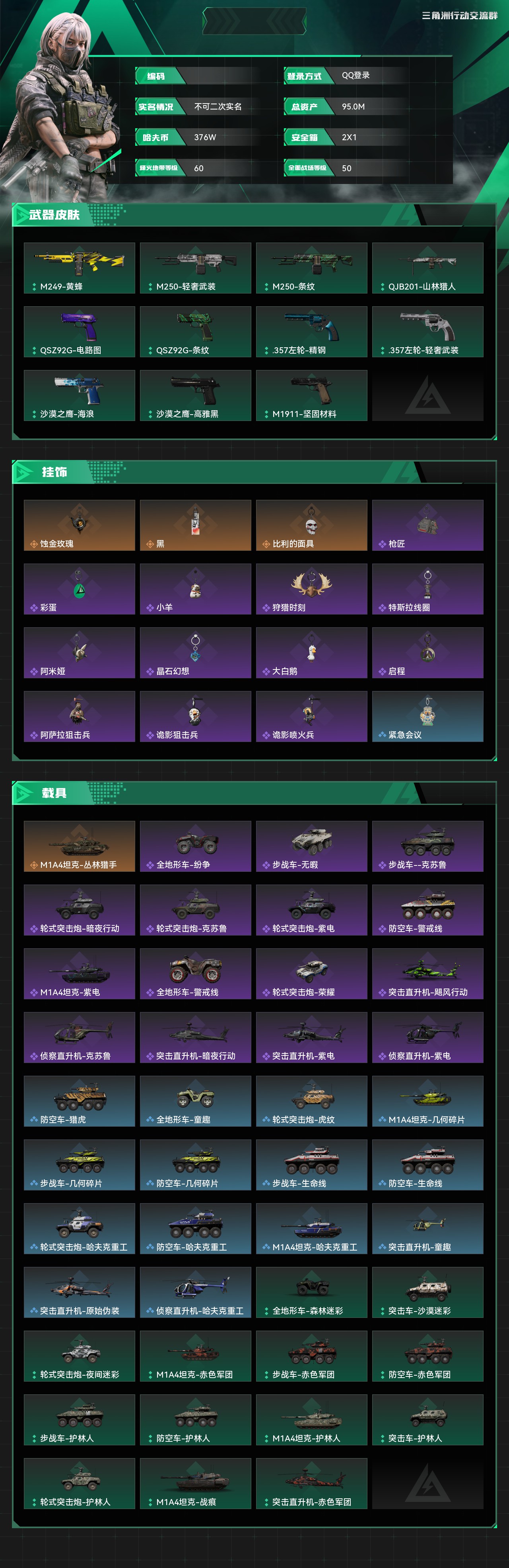 总资产:95.0M,哈夫币:376W,武器皮肤209;烽