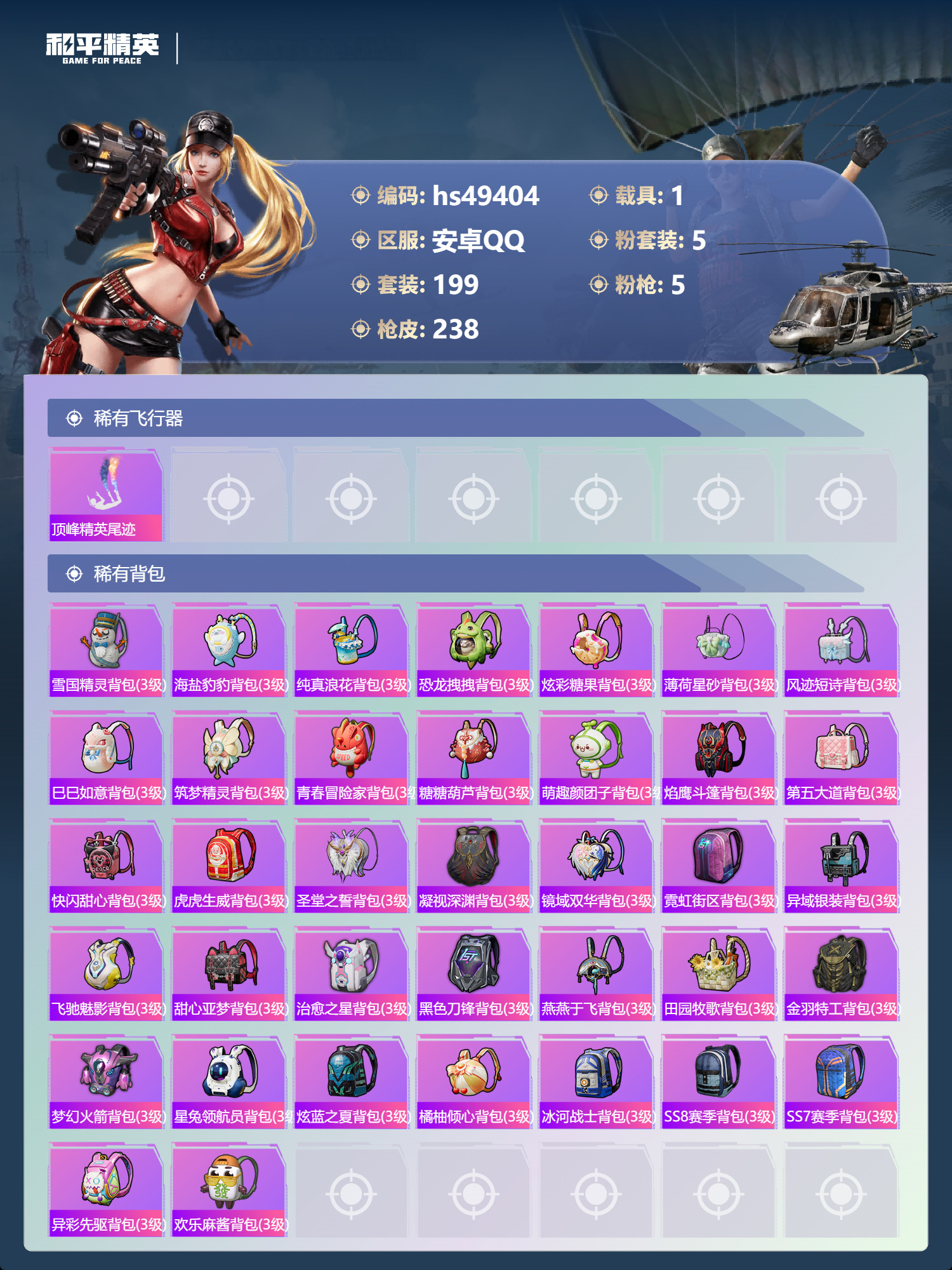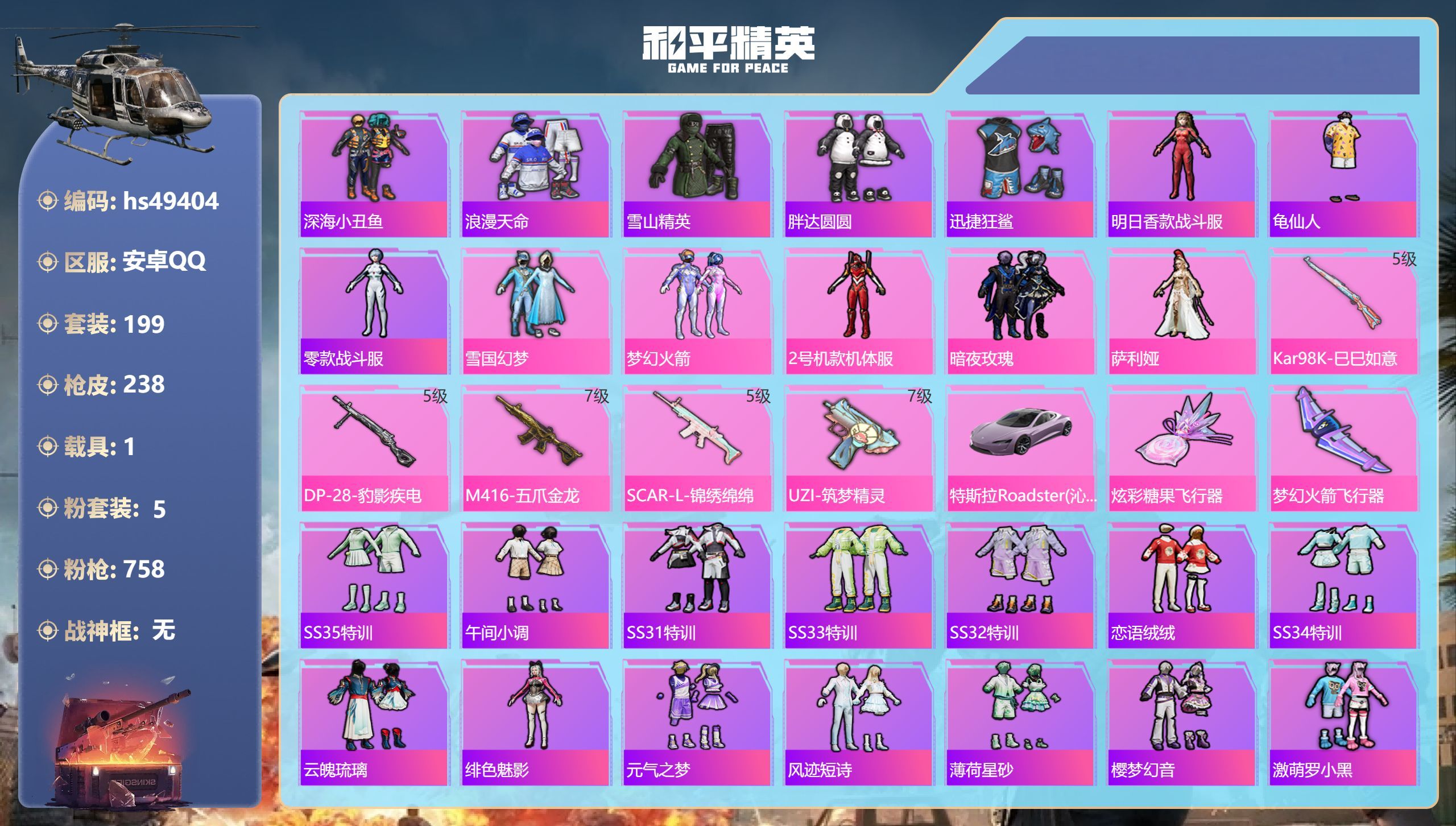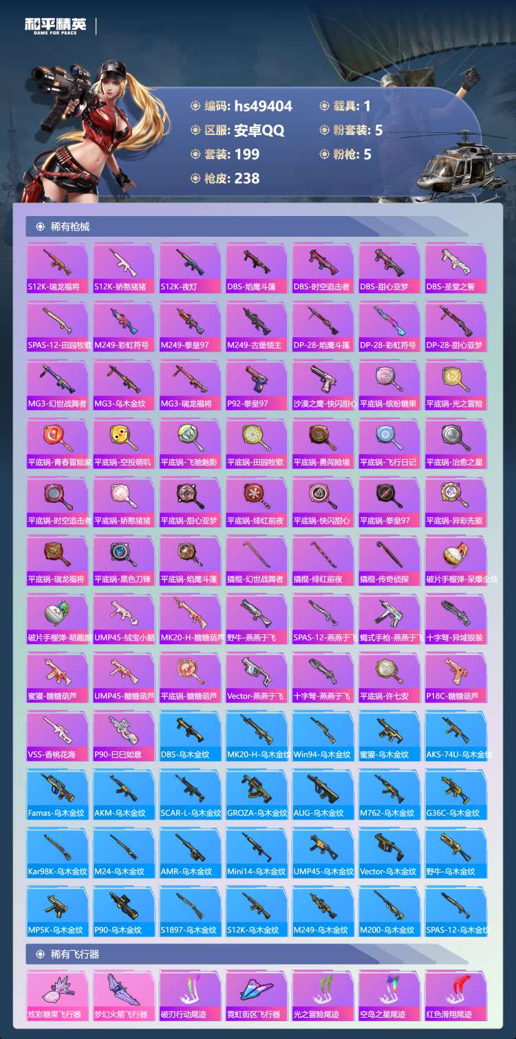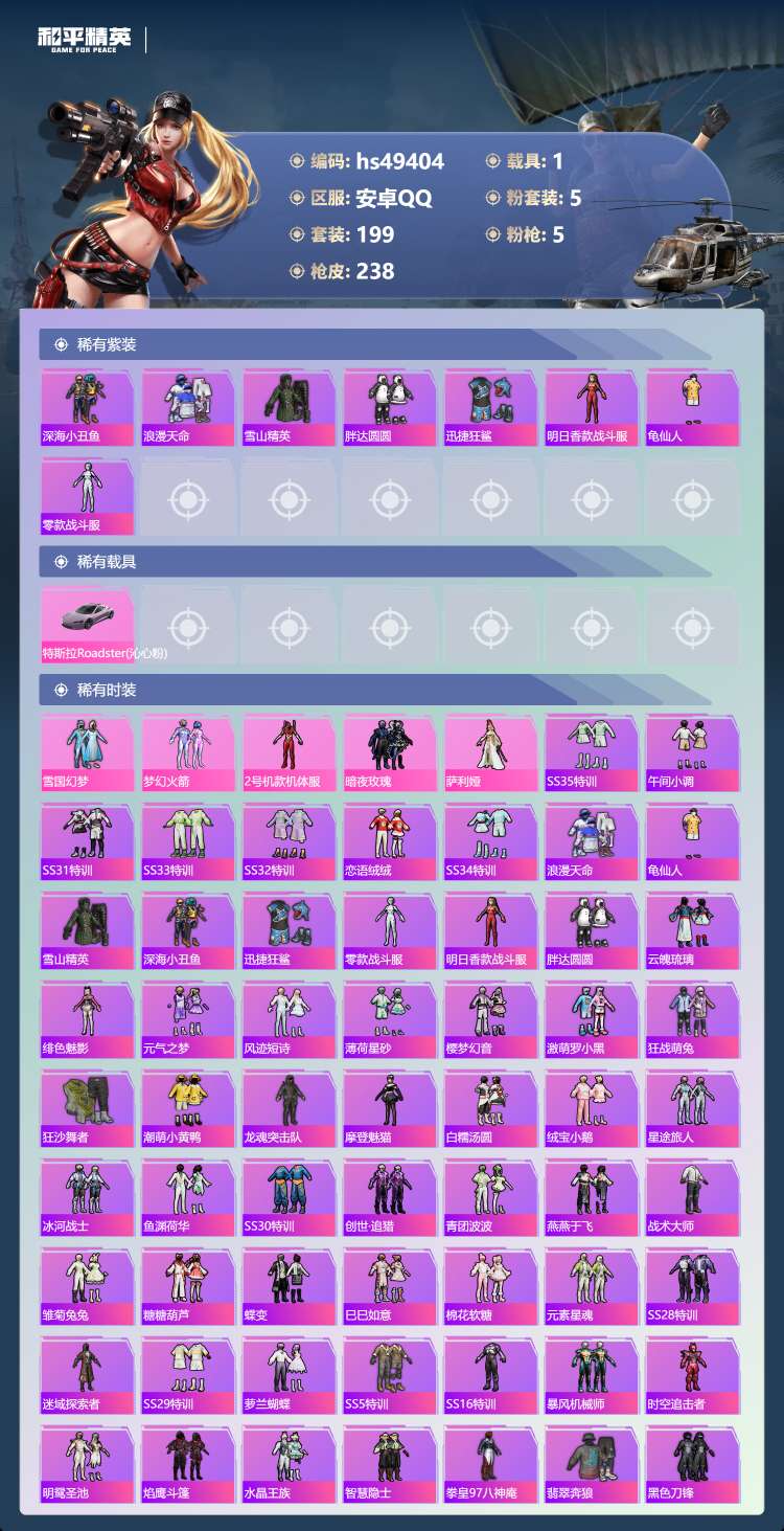 安卓Q-3稀有1载具5粉装5特效枪22热门199套装238枪皮 76425热力值 15印记 历史传奇