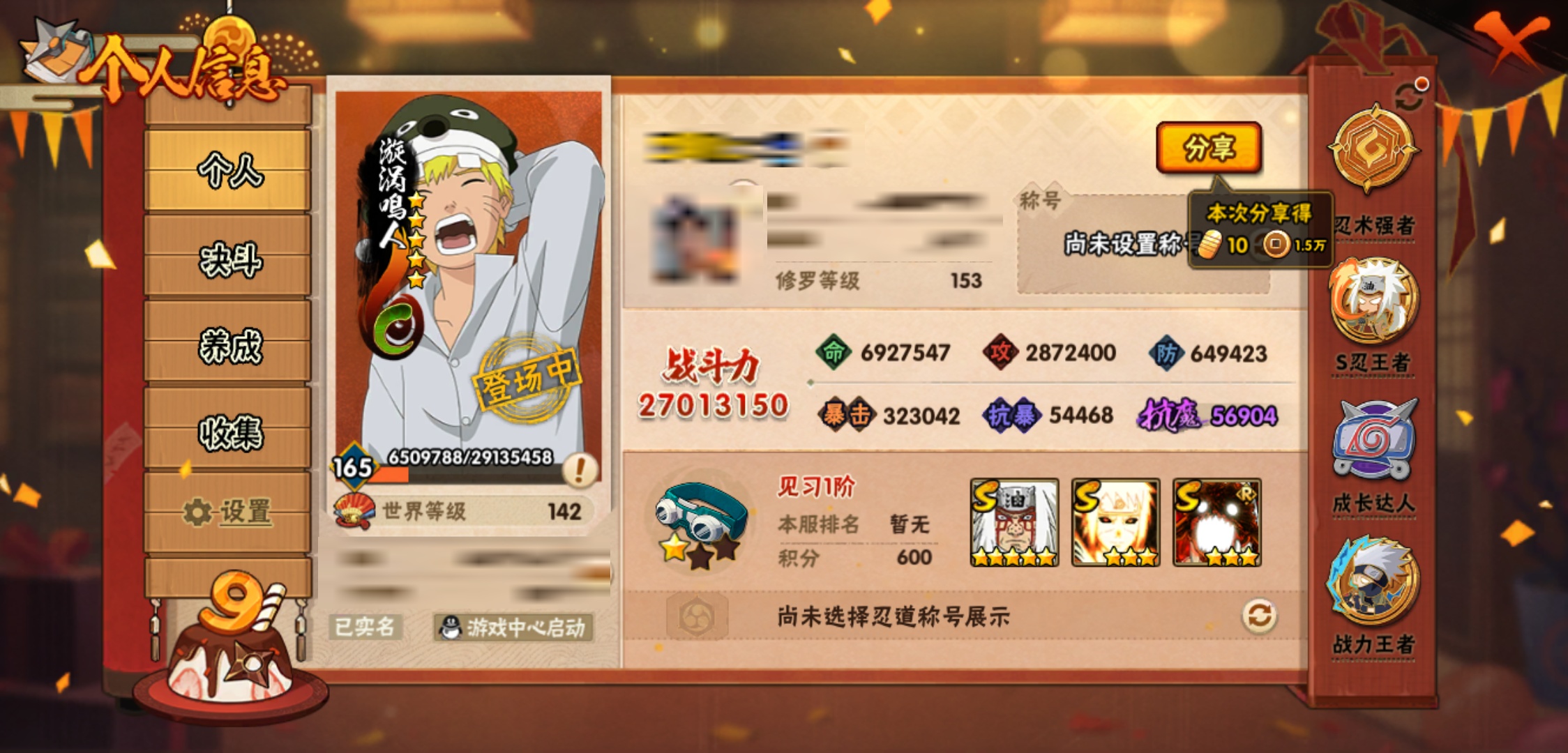 战斗力:2701W+;段位:见习1阶;本服排名:19;战区