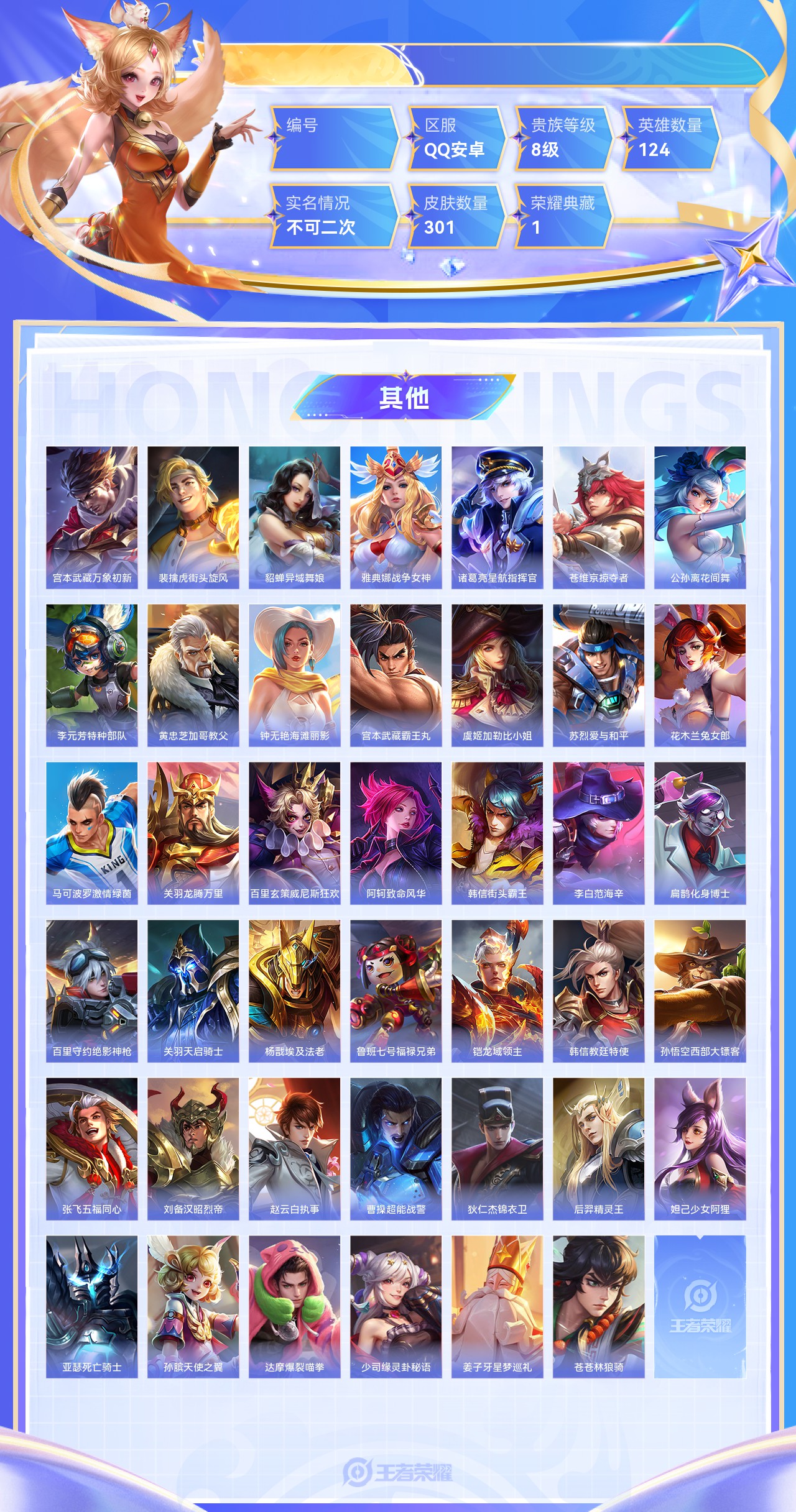 典藏1 传说12 史诗87 限定96 英雄124 皮肤3