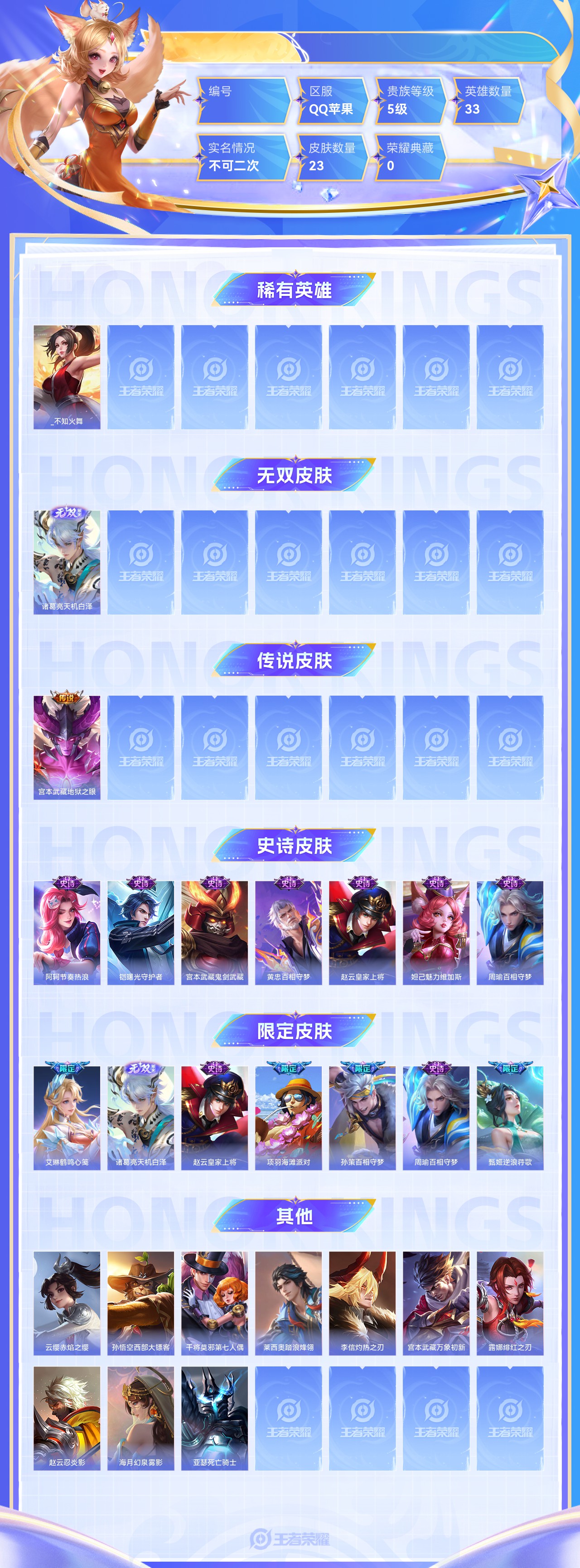 无双1 传说1 史诗7 限定7 英雄33 皮肤23 稀