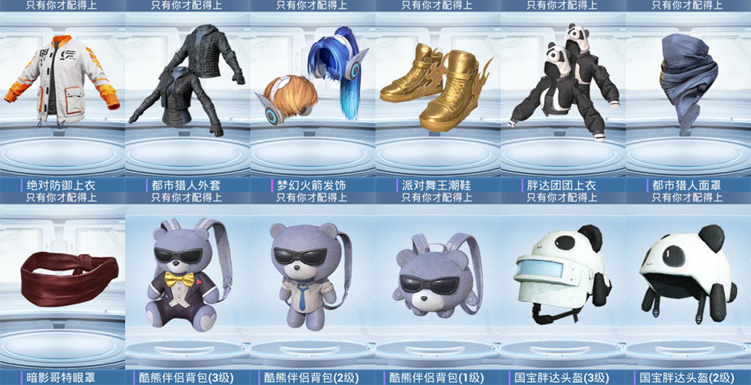 紫装:巡查衣, 都市猎人,,派对舞王,,,暗影哥特,小丑鱼,胖达团团,