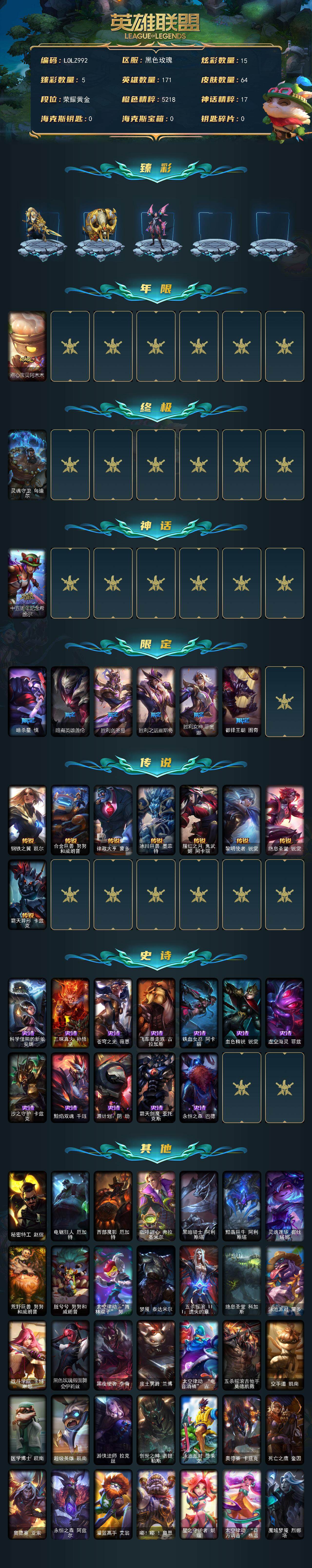 【LOLZ992】171英雄/64皮肤/1终极/1神话/7限定/5臻彩/15炫彩/8传说/12史诗/黄金/赵云子龙炫金将军/征服者阿利斯塔炫金/弹幕天使卡莎炽天使勇敢/预知之眼亚索不怠/黑夜使者嘉文四世白夜/点心宝贝阿木木/灵魂守卫乌迪尔/十五周年纪念希维尔/暗杀星慎/暗裔英雄盖伦/胜利剑圣易/胜利之运崔斯特/胜利女神菲奥娜/都铎王朝图奇/钢铁之翼凯尔/合金巨兽努努和威朗普/律政大亨蒙多/冰川巨兽墨菲特/腥红之月鬼武姬阿卡丽/黎明使者锐雯/绝息圣堂锐雯/霸天异形卡兹克/科学怪熊的新娘安妮/三昧真