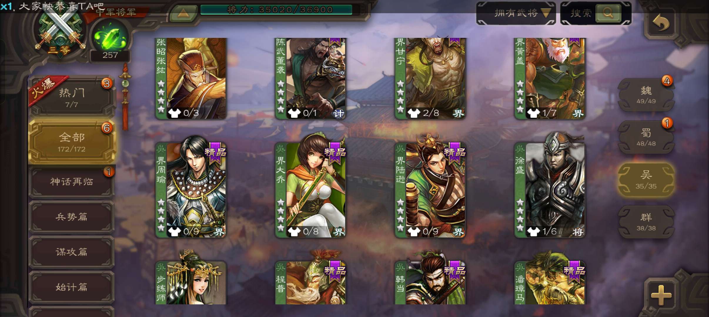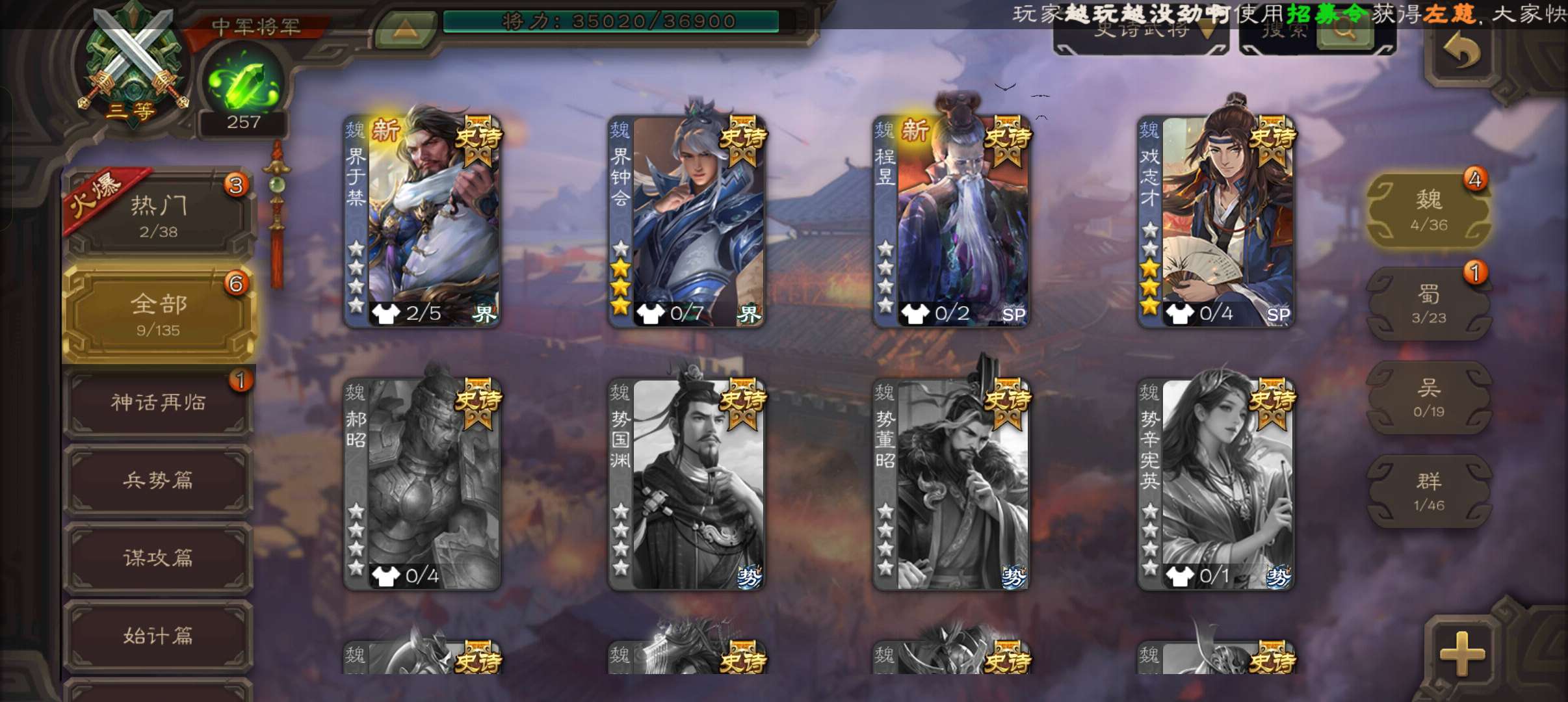 9史诗中军,8万毛7万豆,回廊动白马界钟会戏志才神吕布沙摩柯花鬘谯周界于禁程昱,神吕蒙谋高顺172将