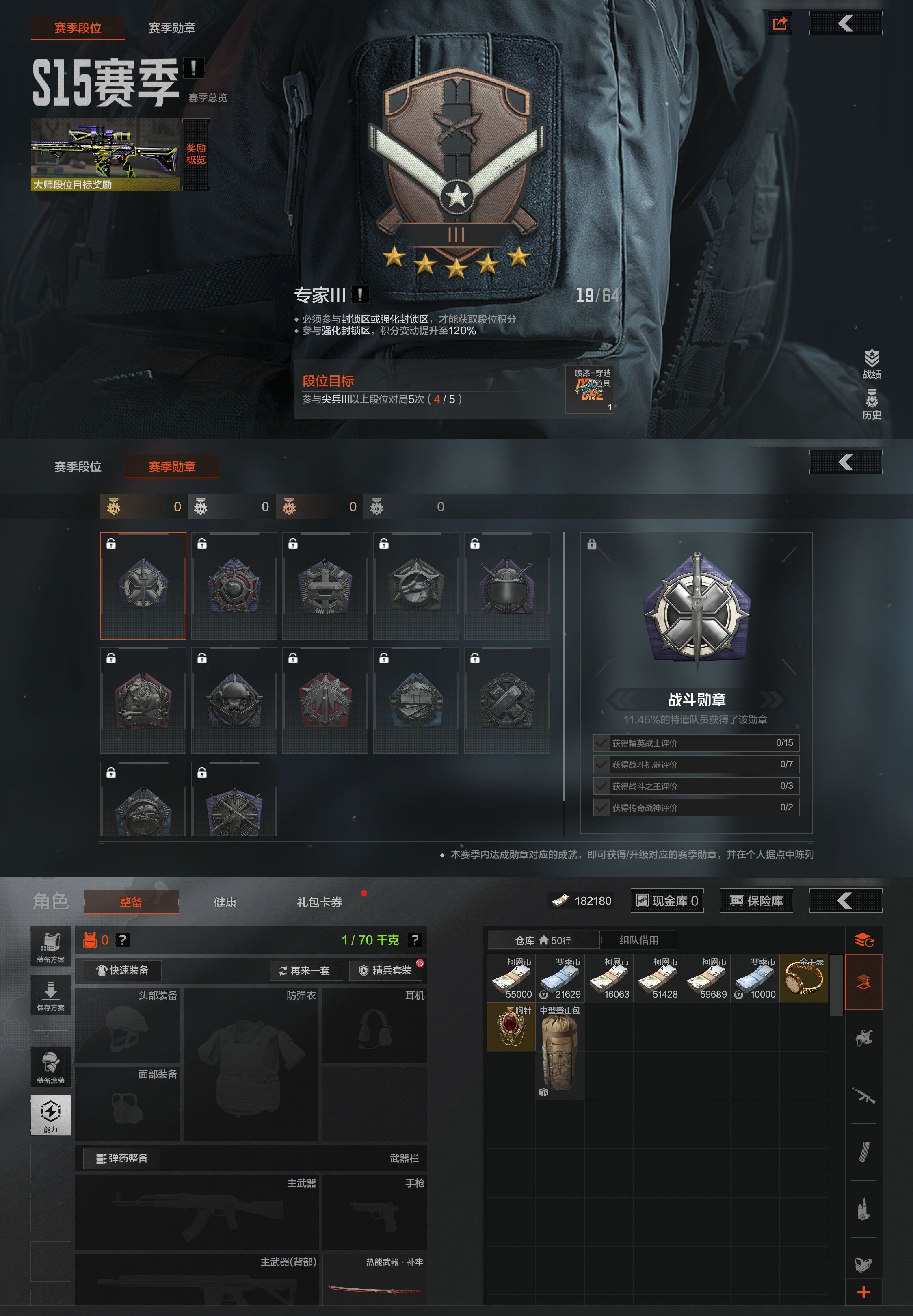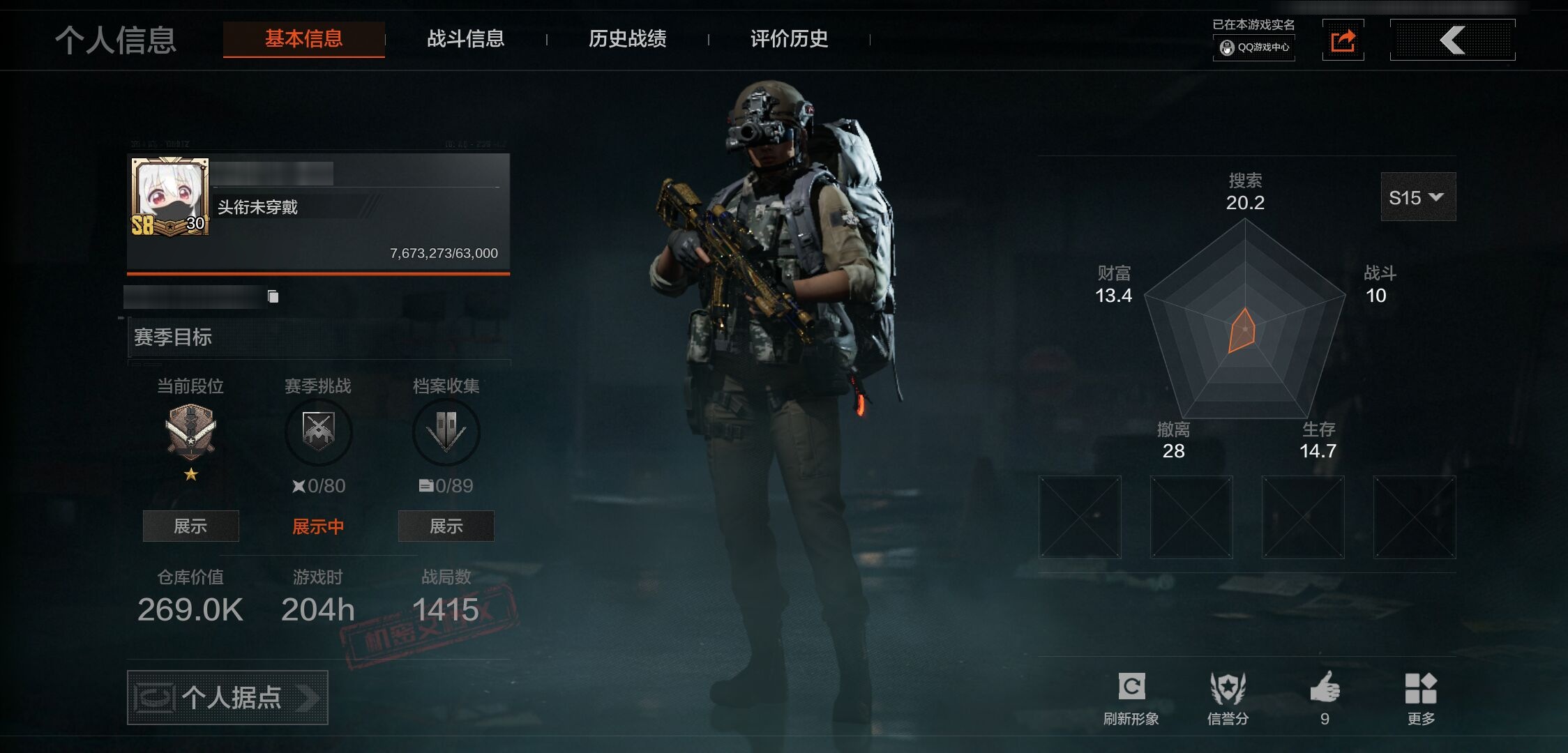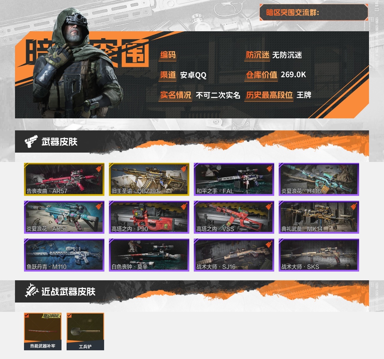 30级,刀皮2,金枪皮2,紫枪皮10,历史最高段位:王牌,