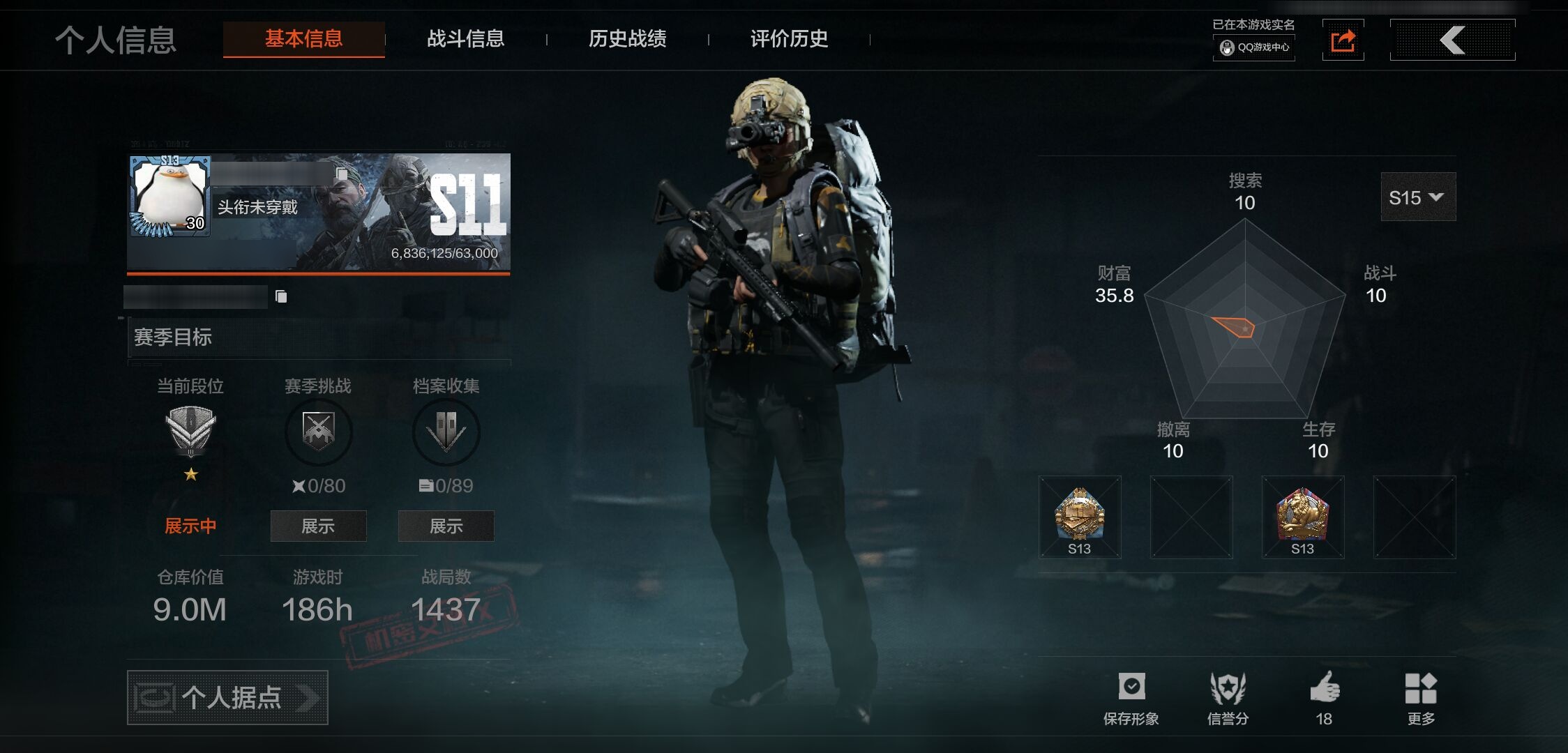 30级,刀皮1,紫枪皮13,历史最高段位:王牌