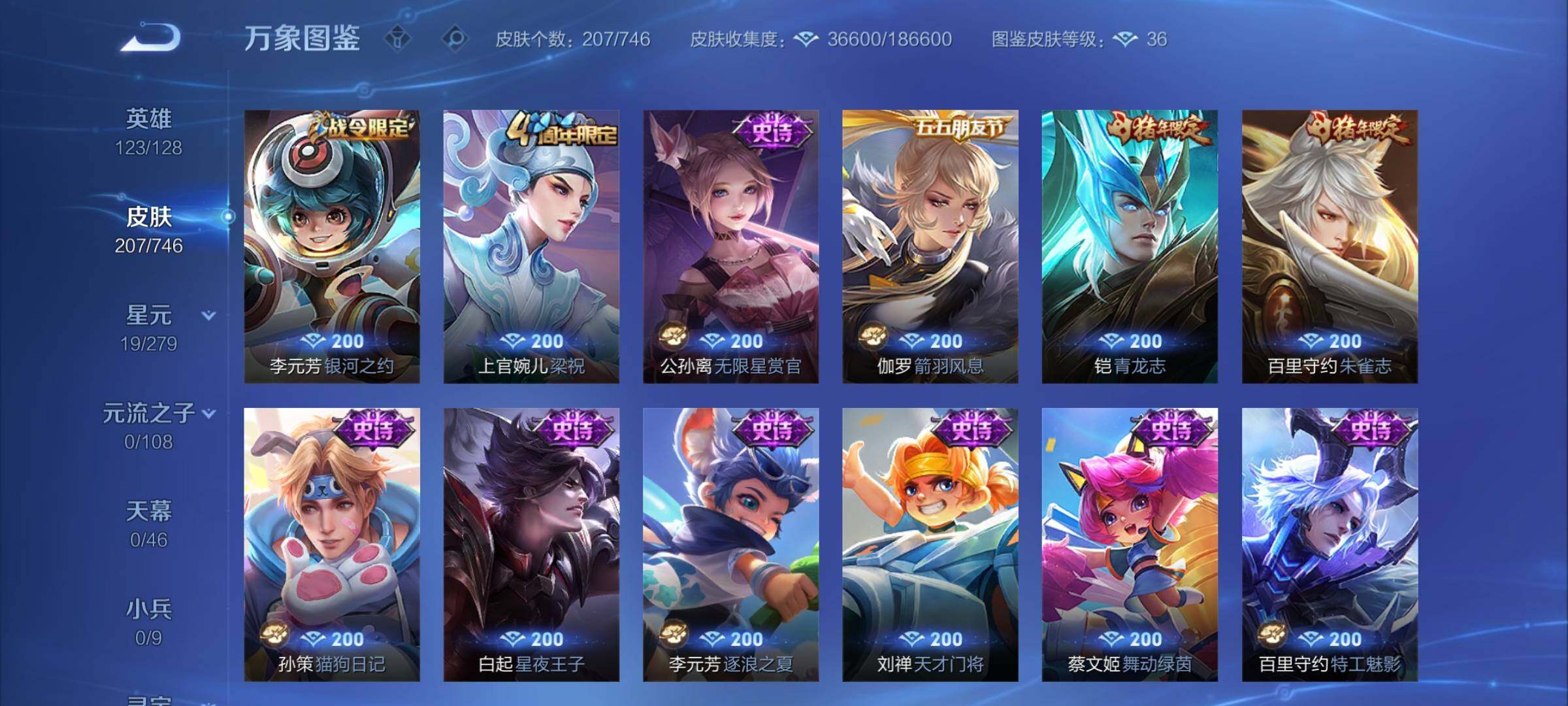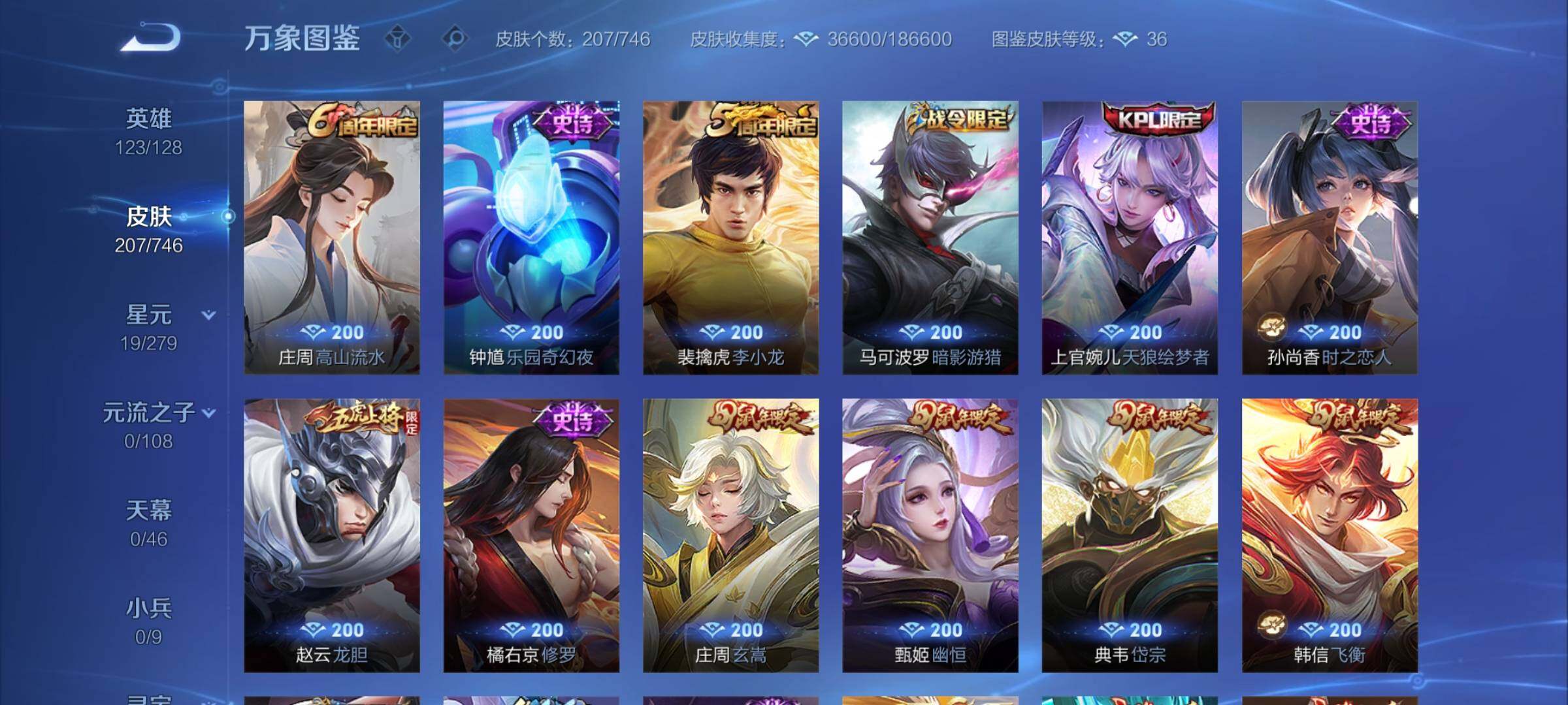安卓Q-123英雄-207皮肤-7王者印记-260铭文-贵族积分11w【贵族9】【5典藏·1无双·1
