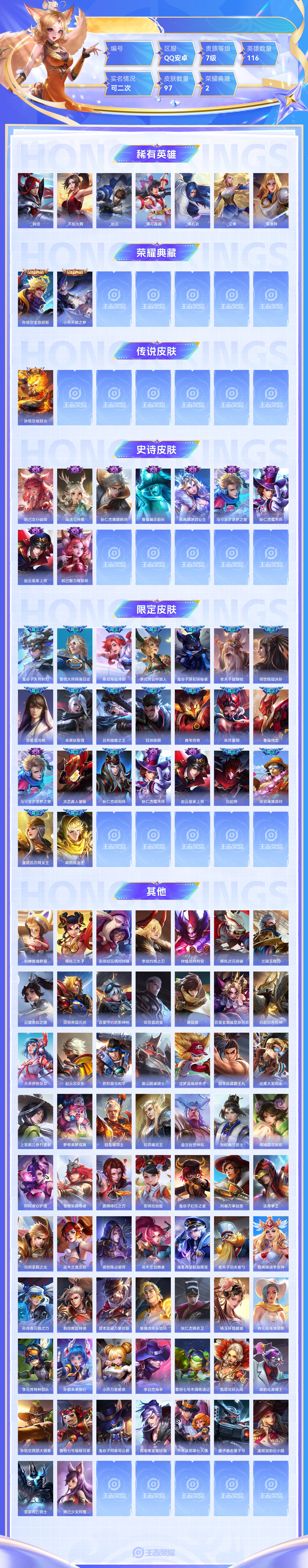 典藏2 传说1 史诗9 限定23 英雄116 皮肤97