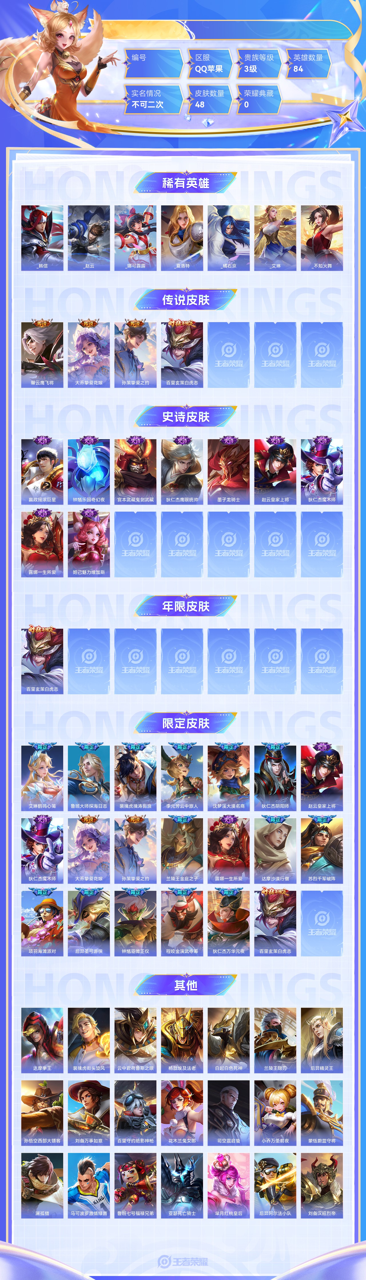 传说4 史诗9 限定20 英雄84 皮肤48