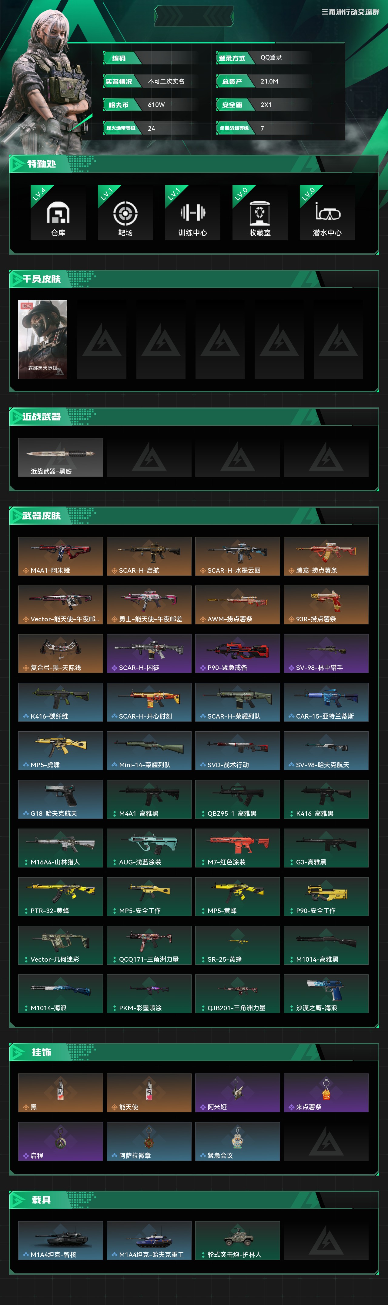 总资产:21.0M,哈夫币:610W,武器皮肤41