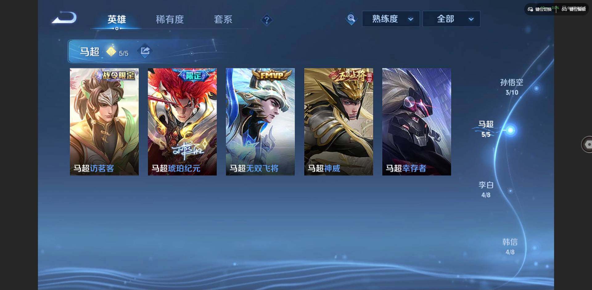 【马超全皮】实名: 可修改 贵族等级: V8 英雄数: 127 皮肤数: 40