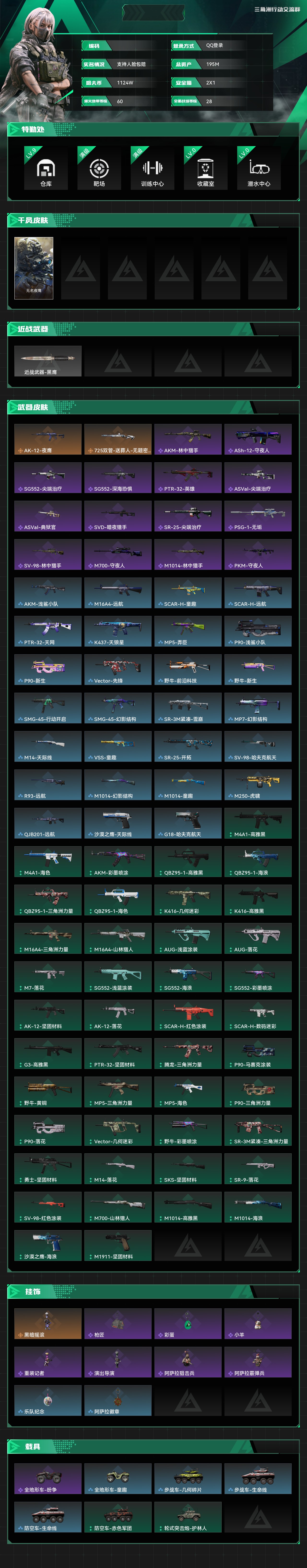 总资产:195M,哈夫币:1124W,武器皮肤87