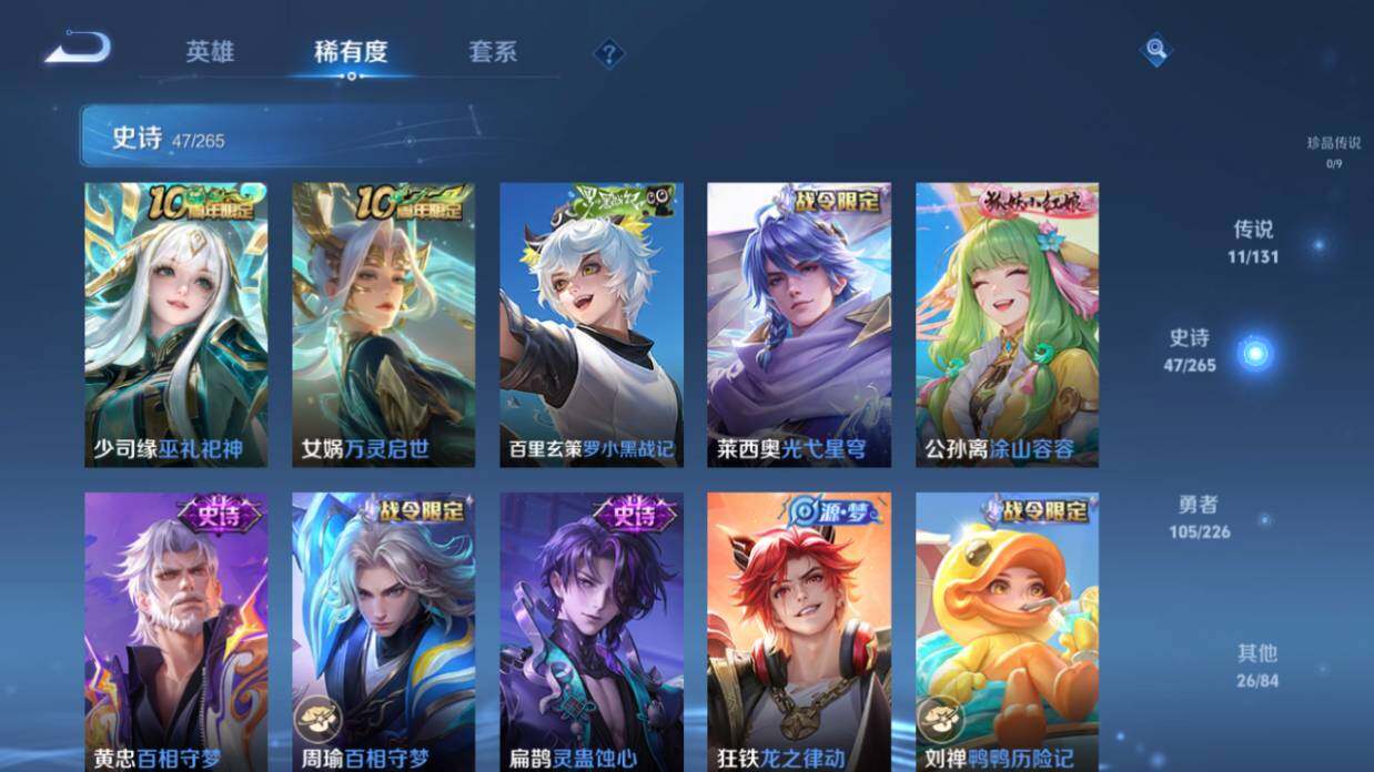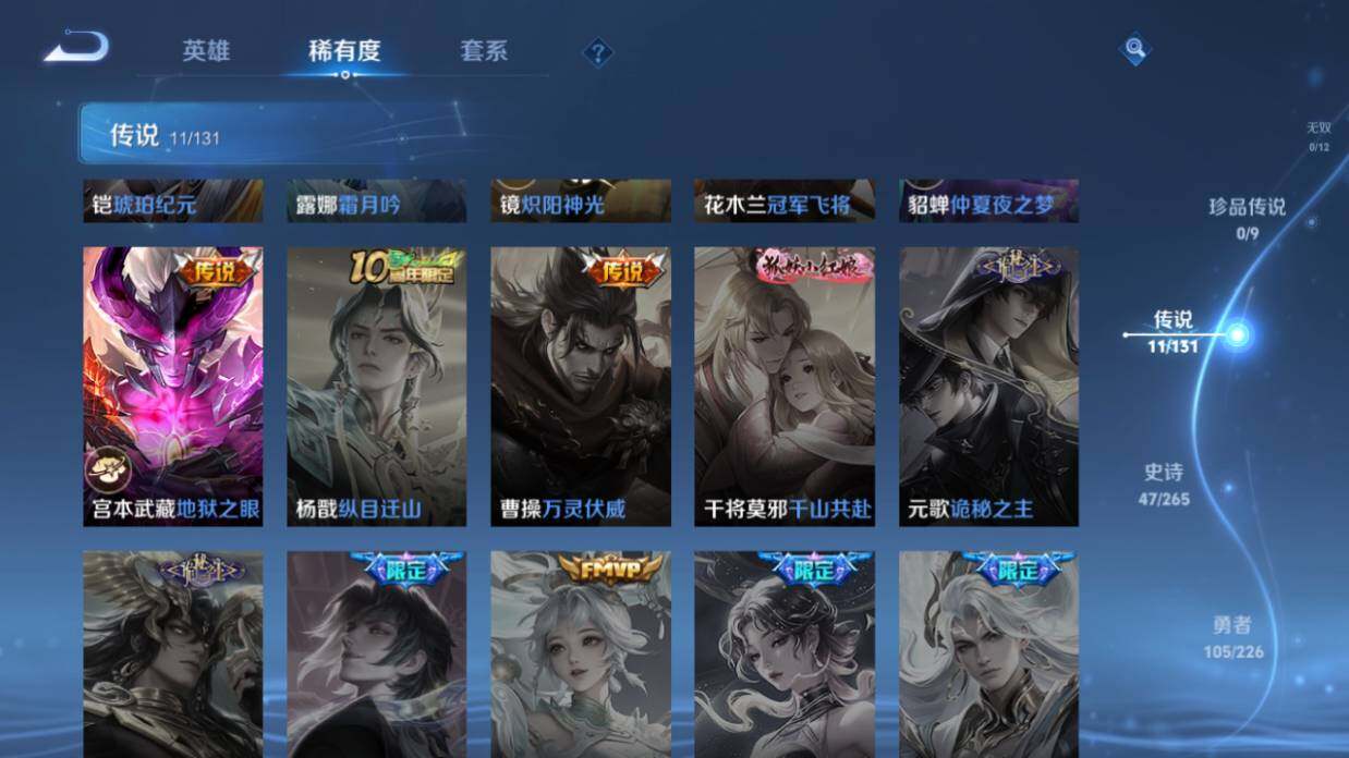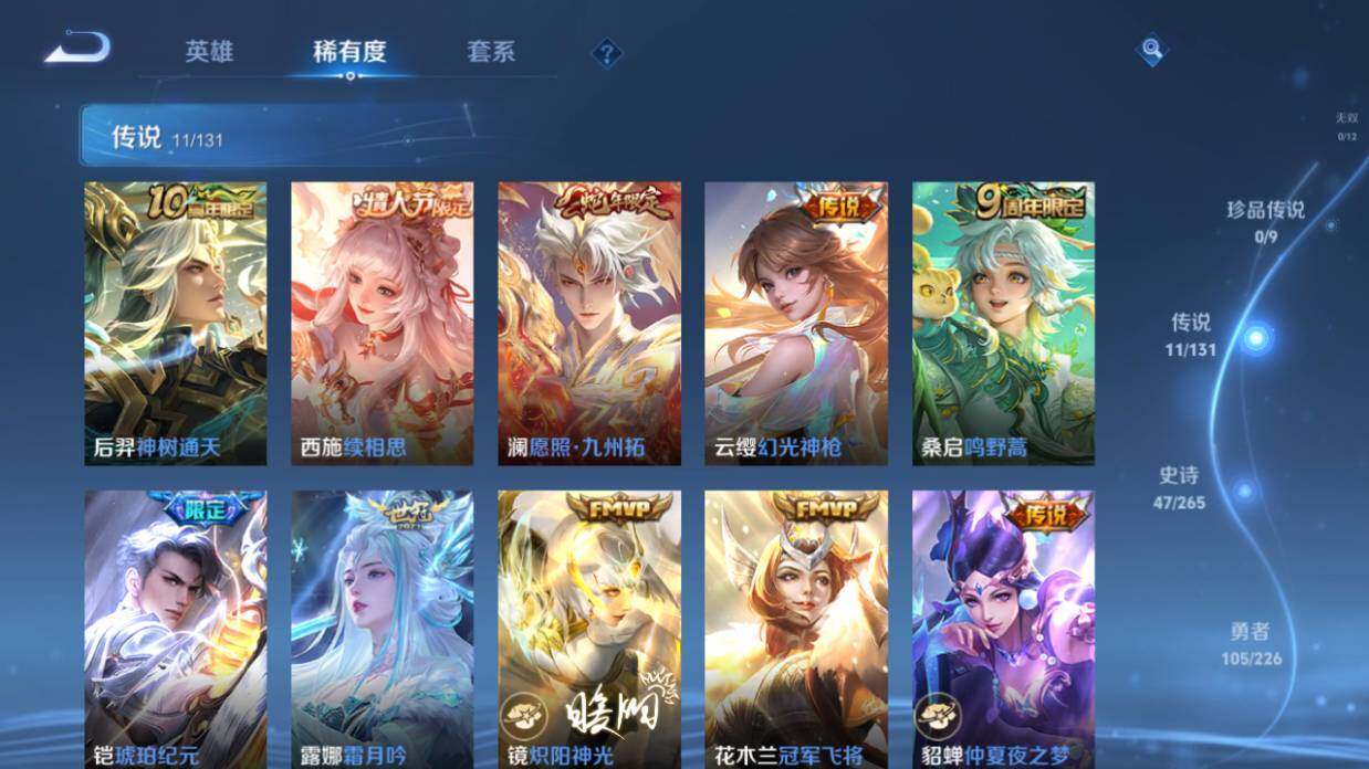 【传说皮肤】:后羿神树通天,西施续相思,澜愿照九州拓,云缨幻光神枪,桑启鸣野蒿,铠琥珀纪元,露娜霜月吟,镜炽阳神光,花木兰冠军飞将,貂蝉仲夏夜之梦,宫本武藏地狱之眼