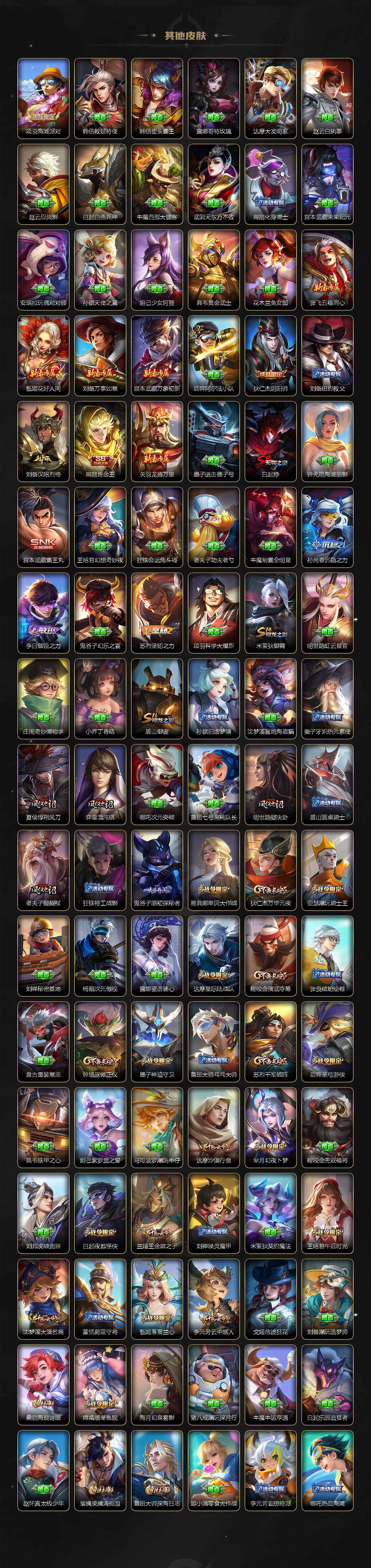【传说皮肤】:云缨幻光神枪,桑启鸣野蒿,孙悟空齐天大圣,李信山海炽霜斩,马超无双飞将,露娜启示之音,裴擒虎寅虎赤拳,孙尚香异界灵契,貂蝉遇见胡旋,赵云淬星耀世,曜李逍遥 ,诸