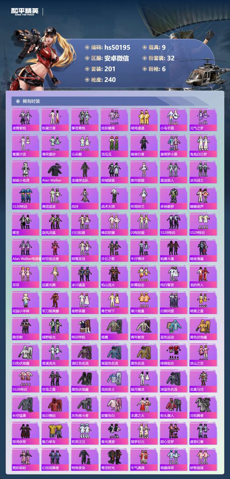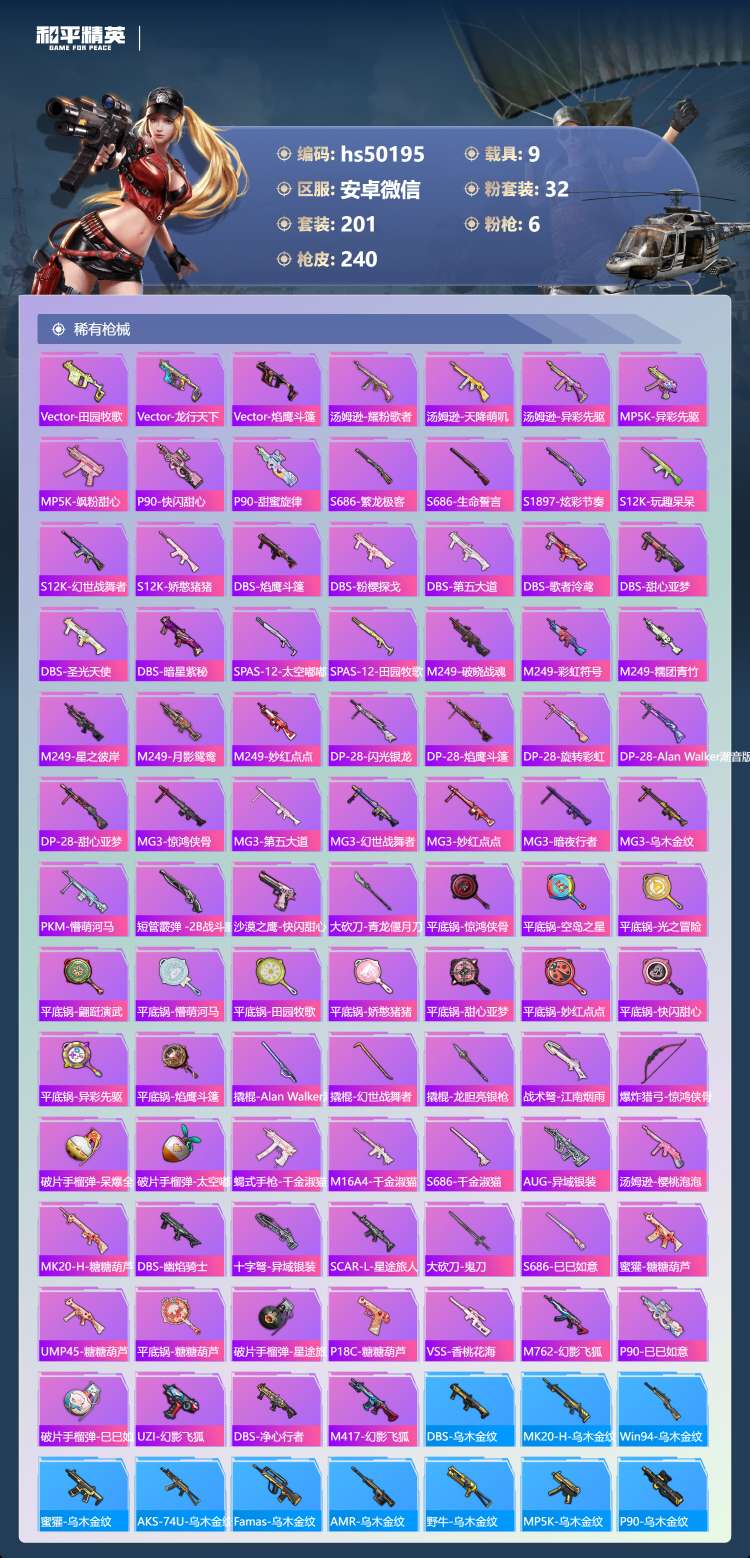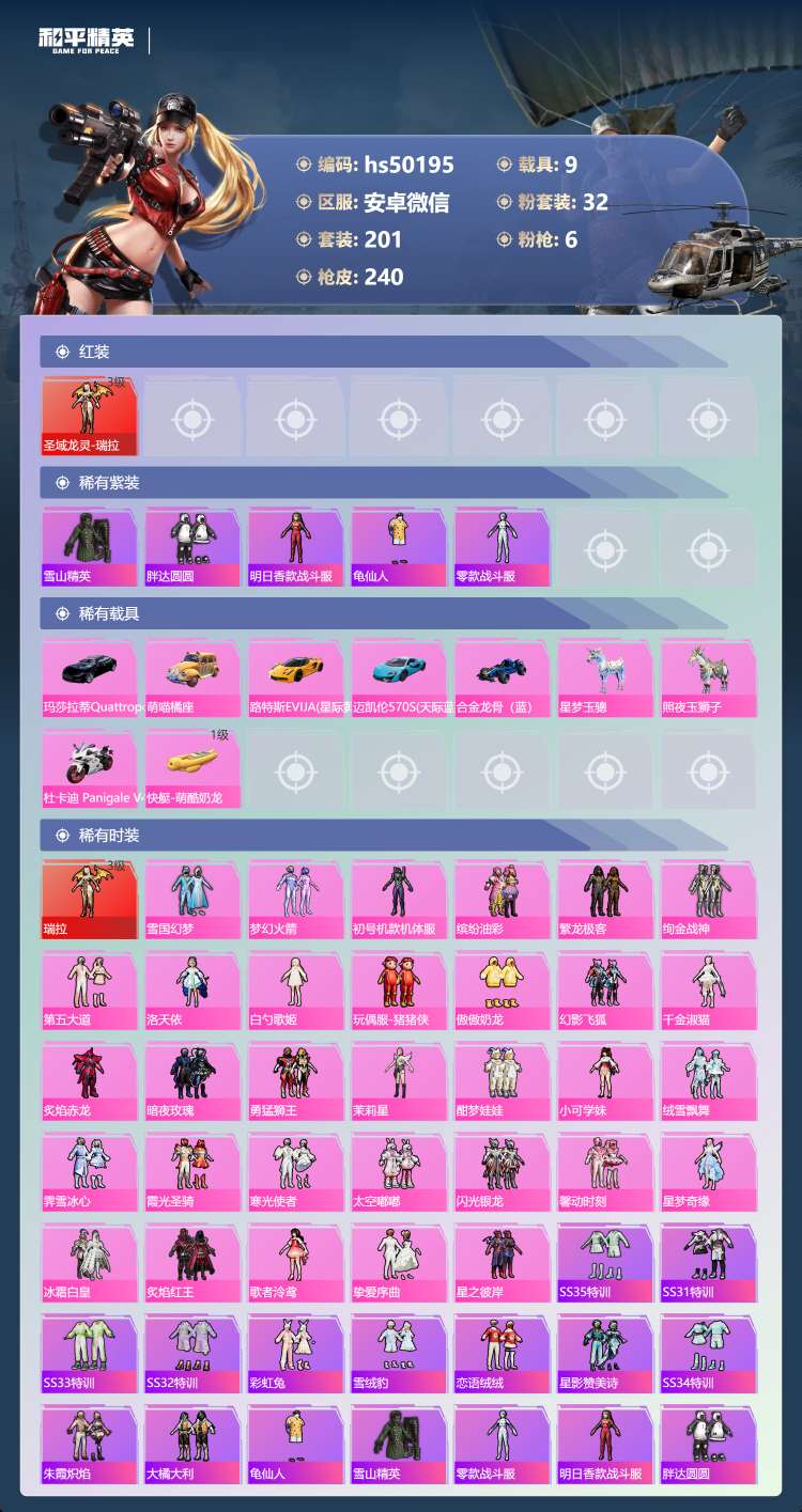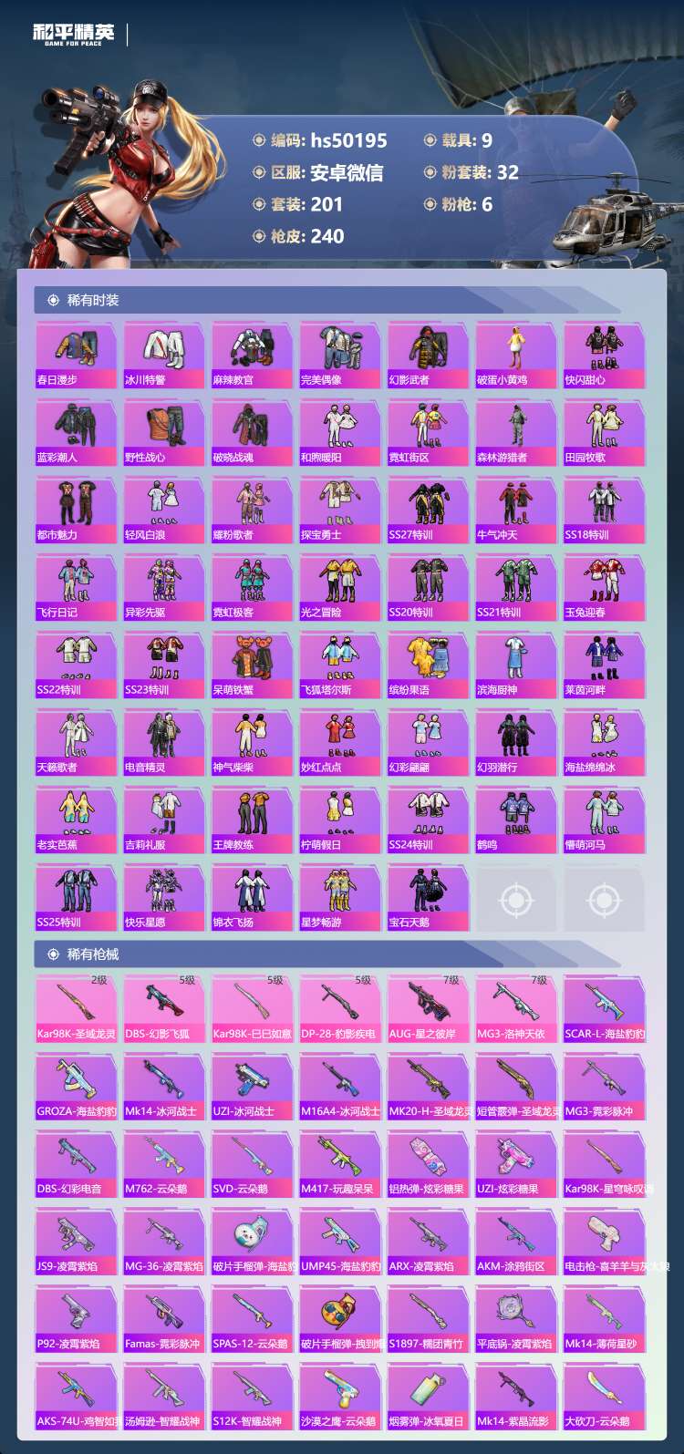 hs50195 安卓微-14王牌印记-1红装-32粉装-6特效枪-9载具-99119热力值-201