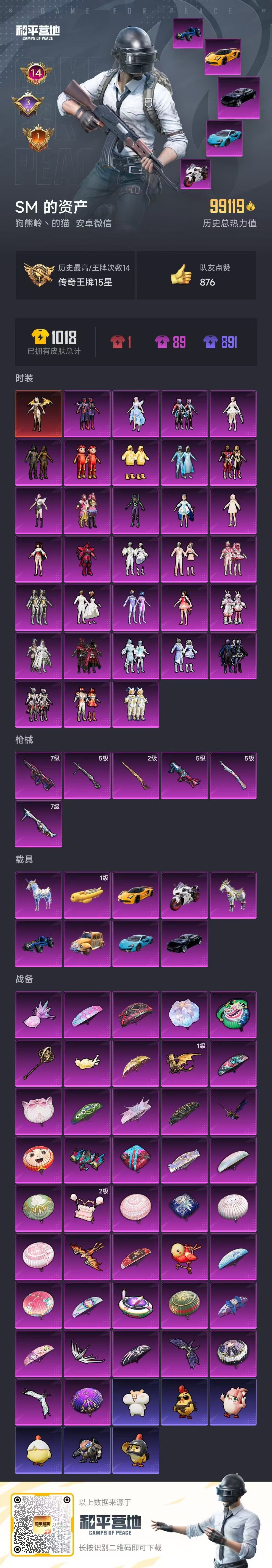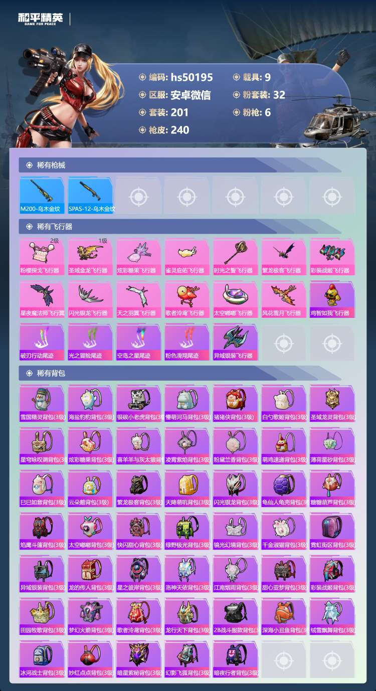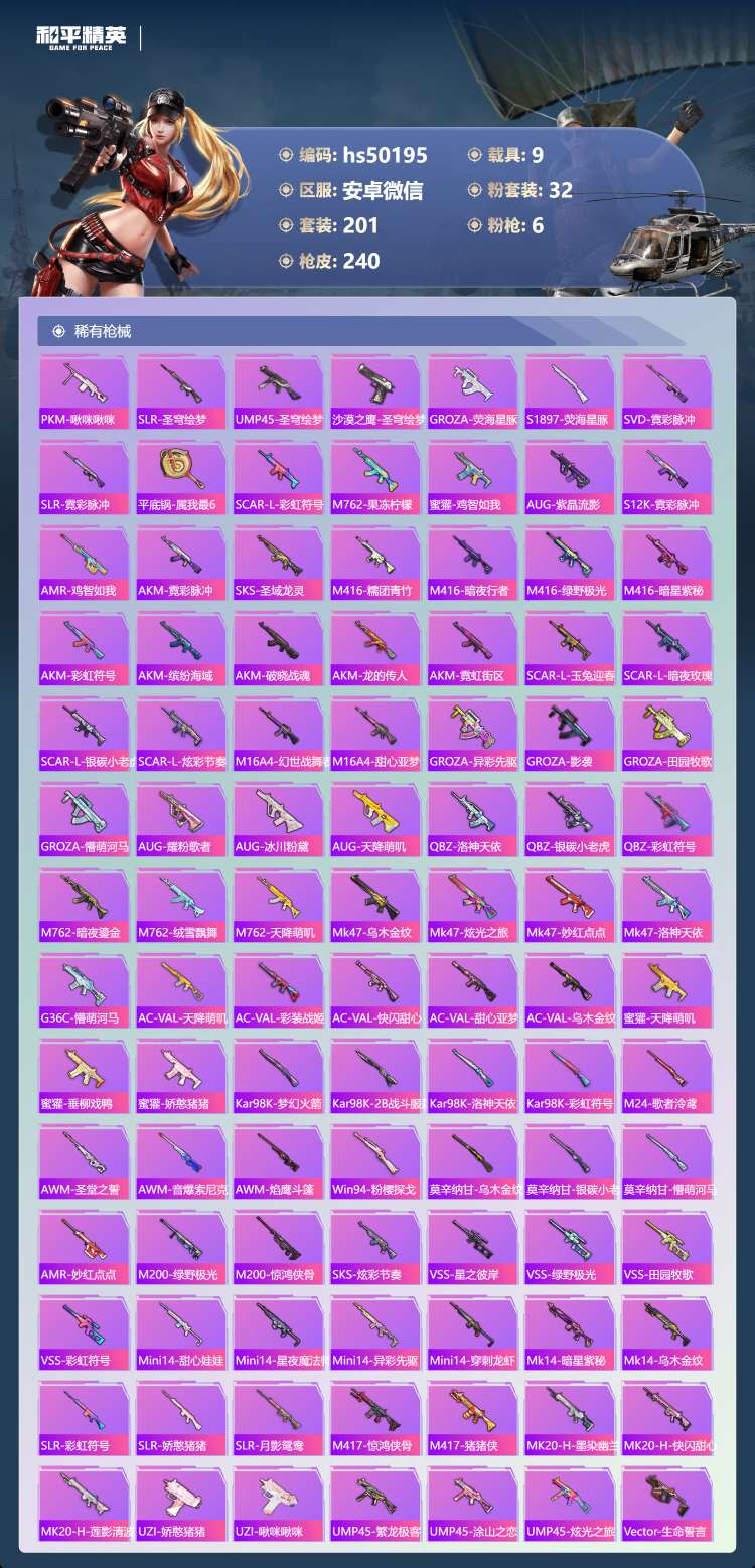 hs50195 安卓微-14王牌印记-1红装-32粉装-6特效枪-9载具-99119热力值-201