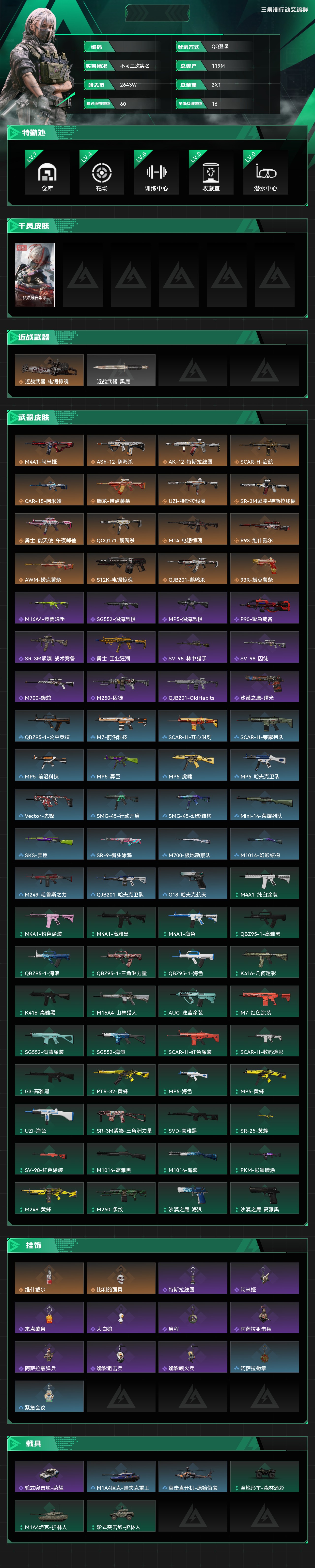 总资产:119M,哈夫币:2643W,武器皮肤82;烽火