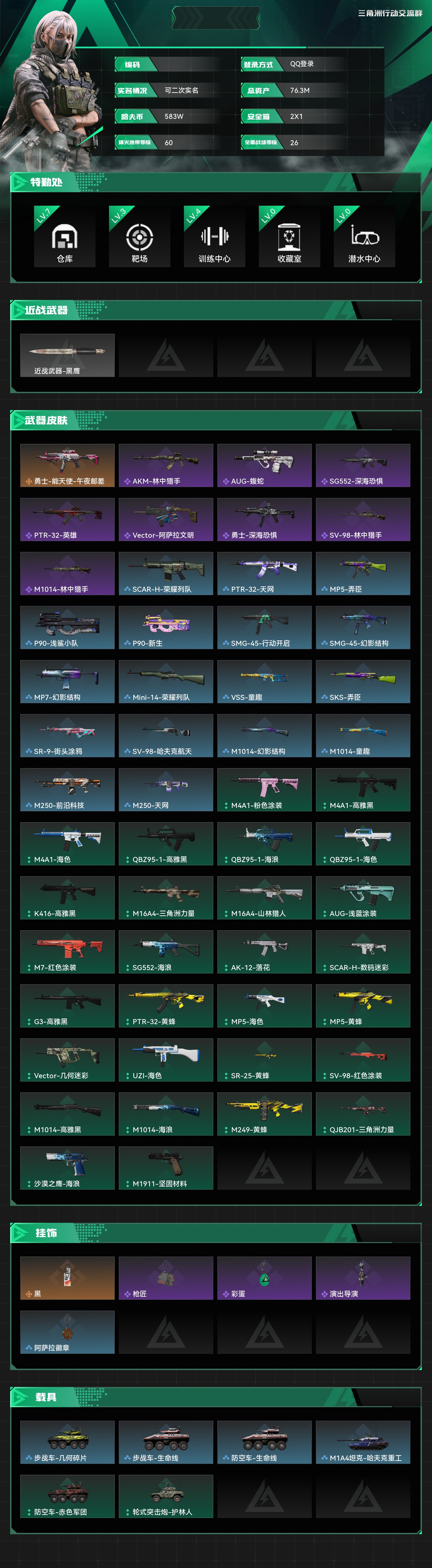 总资产:76.3M,哈夫币:583W,武器皮肤55;烽火