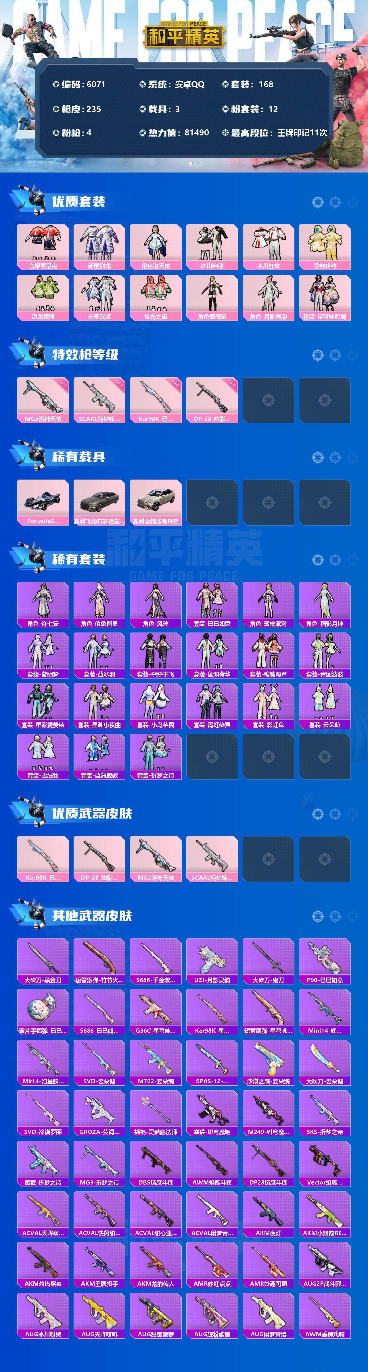 【6071】12粉装-4特效枪-3载具-81490热力值-11印记-168套装-235枪皮