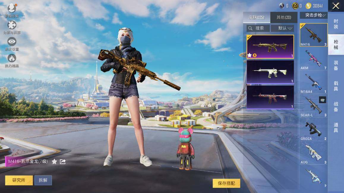 【粉色枪皮等级】:AKM-炫紫旋律(五级),M416-五爪金龙(七级),Kar98K-巳巳如意(五级),PKM-江南烟雨(七级)