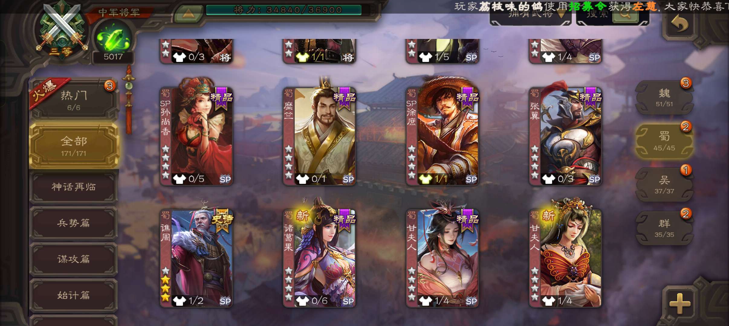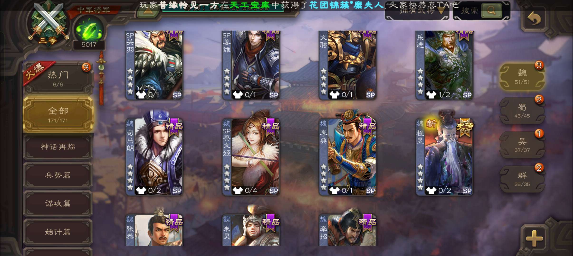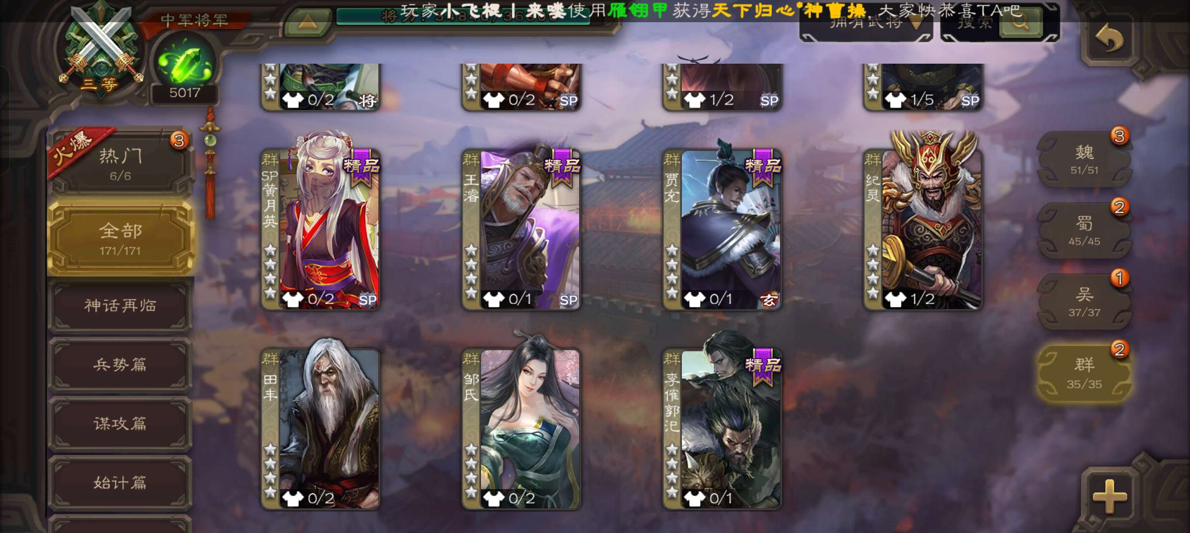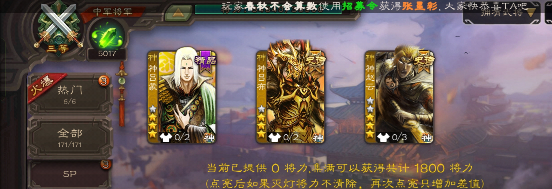 6史诗中军,7.5万羽毛5千将魂,神赵云神吕布界钟会界于禁谯周程昱,神吕蒙甘夫人谋高顺171将