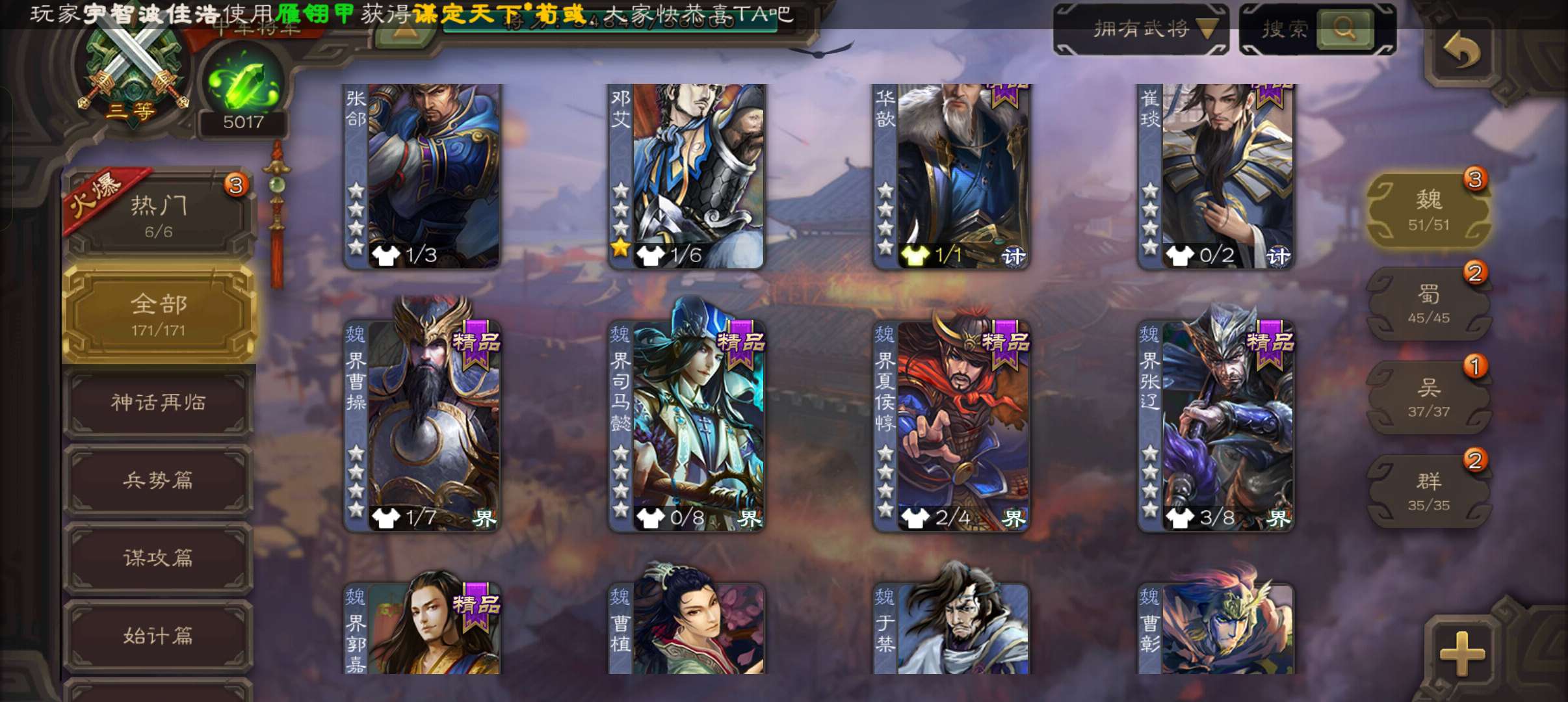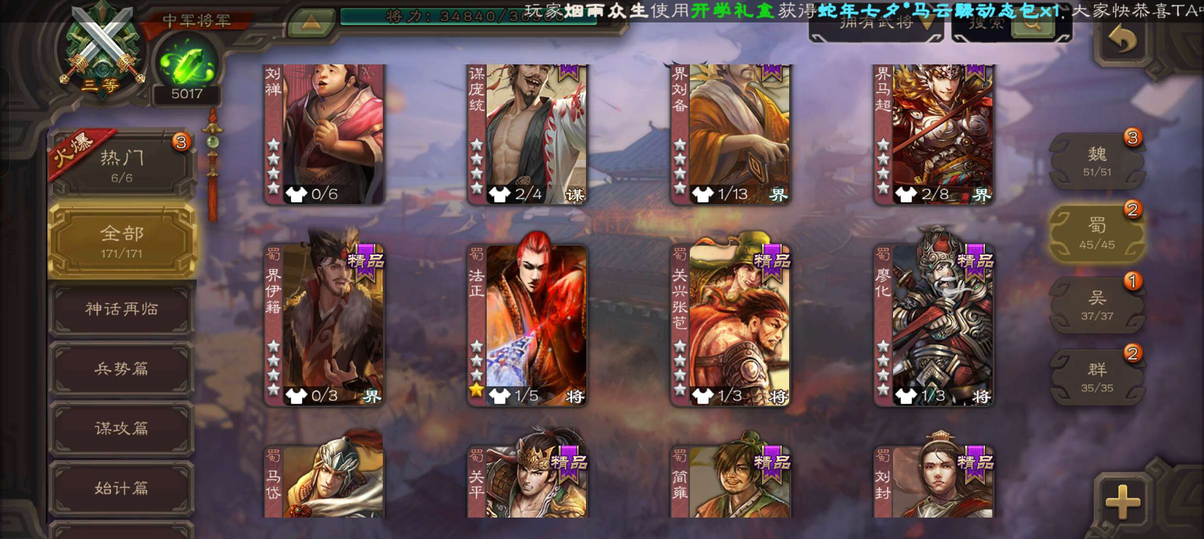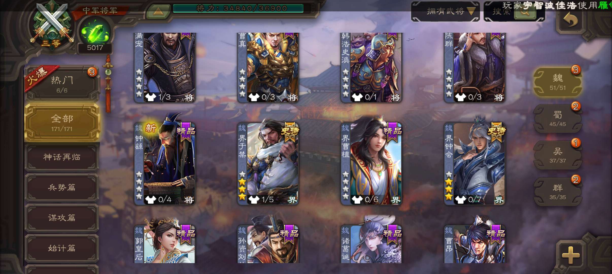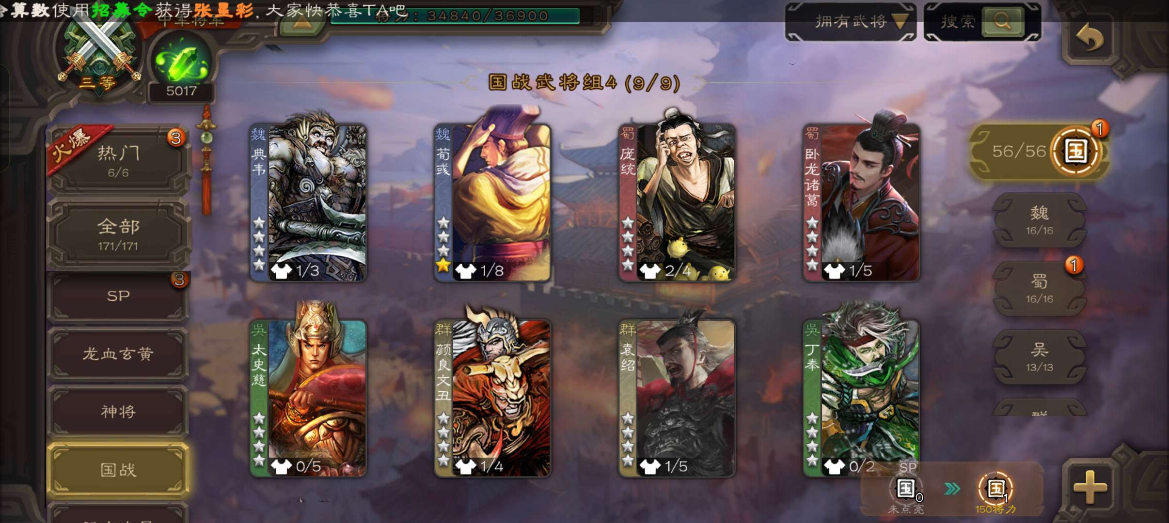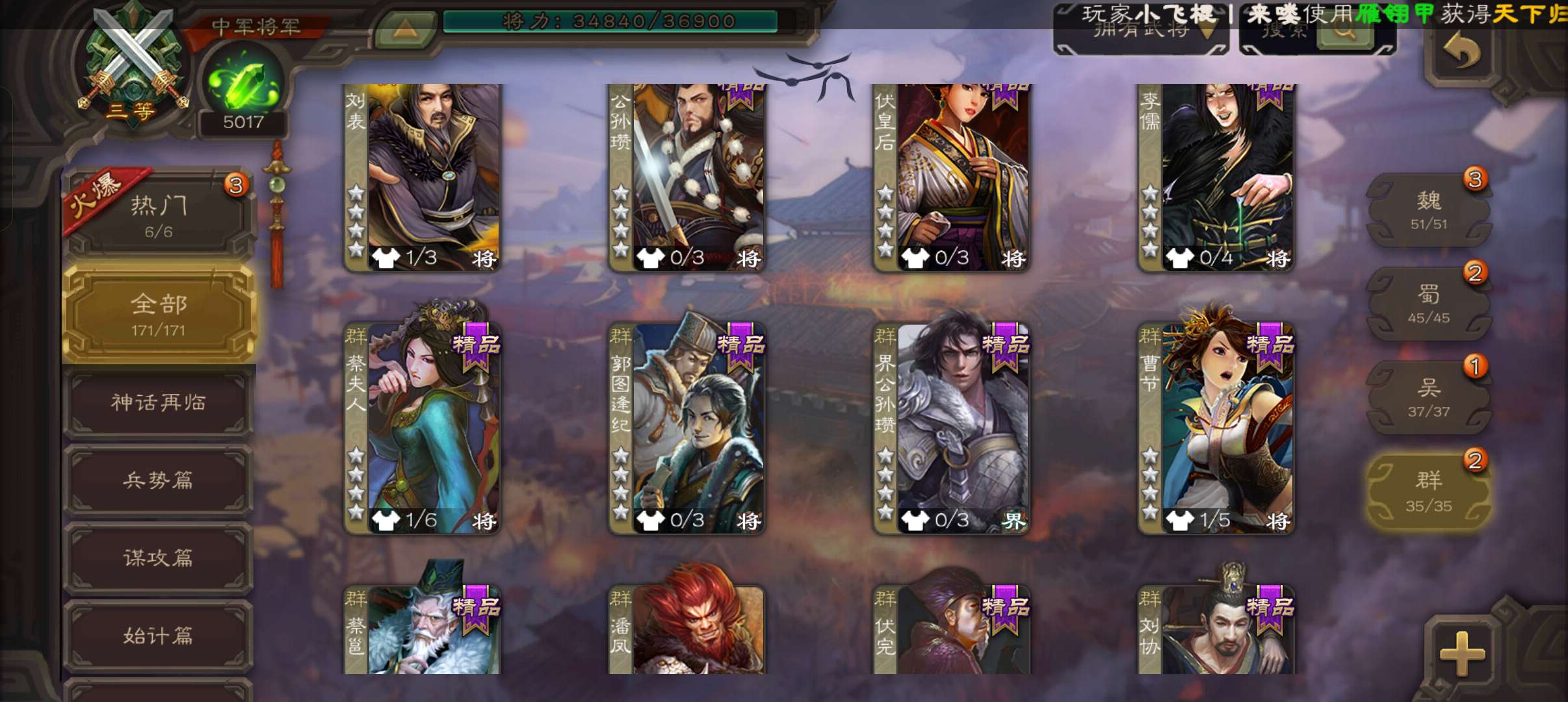6史诗中军,7.5万羽毛5千将魂,神赵云神吕布界钟会界于禁谯周程昱,神吕蒙甘夫人谋高顺171将