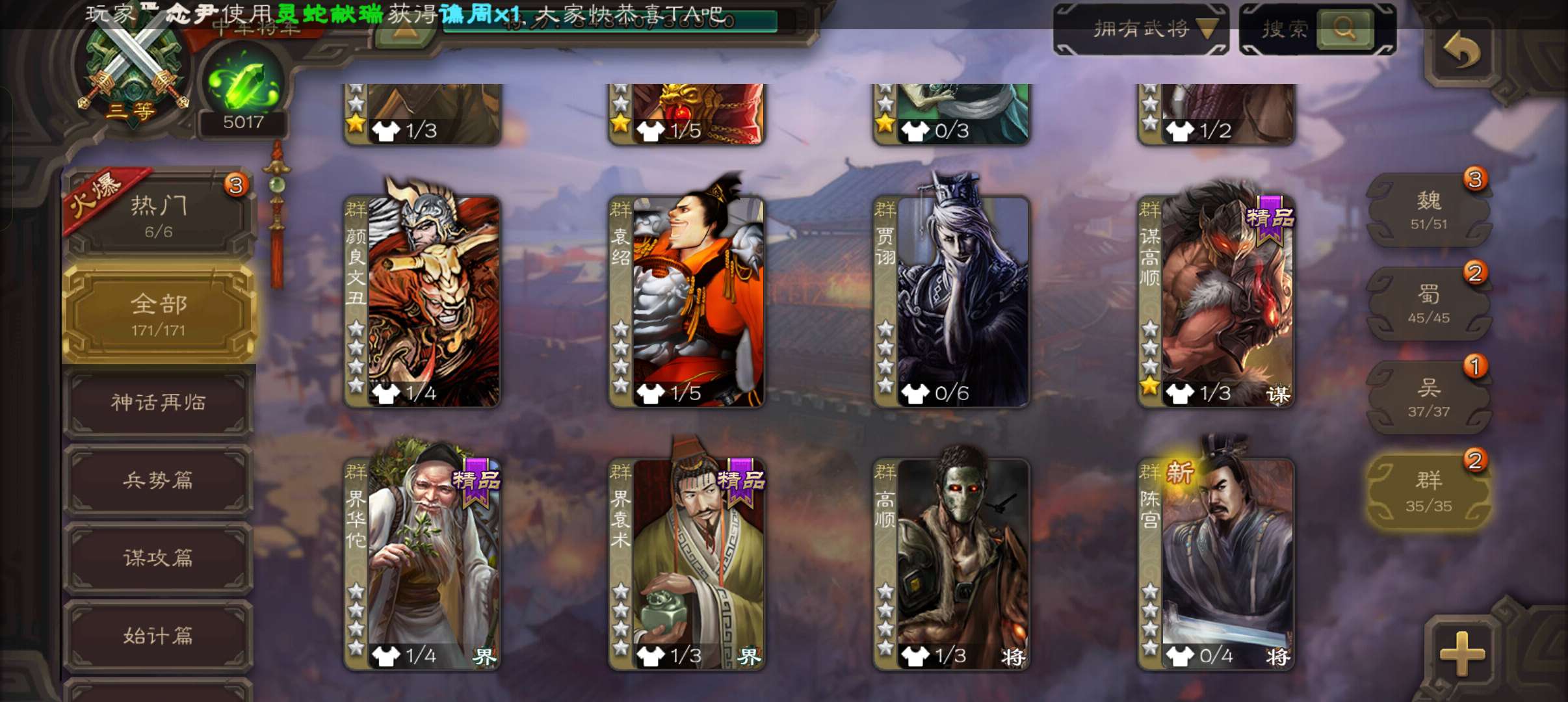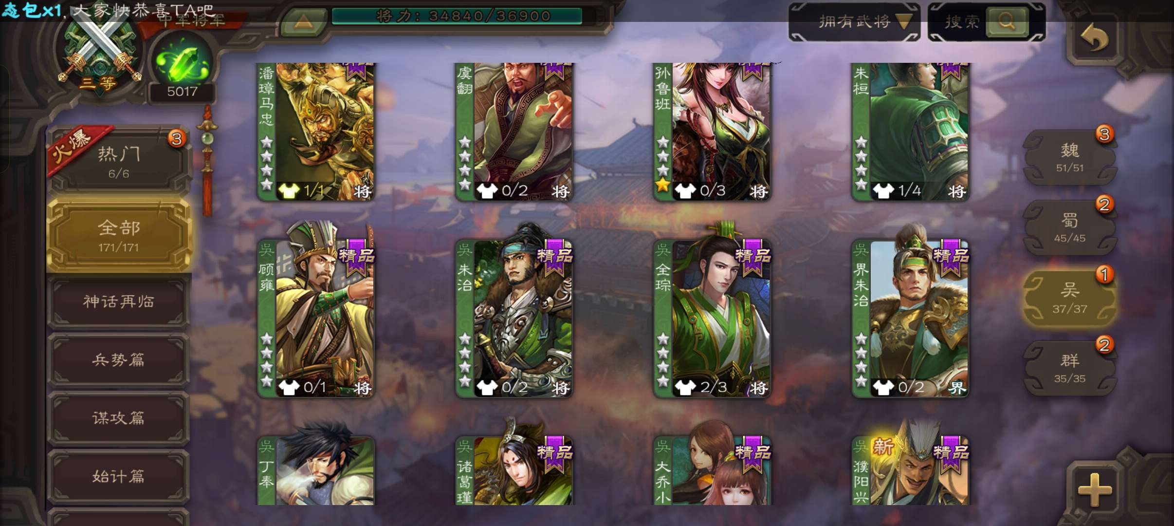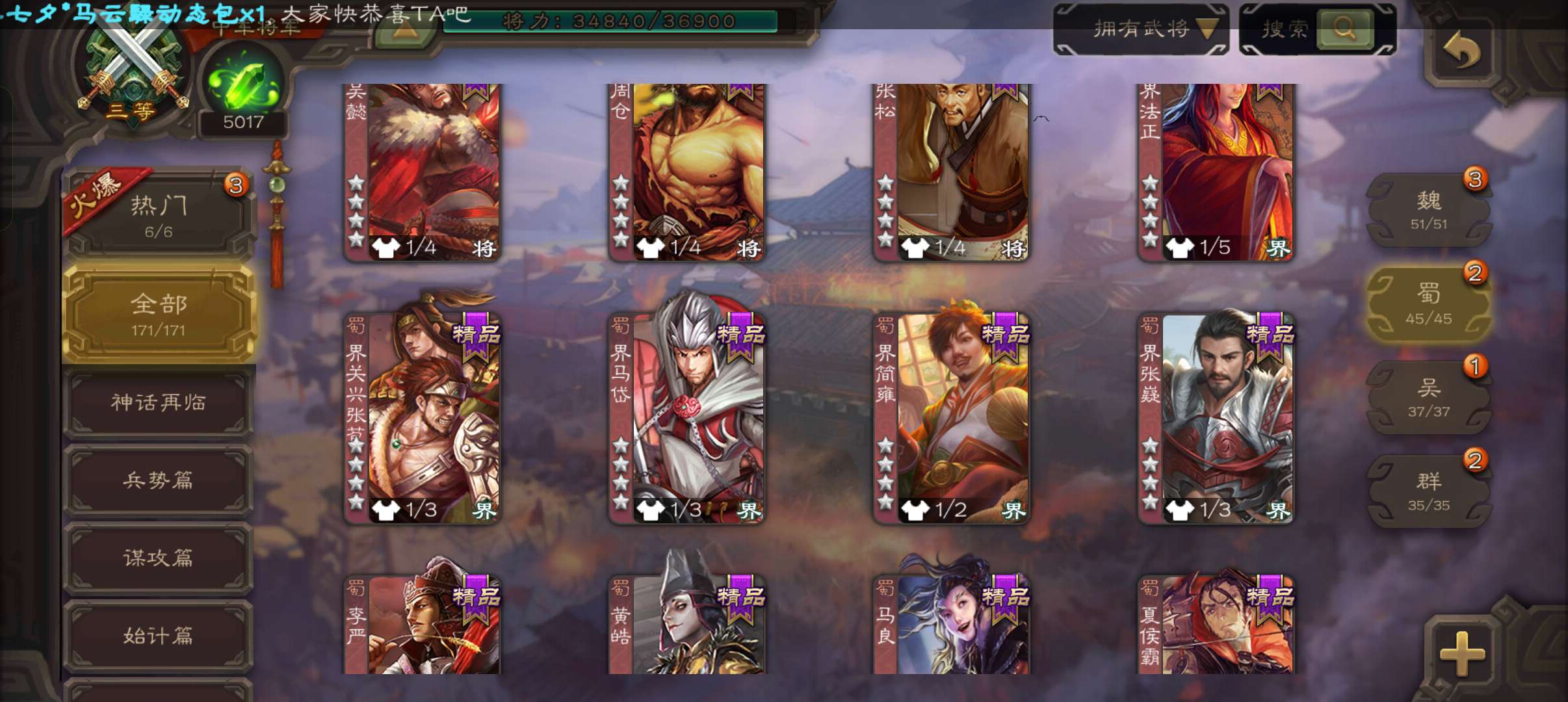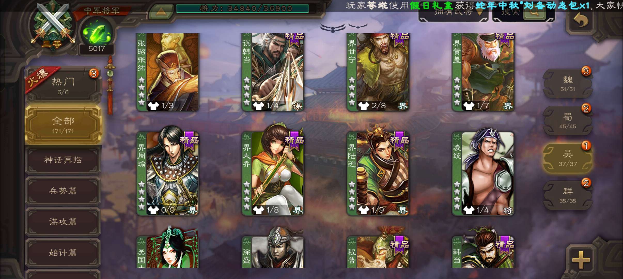 6史诗中军,7.5万羽毛5千将魂,神赵云神吕布界钟会界于禁谯周程昱,神吕蒙甘夫人谋高顺171将