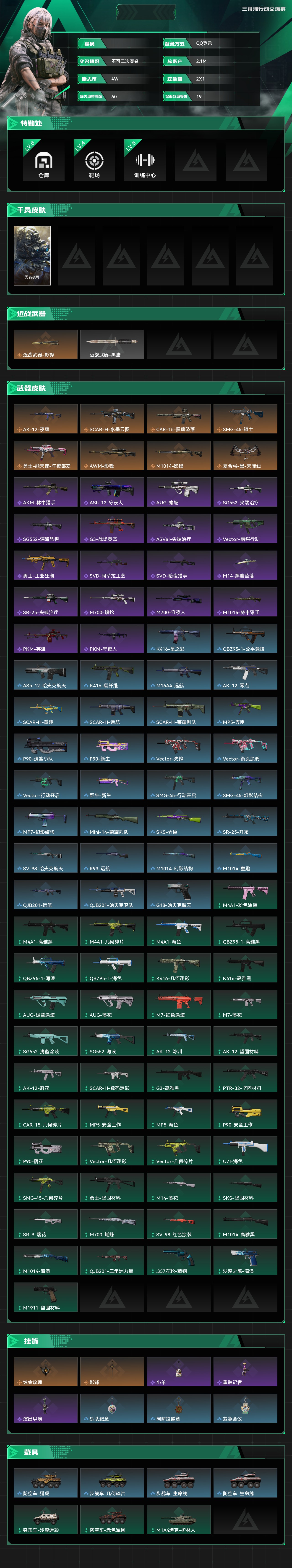 总资产:2.1M,哈夫币:4W,武器皮肤99;烽火60级