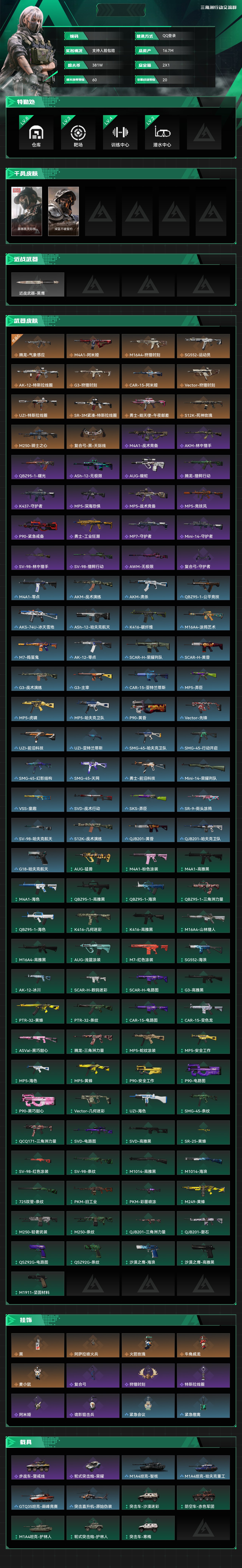 总资产:16.7M,哈夫币:381W,武器皮肤126;