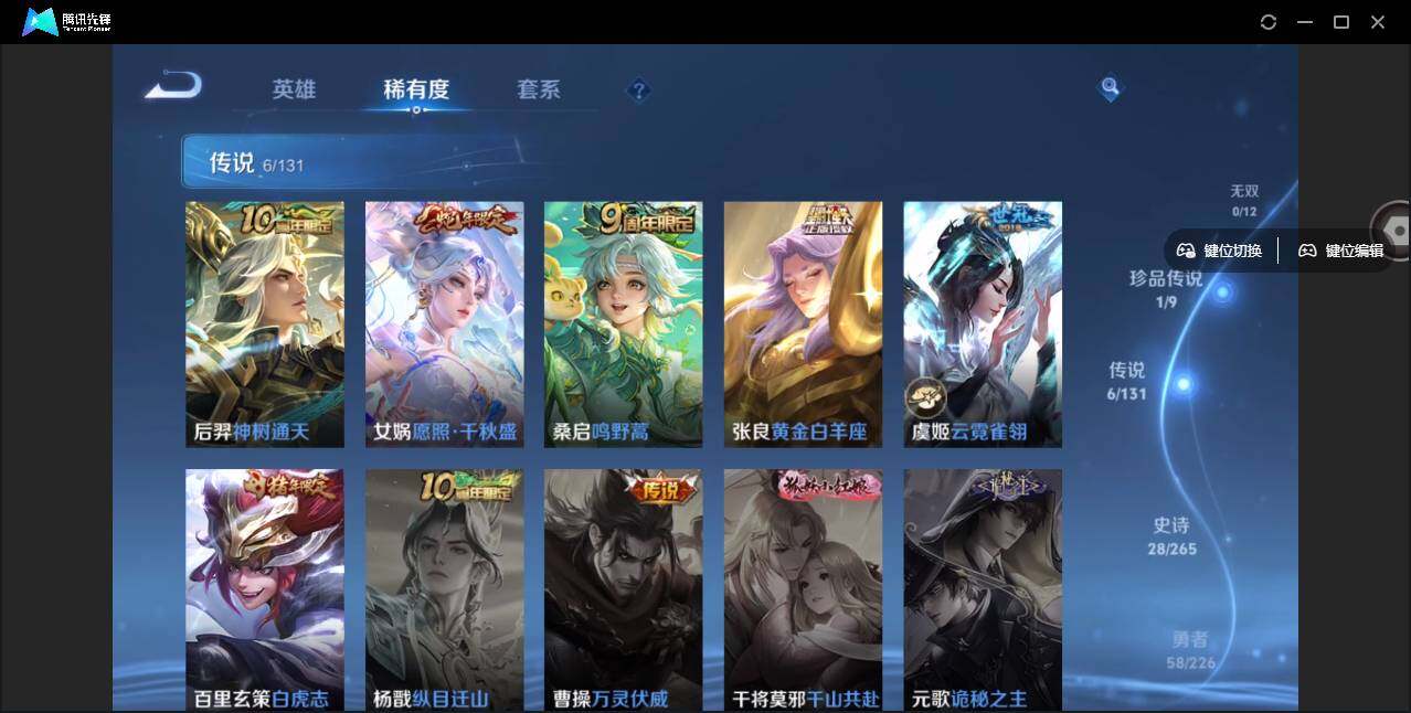 【传说皮肤】:后羿神树通天,女娲愿照千秋盛,桑启鸣野蒿,张良黄金白羊座,虞姬云霓雀翎,百里玄策白虎志