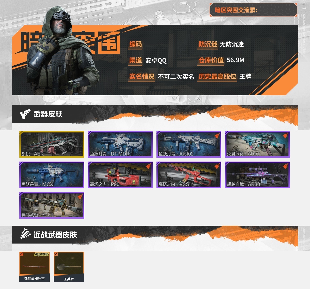 30级,刀皮2,金枪皮1,紫枪皮8,历史最高段位:王牌