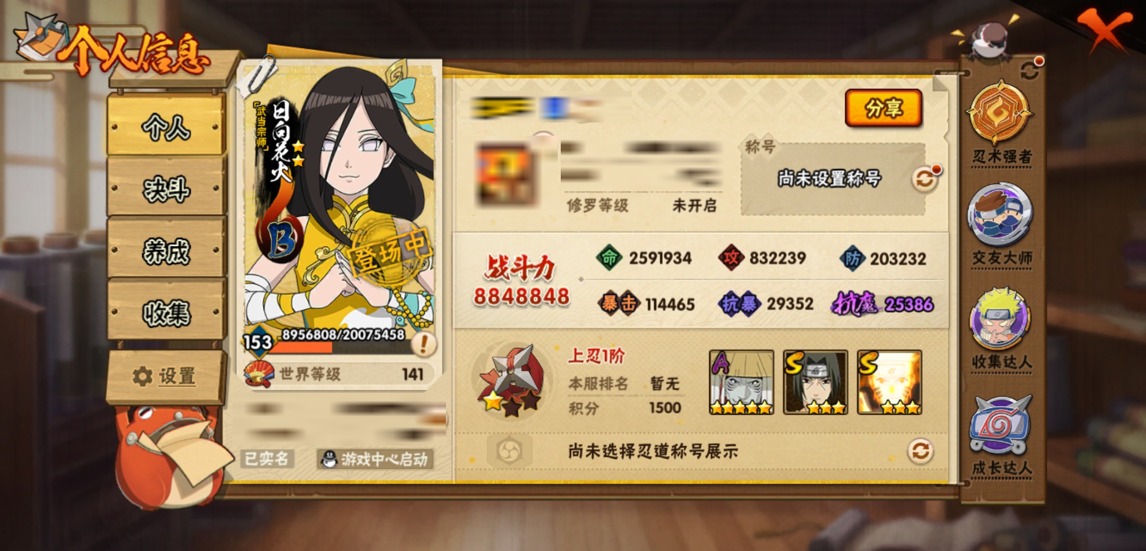 战斗力:884W+;段位:上忍1阶;本服排名:410;