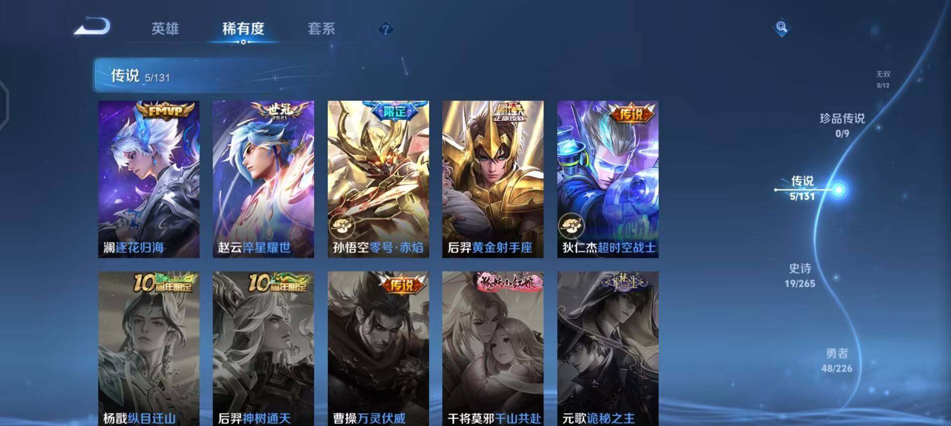 【传说皮肤】:澜逐花归海,赵云淬星耀世,孙悟空零号赤焰,后羿黄金射手座,狄仁杰超时空战士