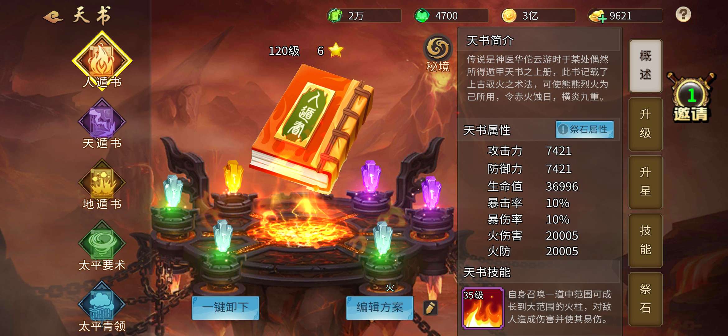 符石四攻一命,四闪一防,战旗8个四攻,天书3个6星俩5星,其他的自己看吧!