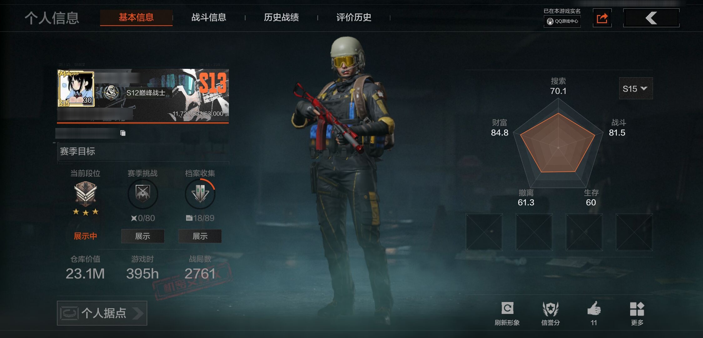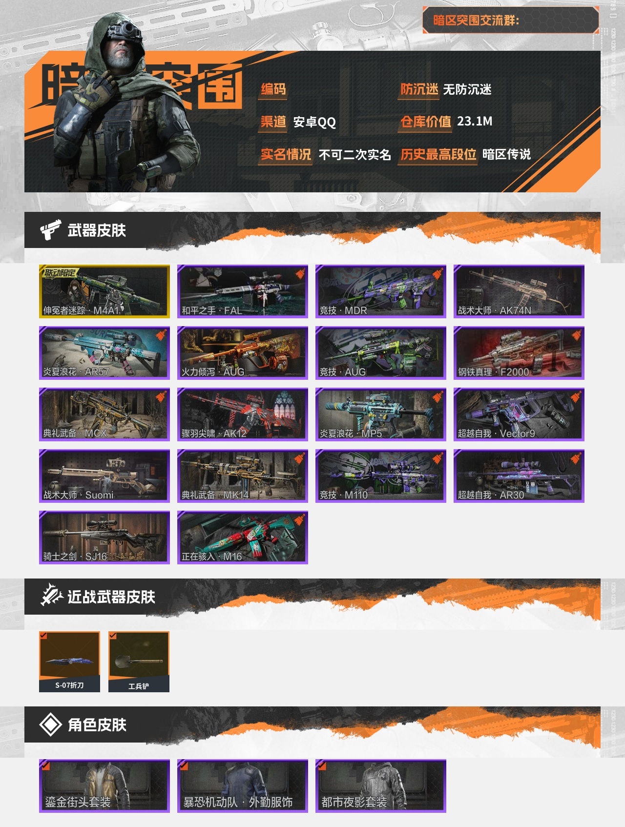 30级,刀皮2,金枪皮1,紫枪皮17,历史最高段位:暗区传