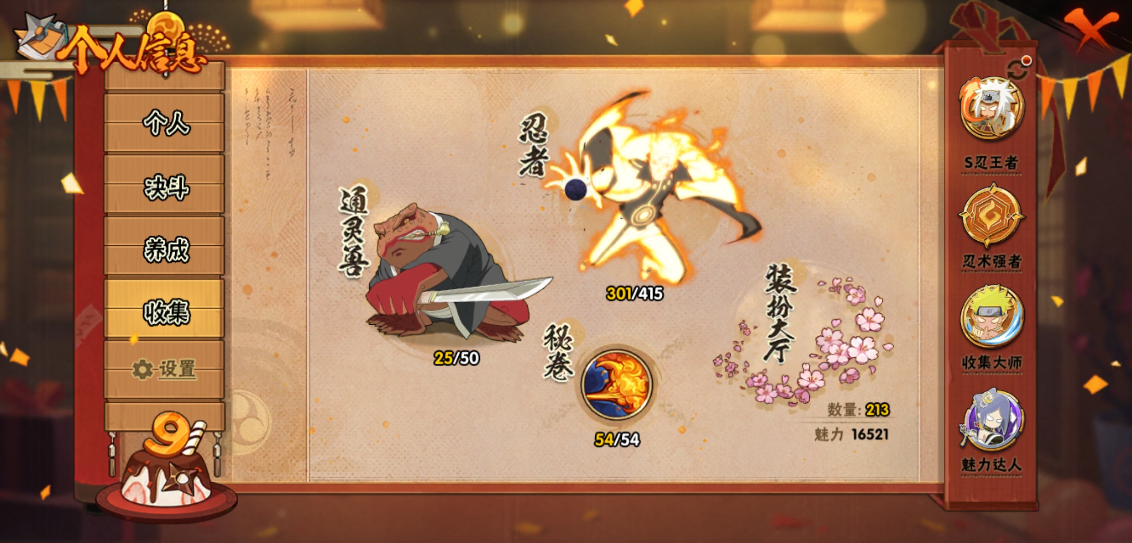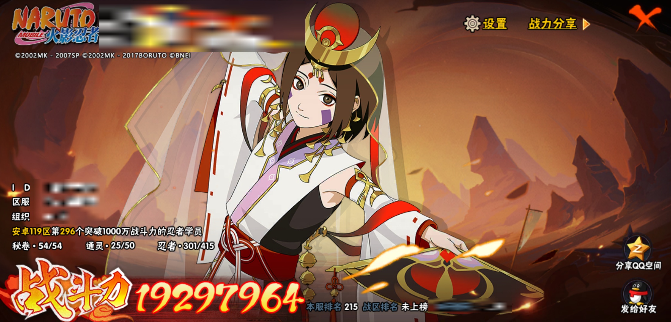 战斗力:1929W+;段位:中忍2阶;本服排名:215