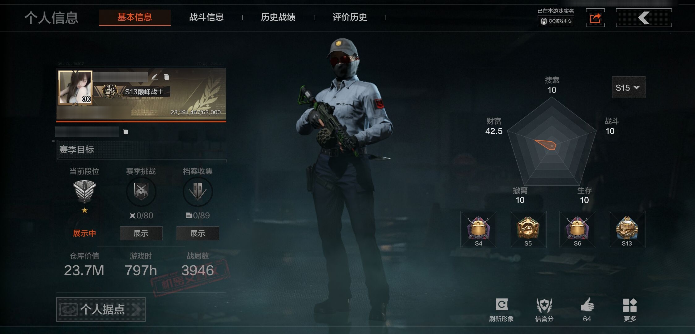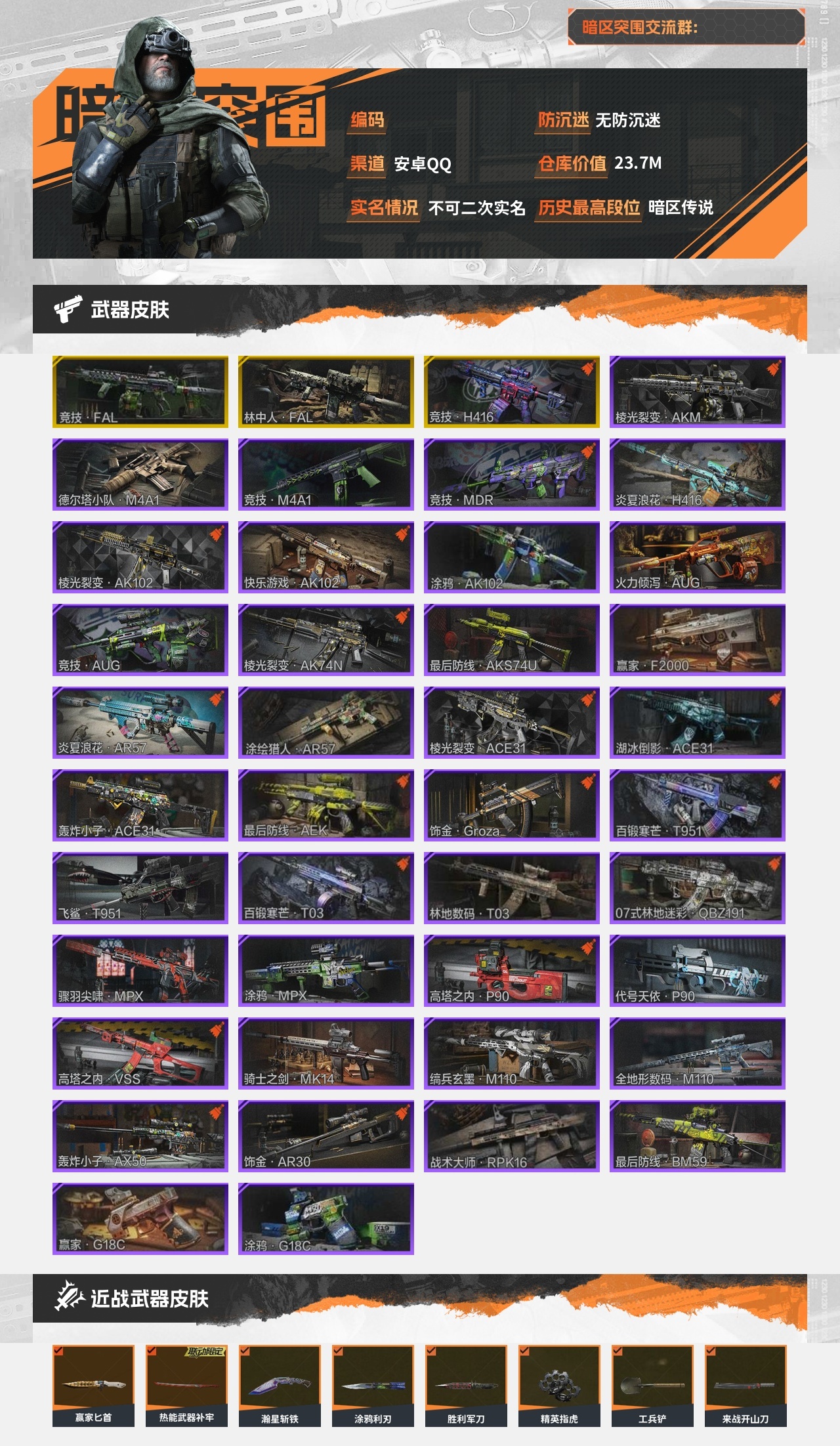 30级,刀皮8,金枪皮3,紫枪皮39,历史最高段位:暗区传